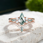 Kite Cut Green Moss Agate Three Stone Engagement Bridal Set 2pcs - Rebecca