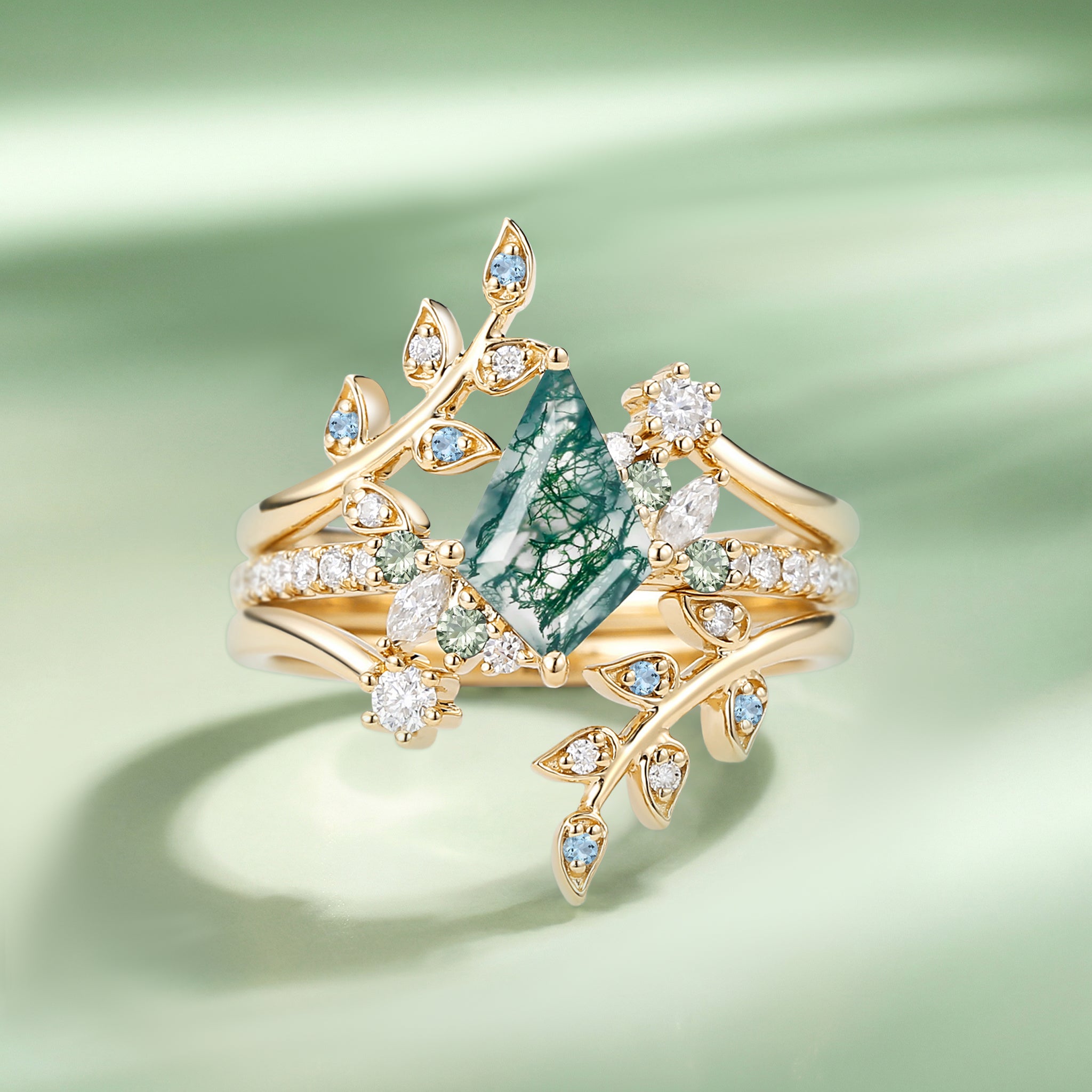 Leafy Kite Cut Moss Agate Engagement Ring Set 3pcs - Kairi