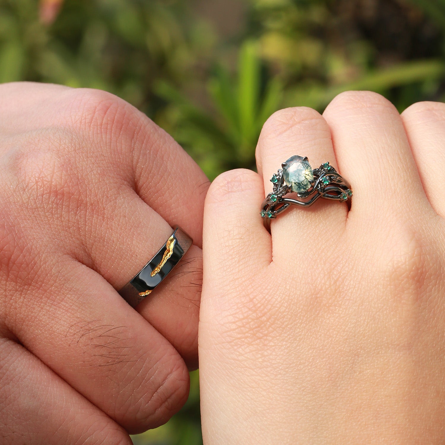 Nature Inspired - Black Gold Moss Agate Leafy Couple Ring Set 3pcs - Mossy