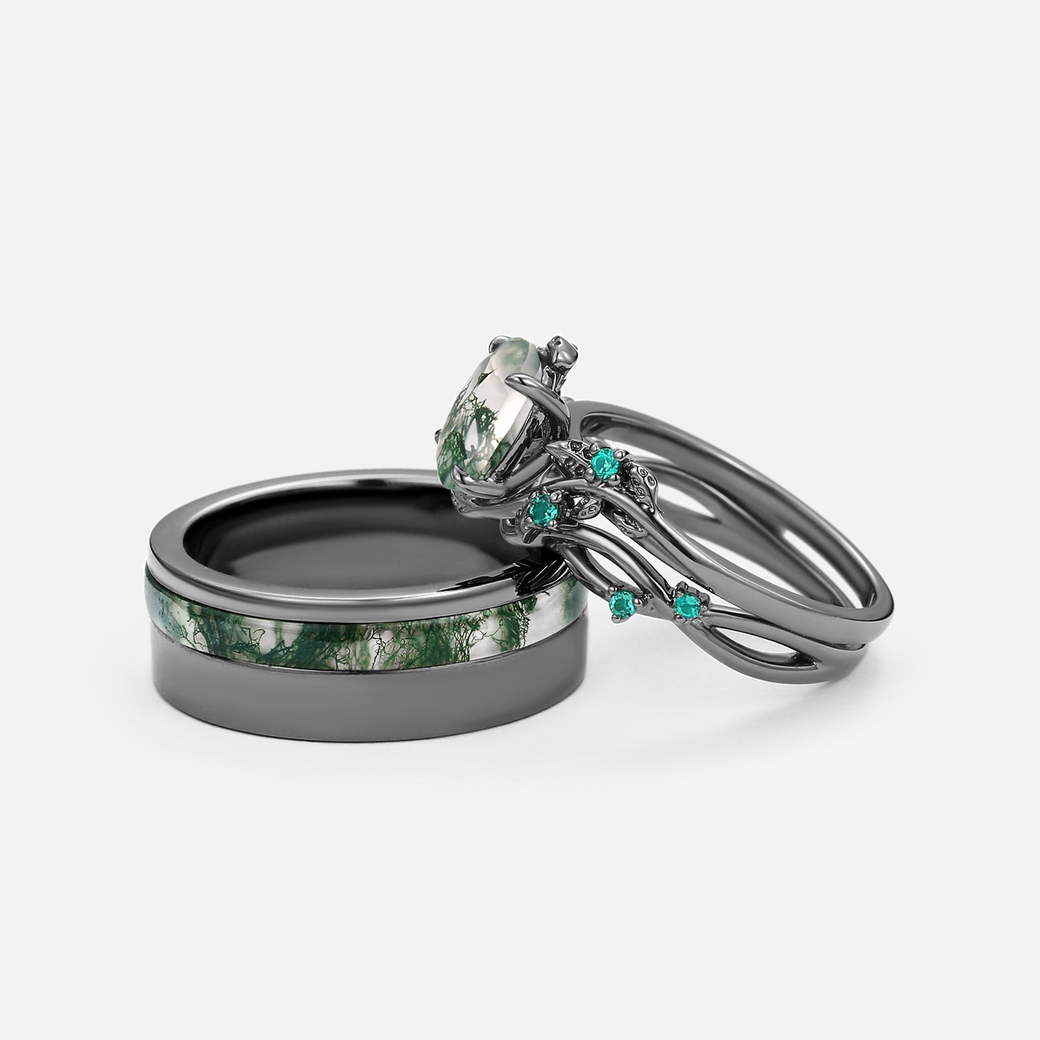 Nature Inspired - Black Gold Moss Agate Oval Cut Couple Ring Set 3pcs - Mossy