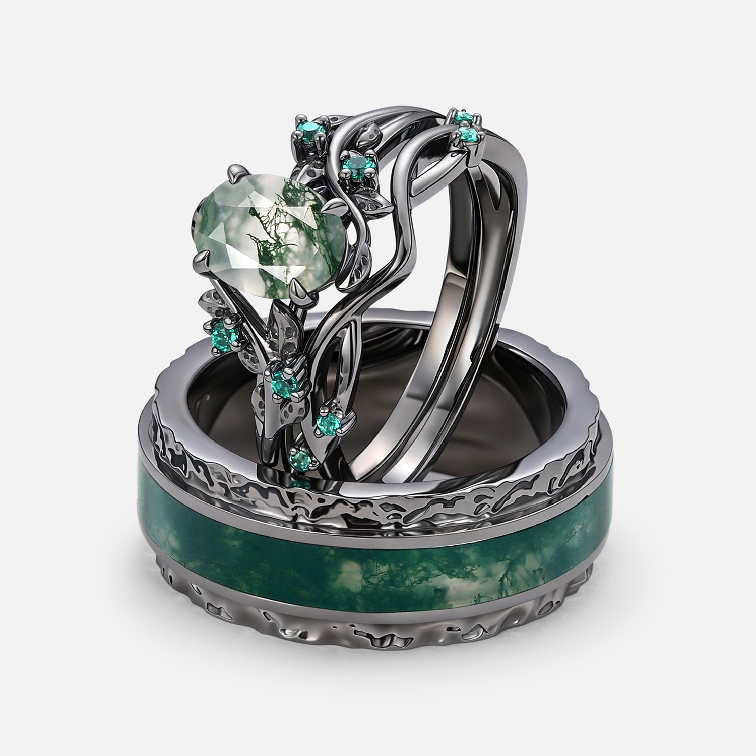 Nature Inspired - Black Gold Oval Moss Agate Leafy Couple Ring Set 3pcs - Mossy