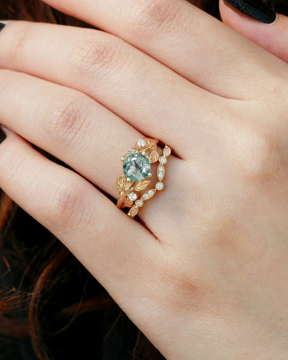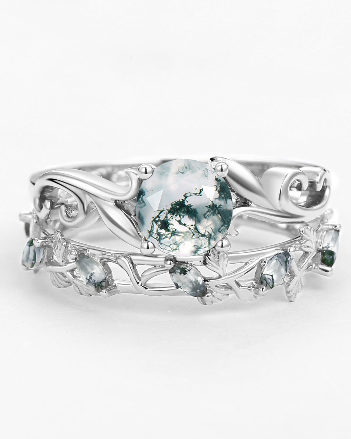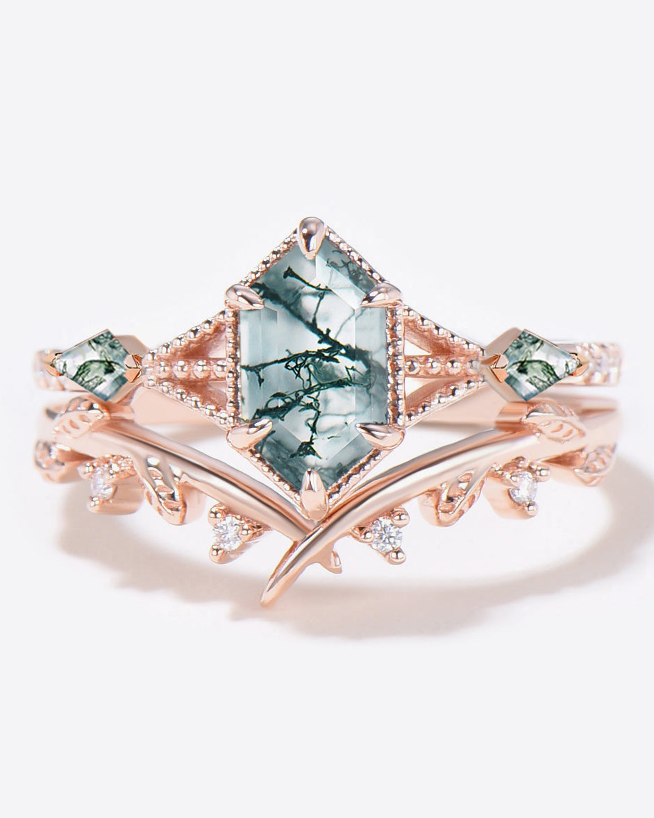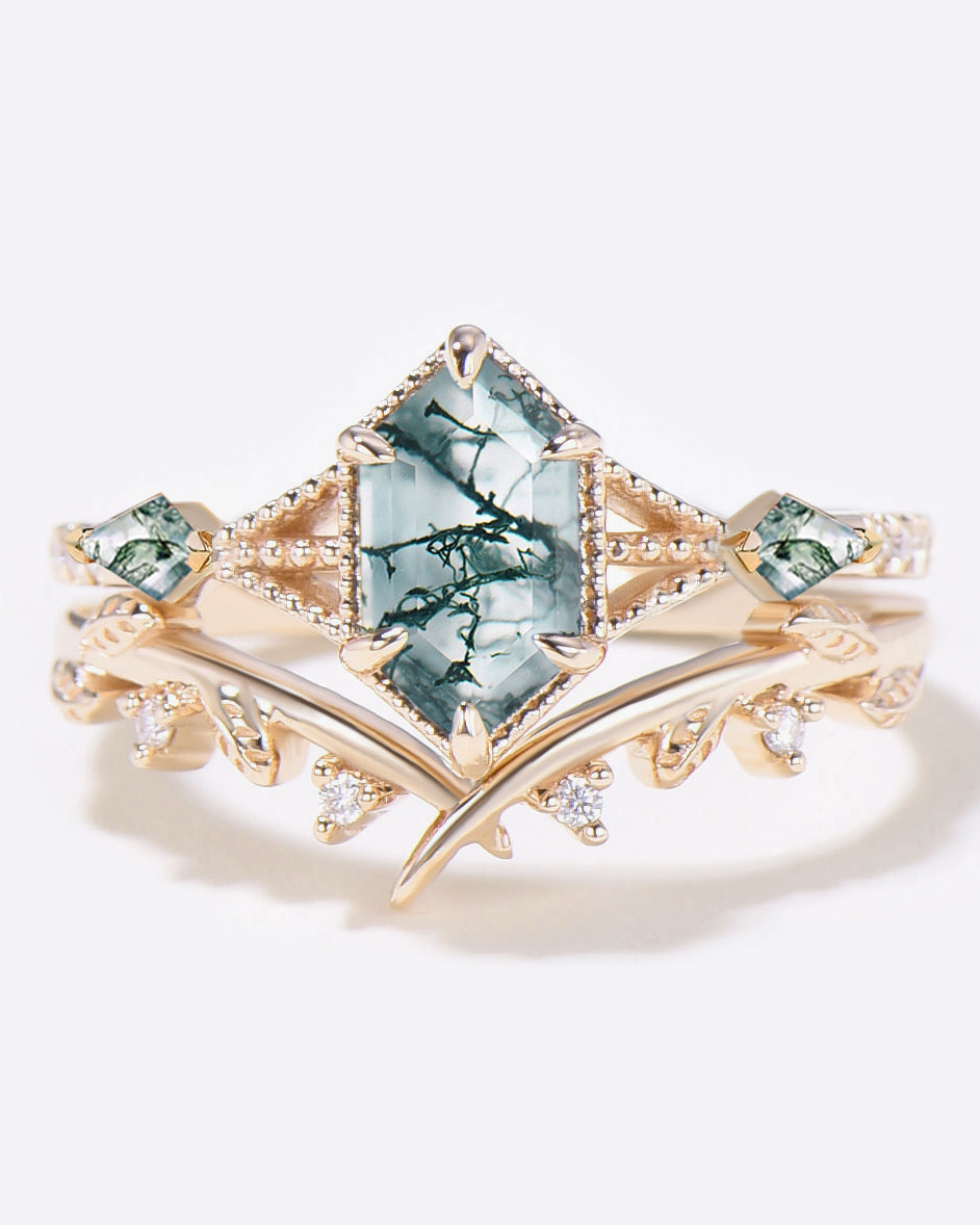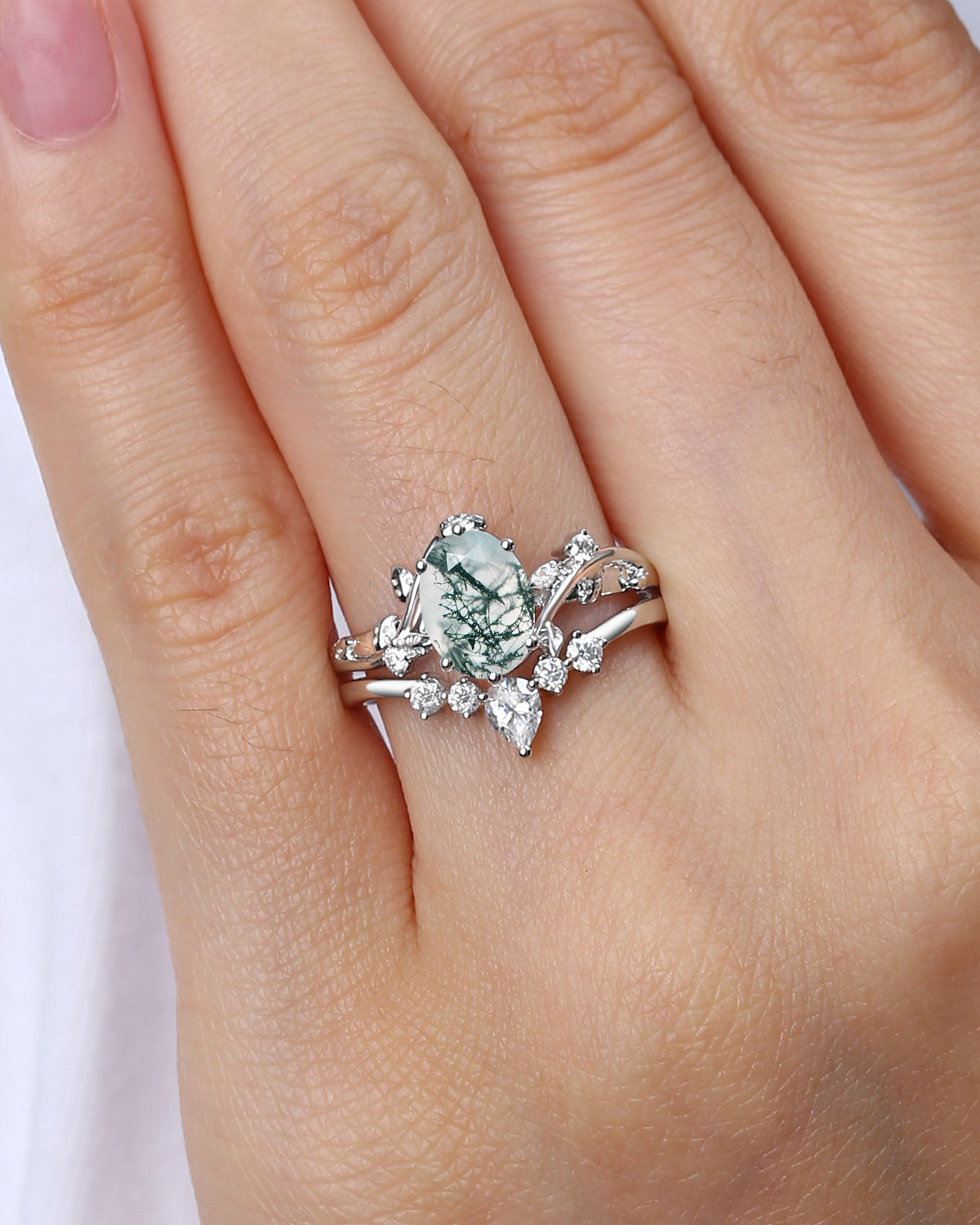 Nature Inspired Engagement Rings include branches nature engagement rings and leafy nature inspired wedding rings, both of which are inspired by natural vines, especially the vine moss agate engagement ring and the moss agate leaf bridal set.