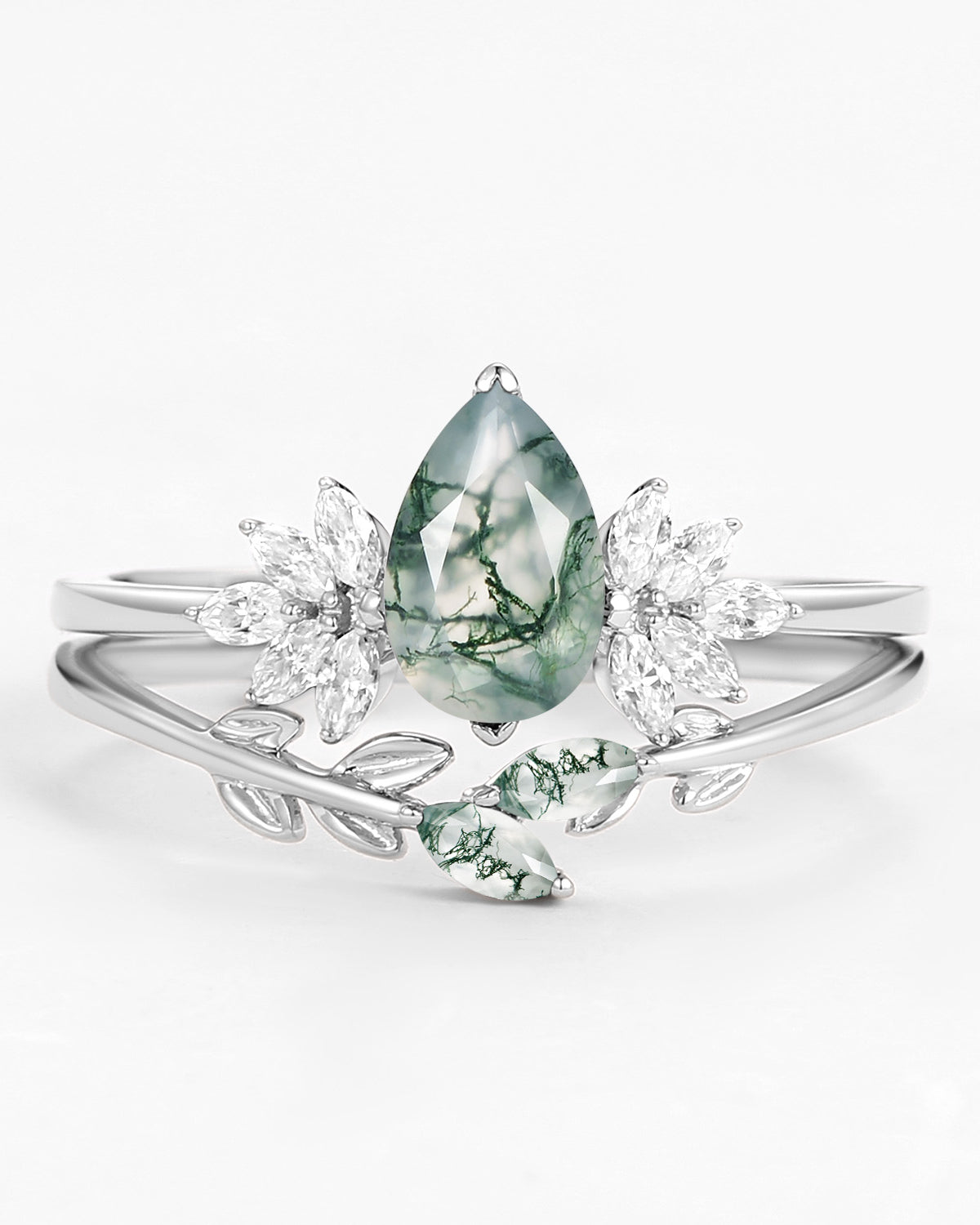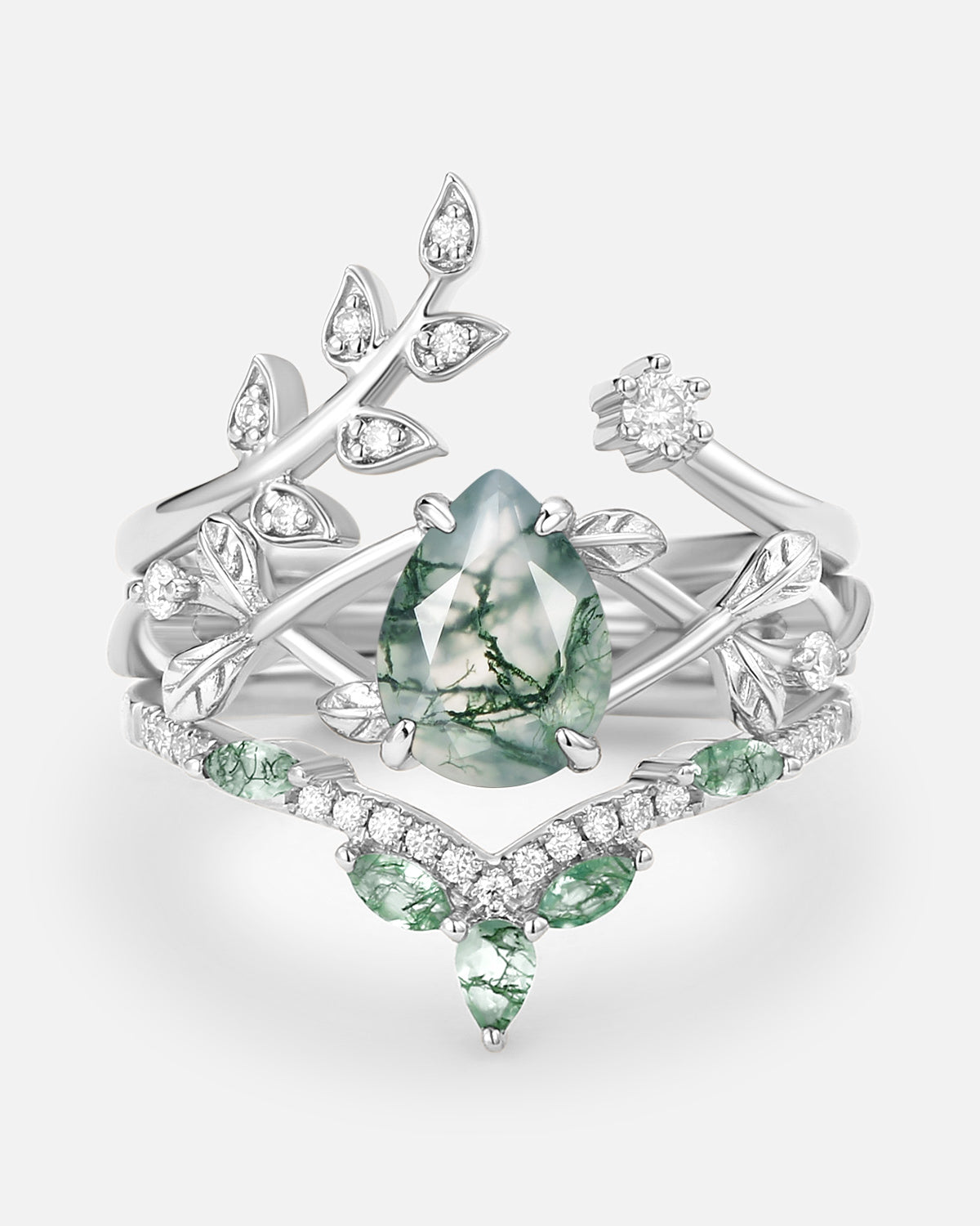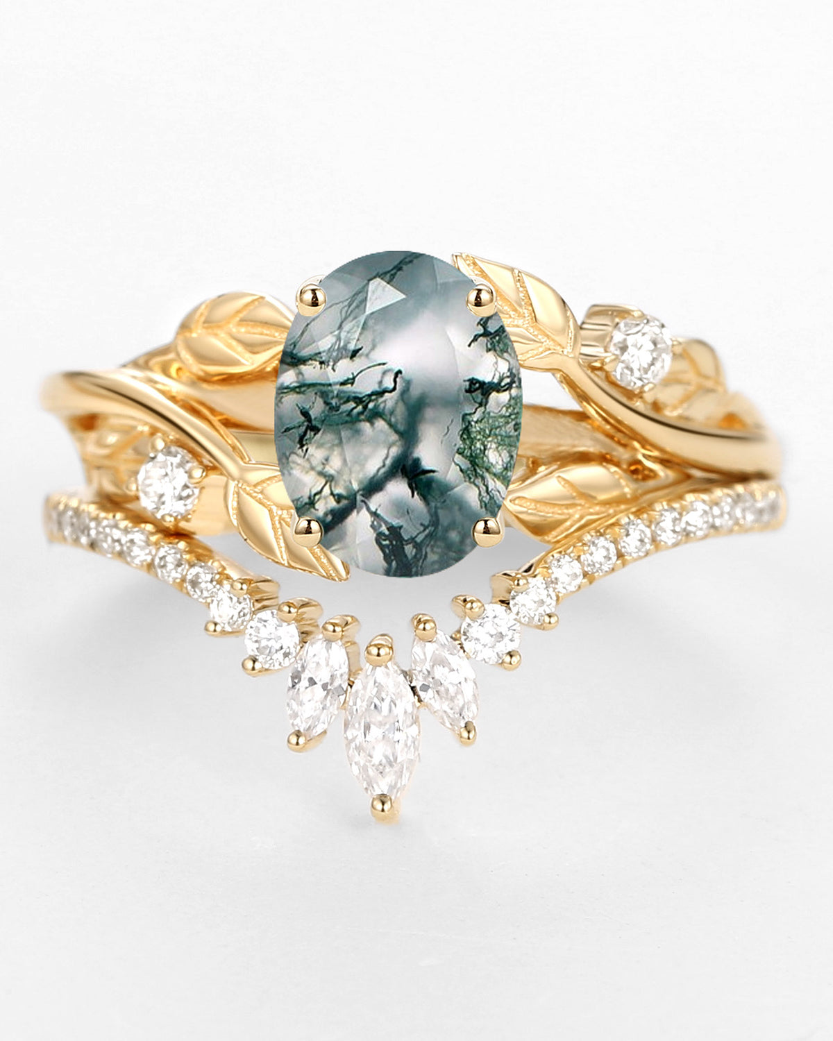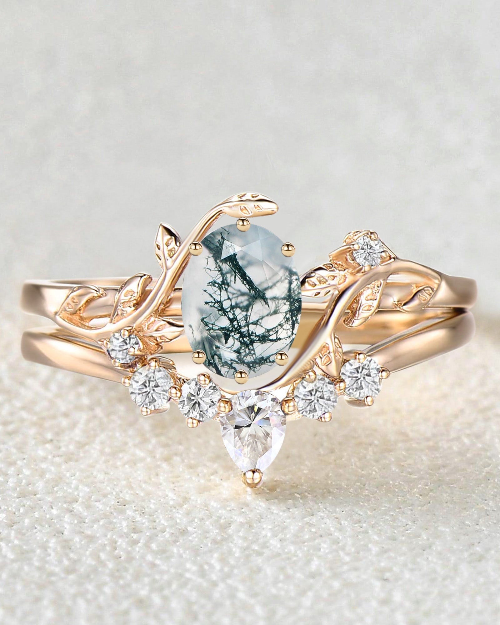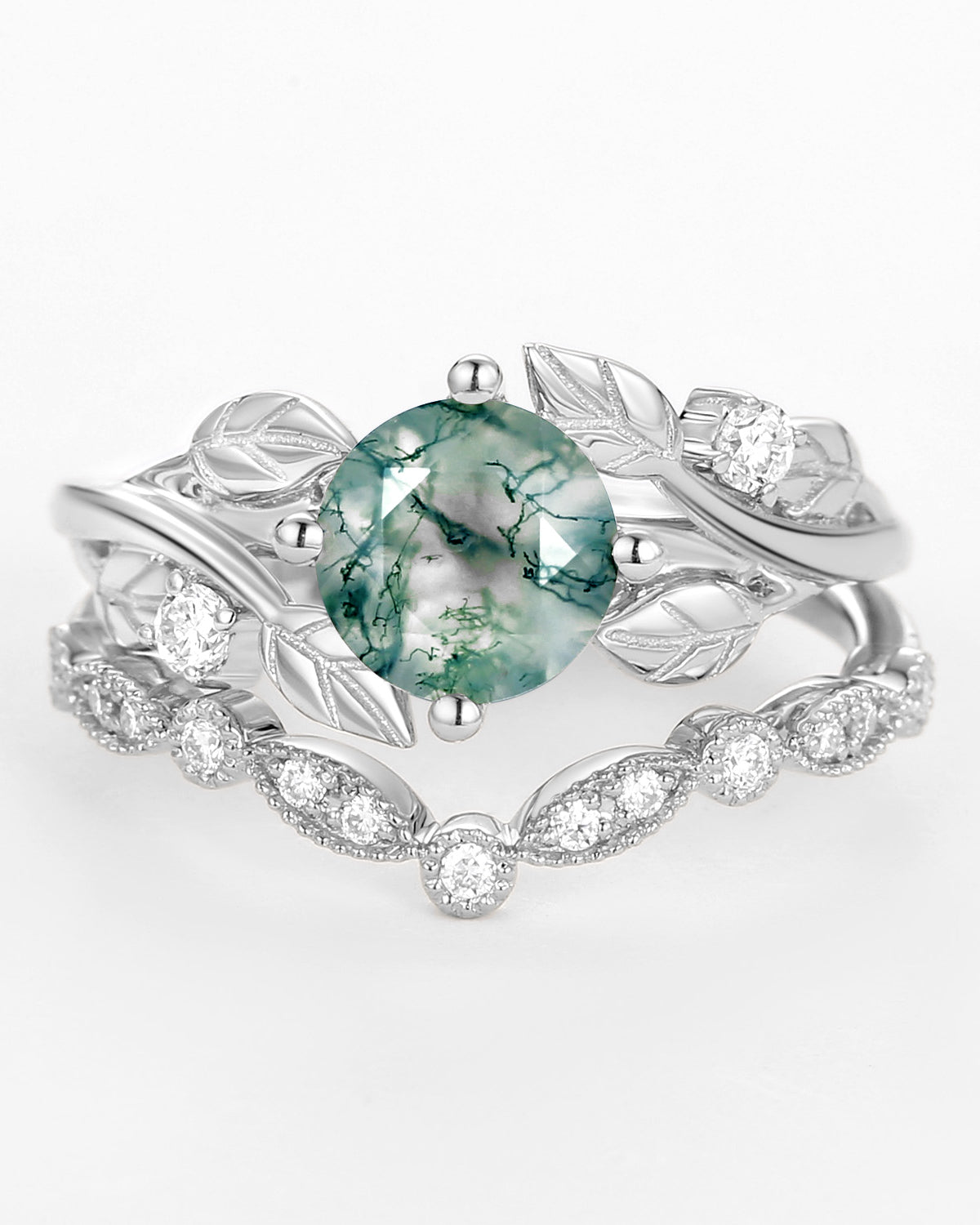 Nature Inspired Engagement Rings include branches nature engagement rings and leafy nature inspired wedding rings, both of which are inspired by natural vines, especially the vine moss agate engagement ring and the moss agate leaf bridal set.