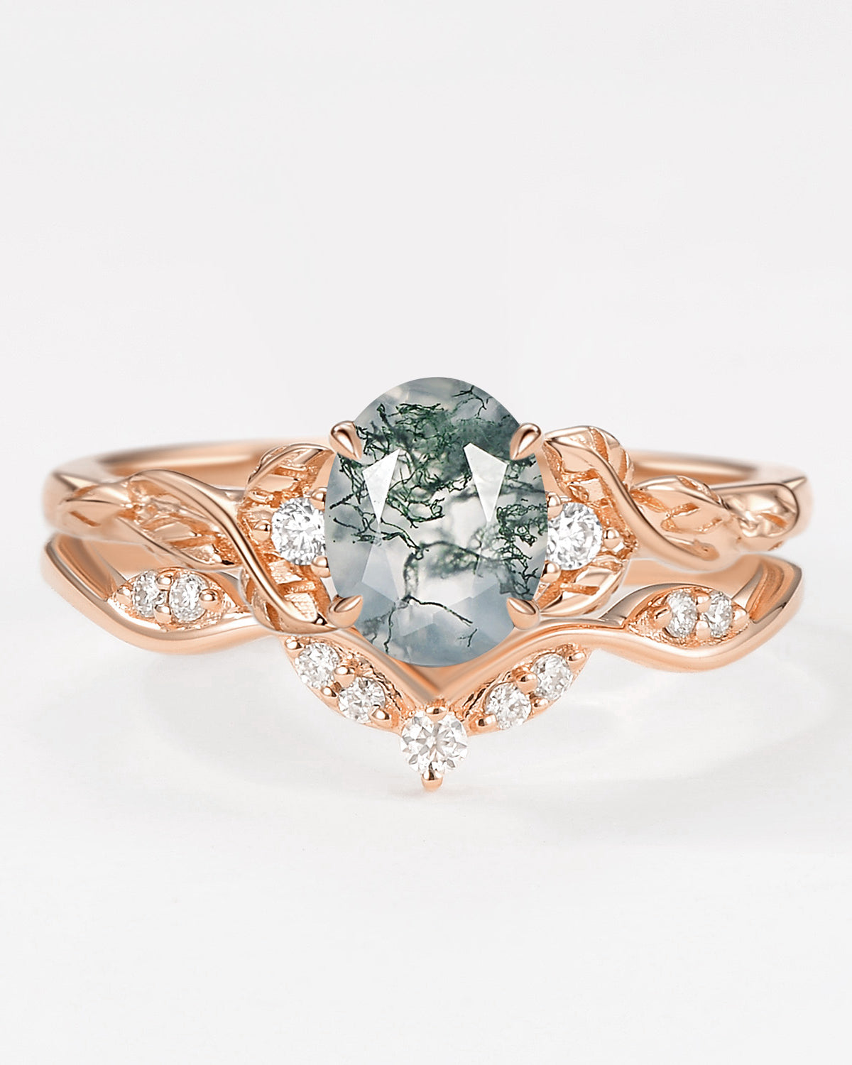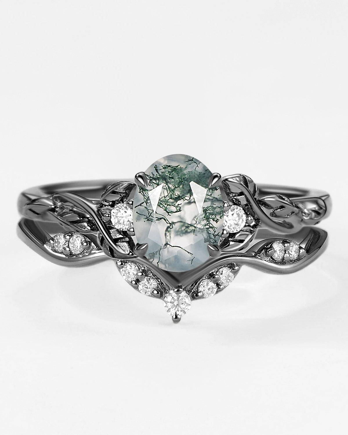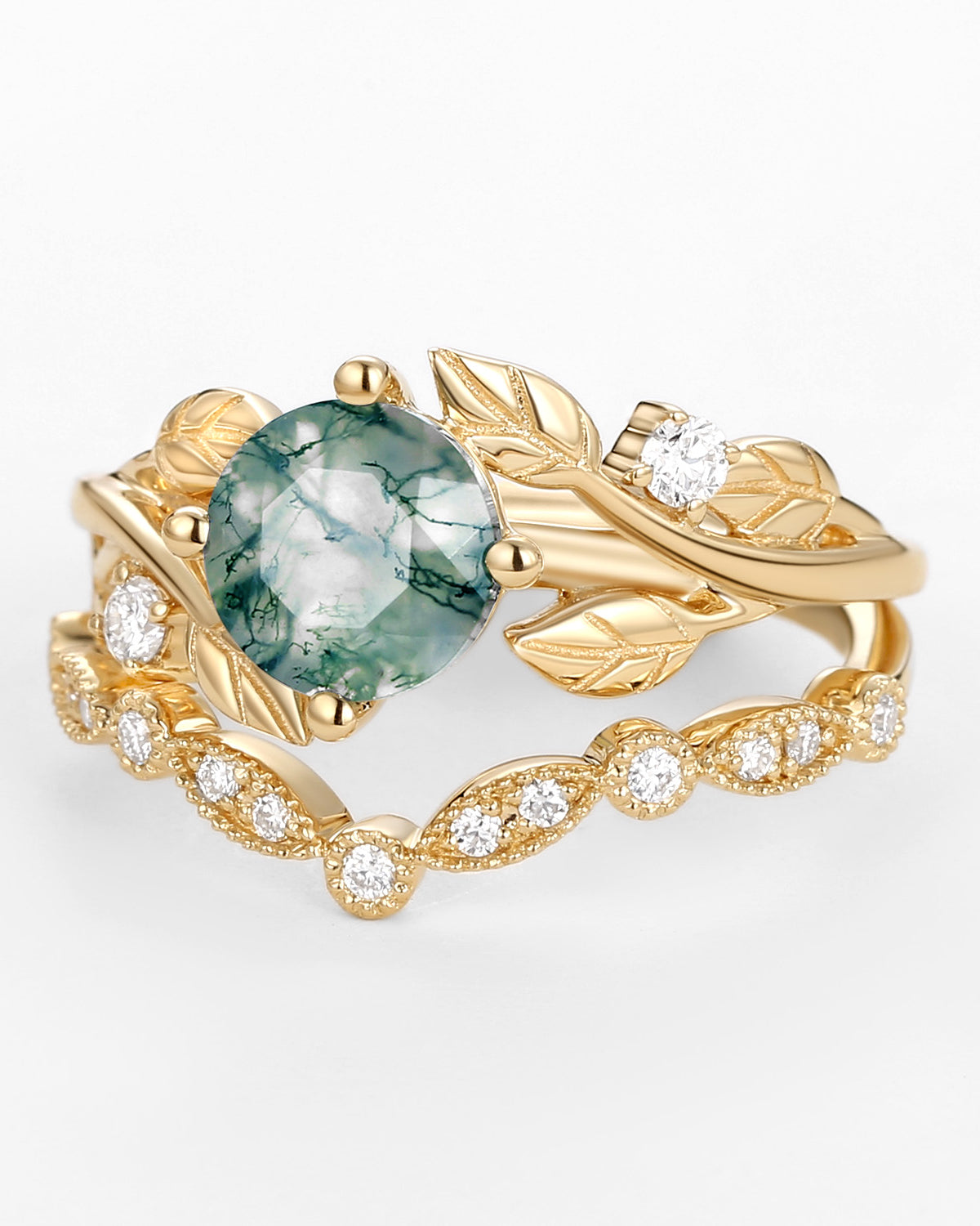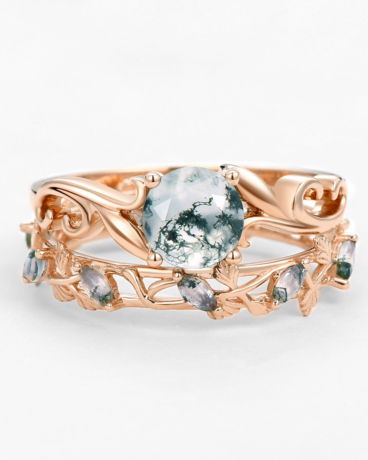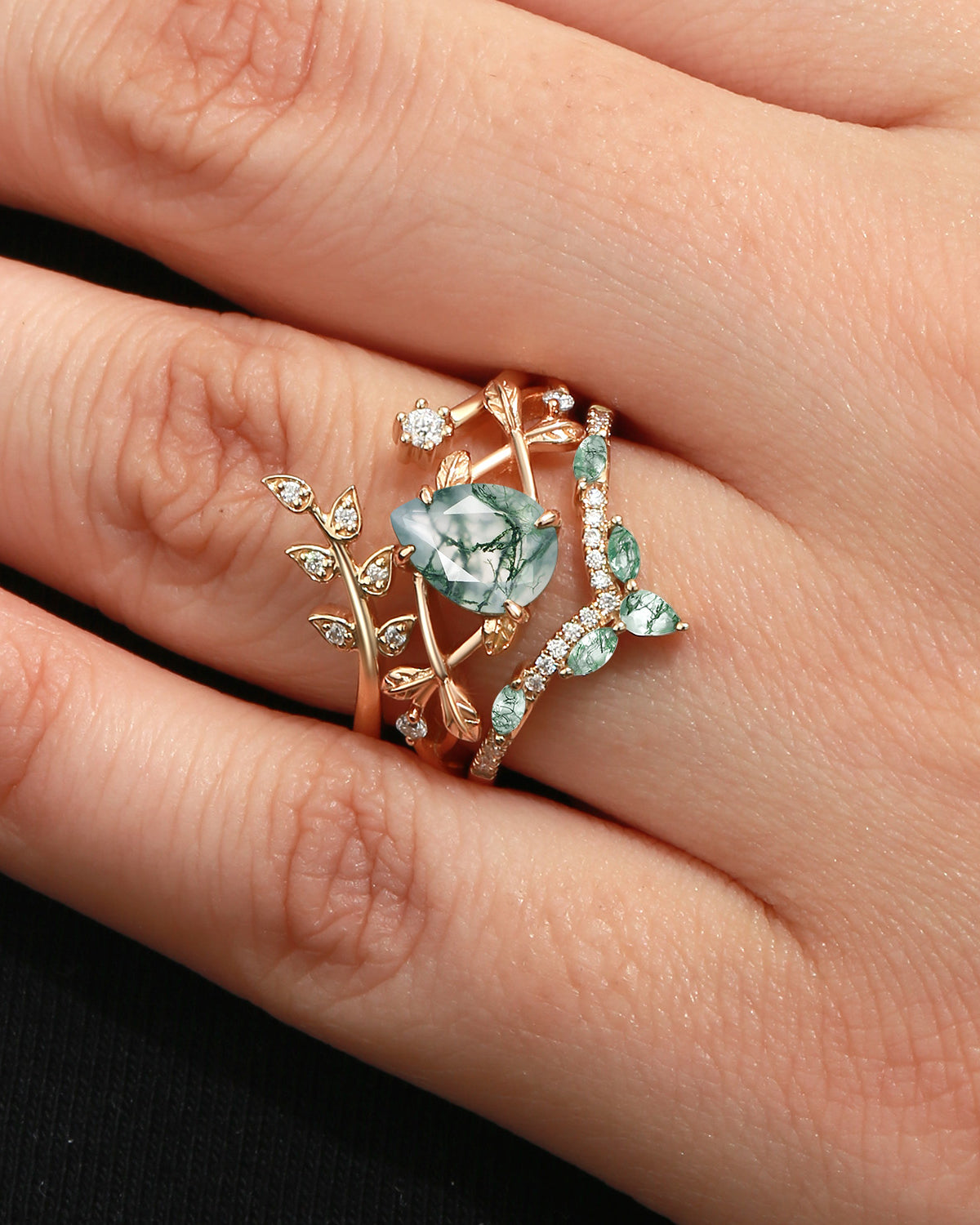 Nature Inspired Engagement Rings include branches nature engagement rings and leafy nature inspired wedding rings, both of which are inspired by natural vines, especially the vine moss agate engagement ring and the moss agate leaf bridal set.