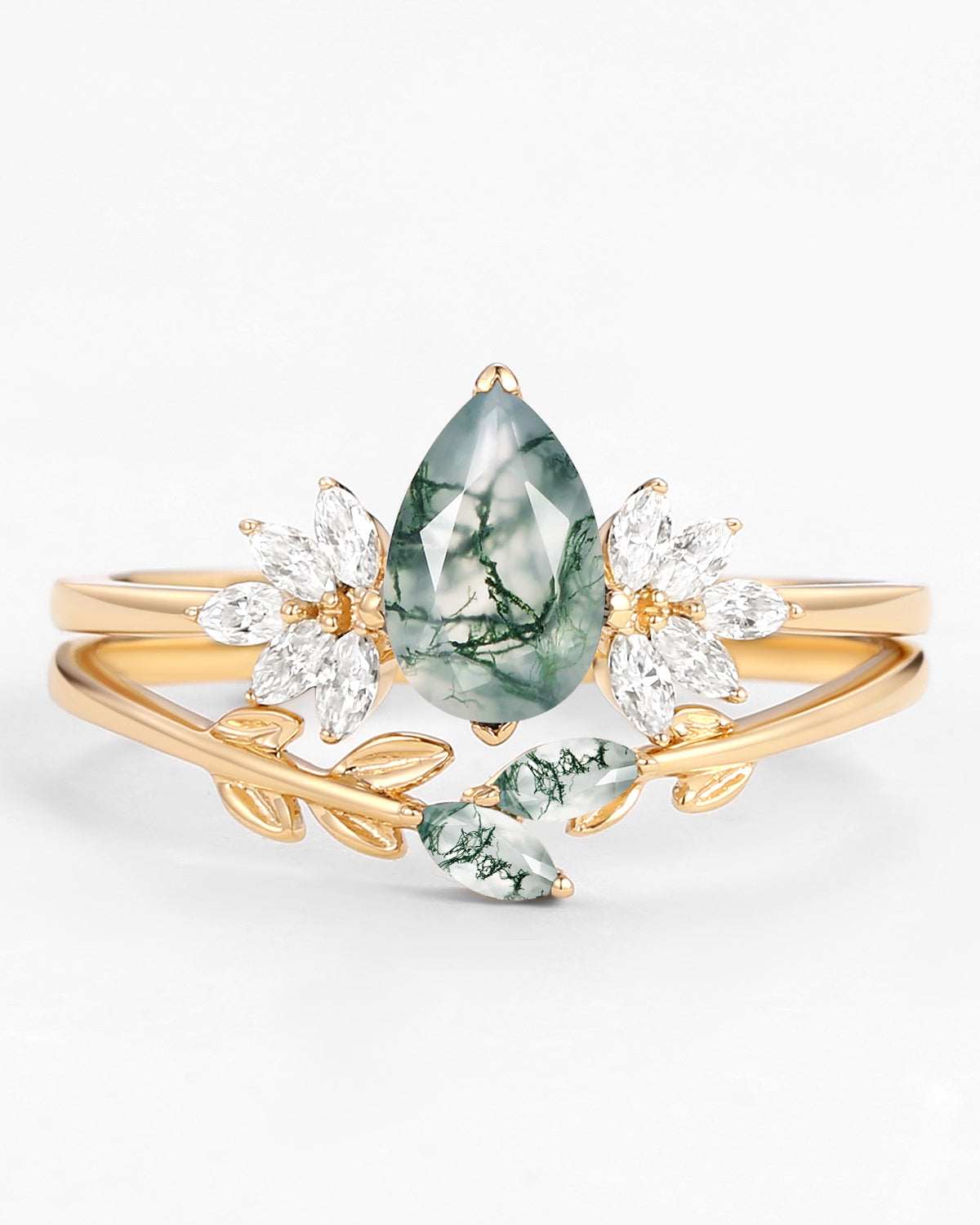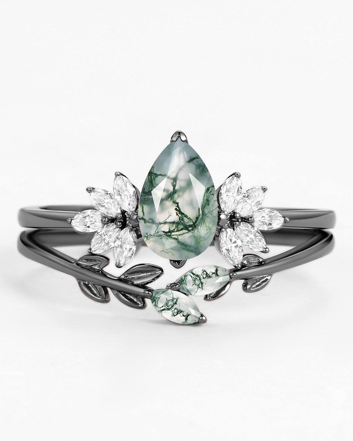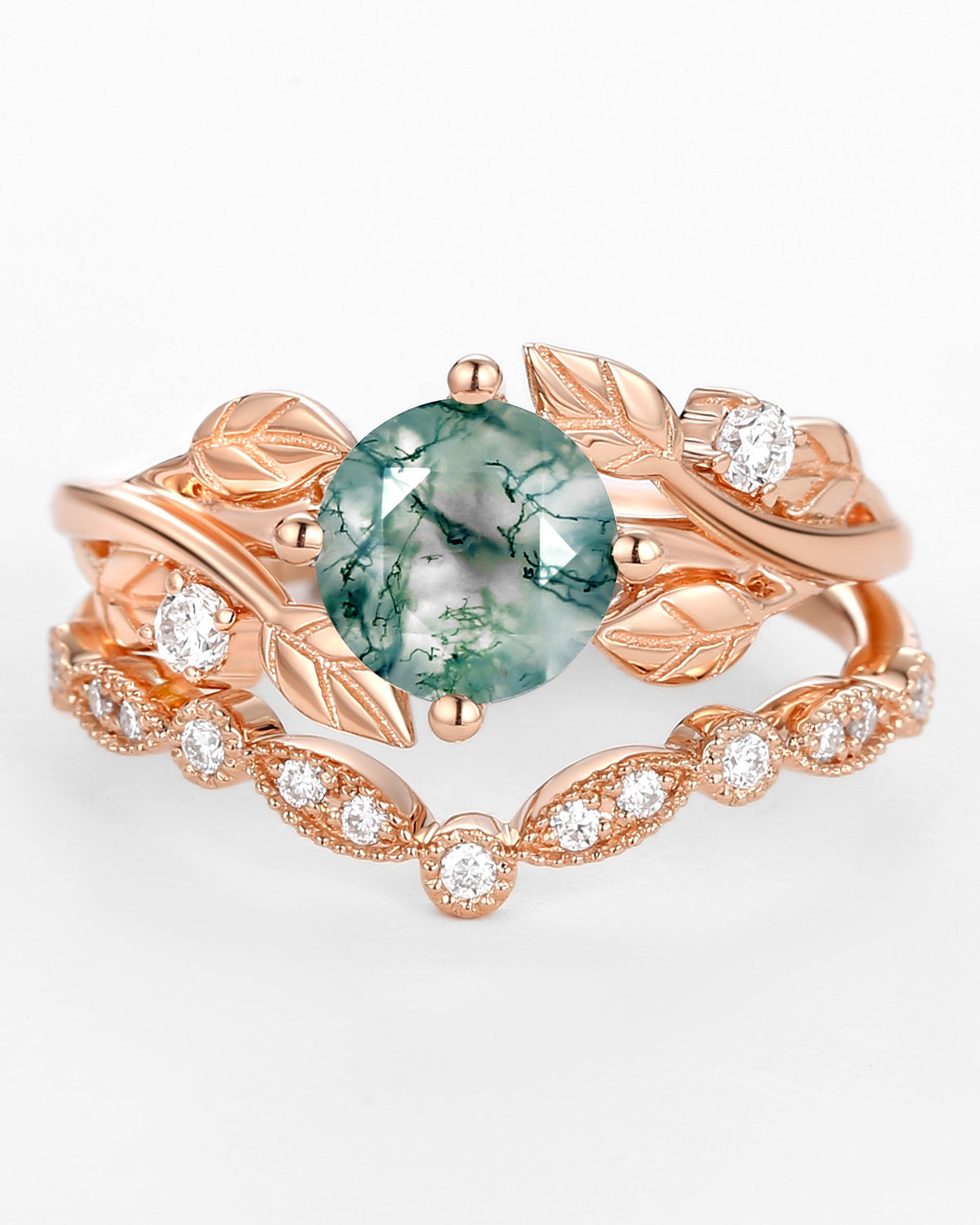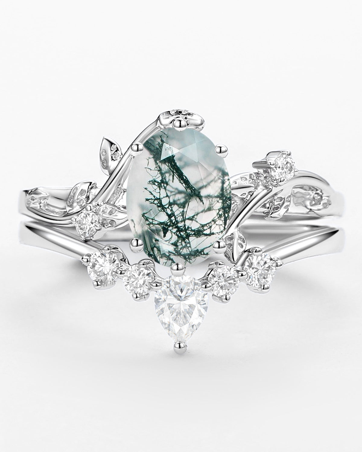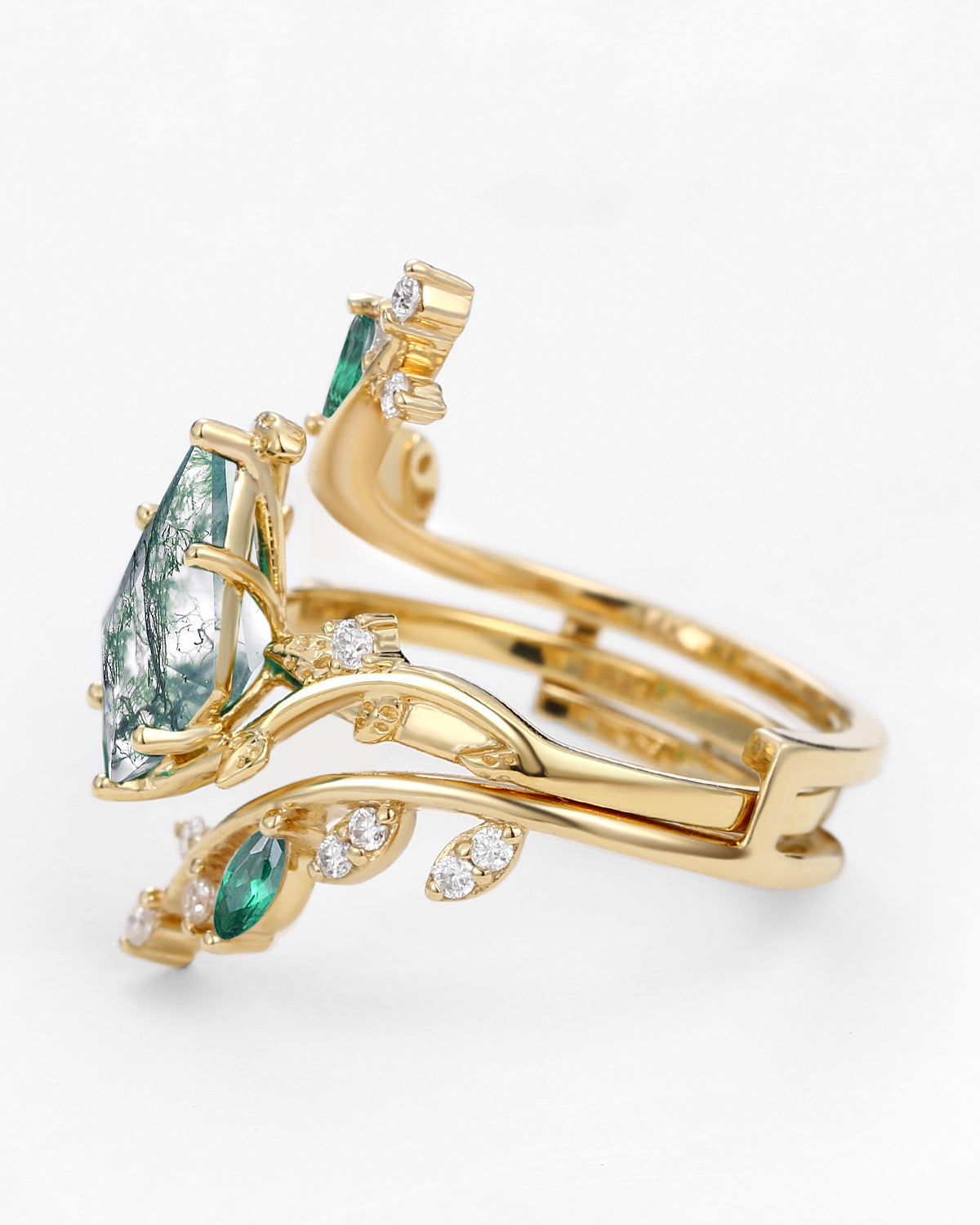 Nature Inspired Engagement Rings include branches nature engagement rings and leafy nature inspired wedding rings, both of which are inspired by natural vines, especially the vine moss agate engagement ring and the moss agate leaf bridal set.