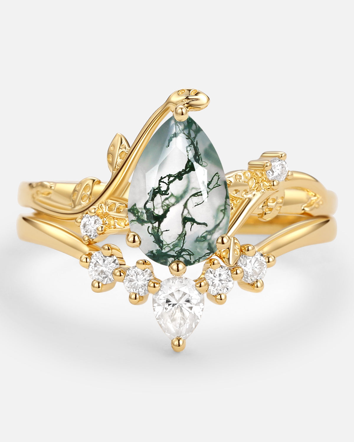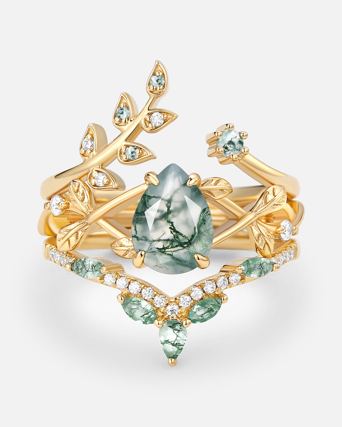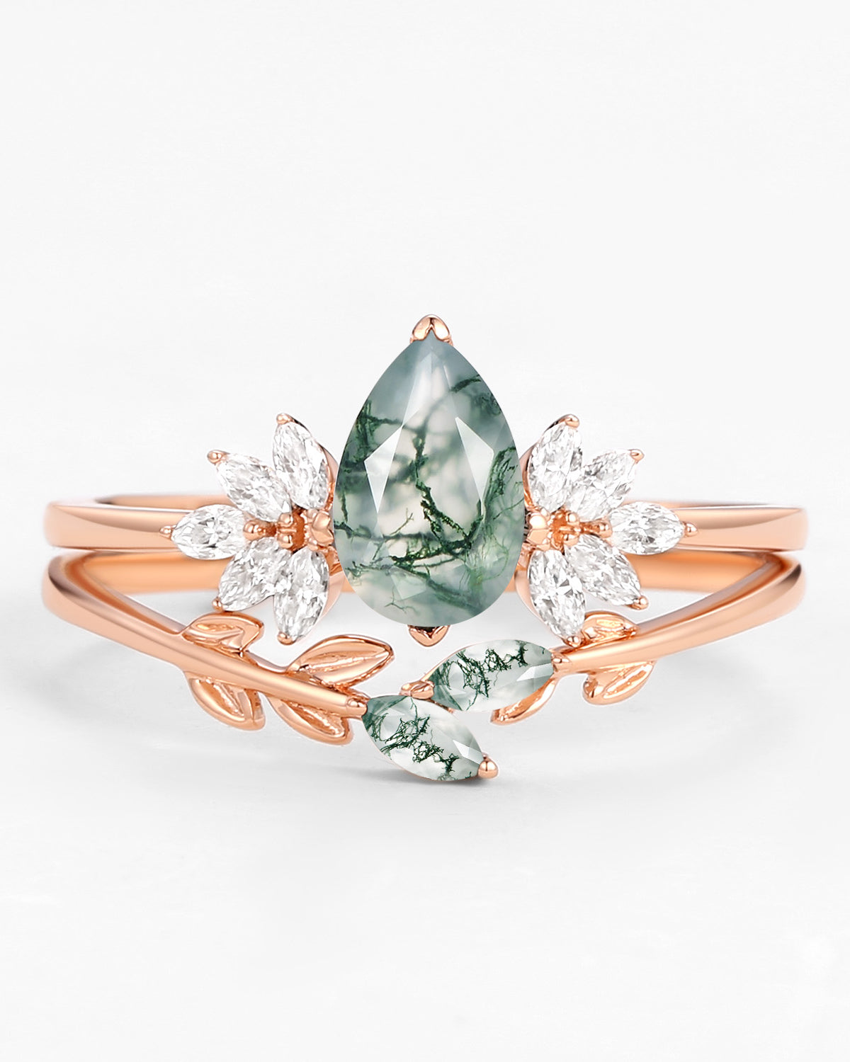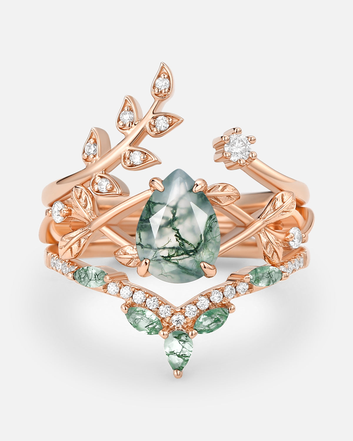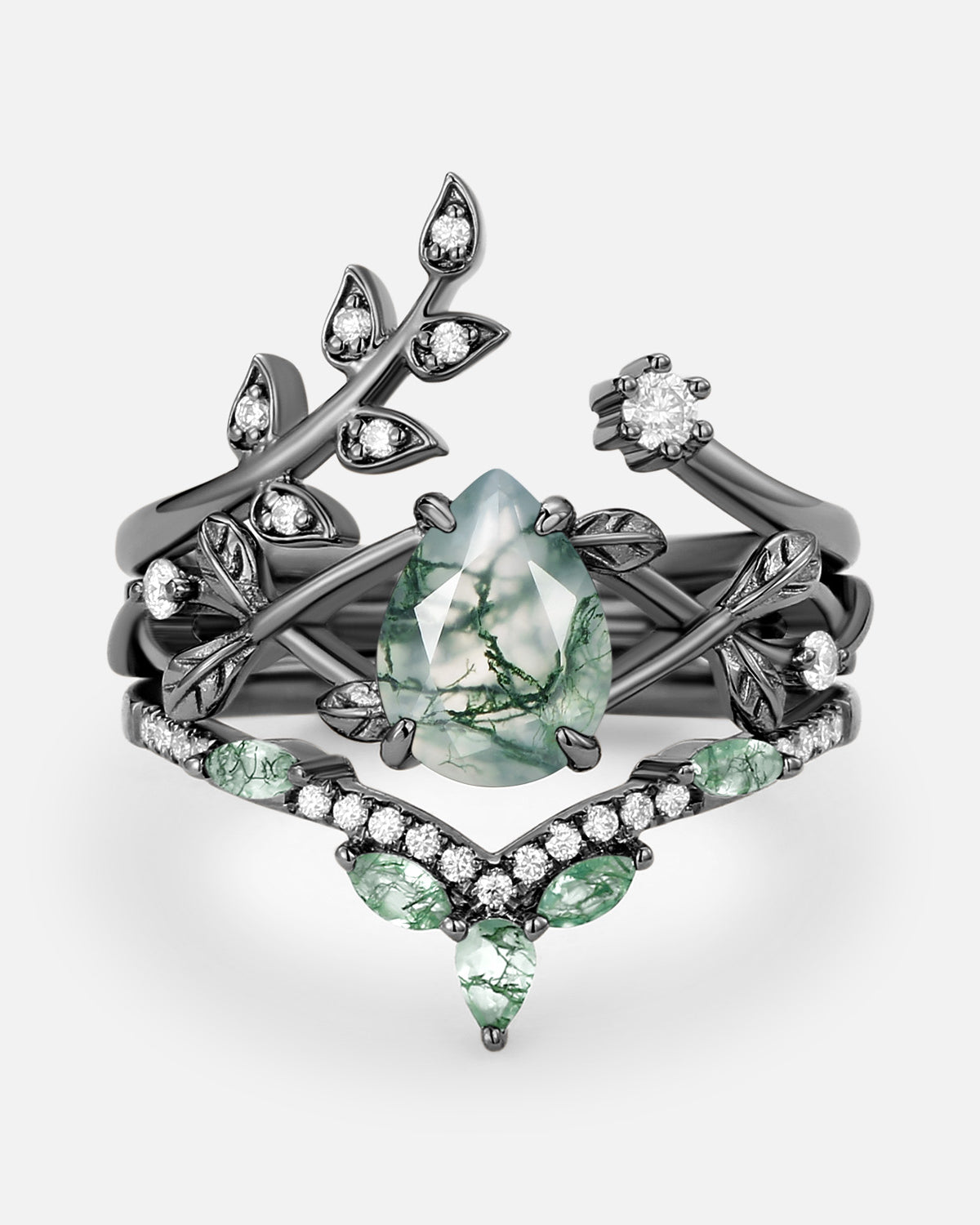 Nature Inspired Engagement Rings include branches nature engagement rings and leafy nature inspired wedding rings, both of which are inspired by natural vines, especially the vine moss agate engagement ring and the moss agate leaf bridal set.