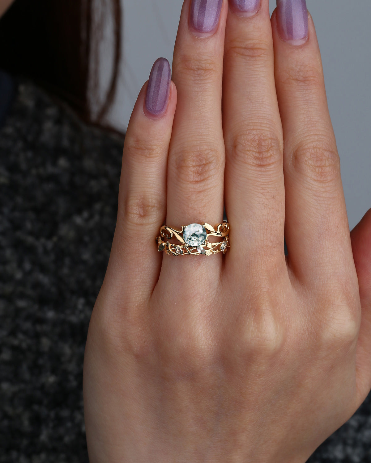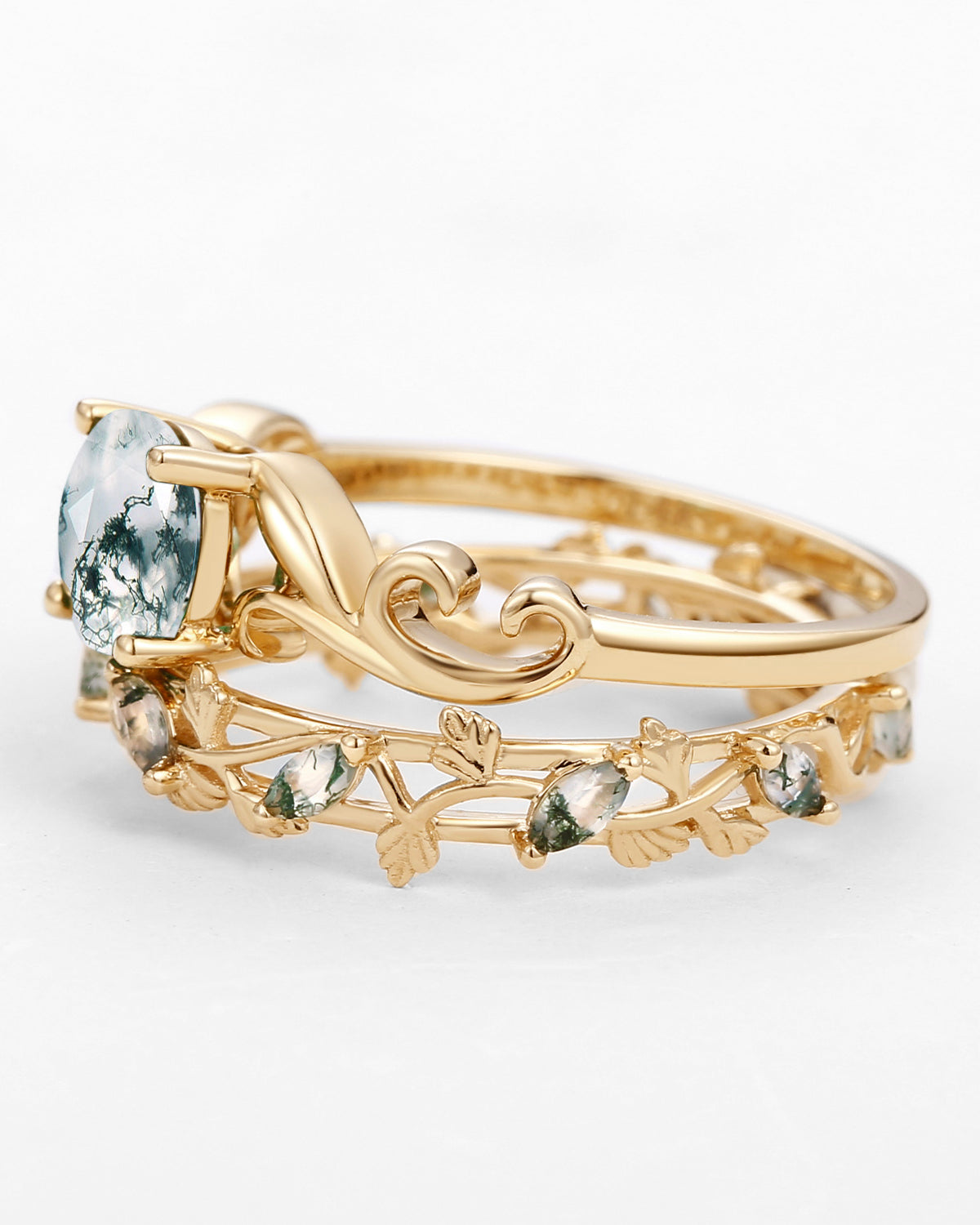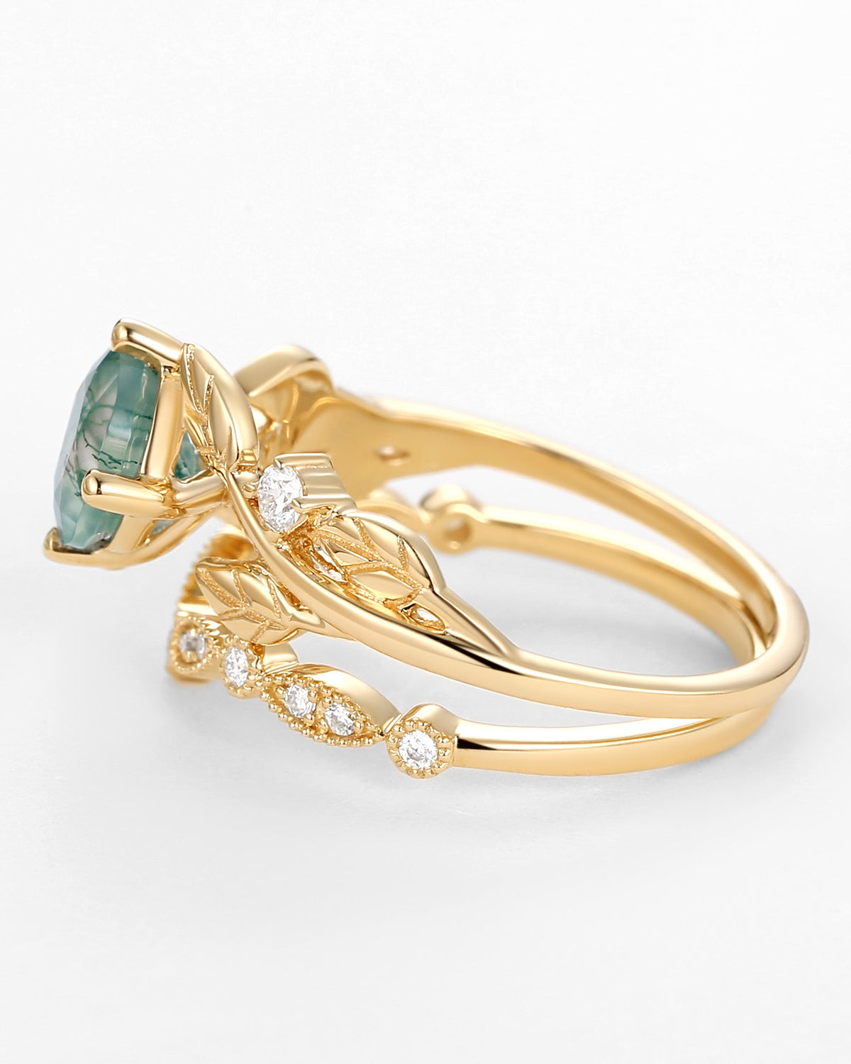 Most people buy moss agate rings in the nature inspired engagement rings collection because the green color and texture of moss agate are very close to nature.