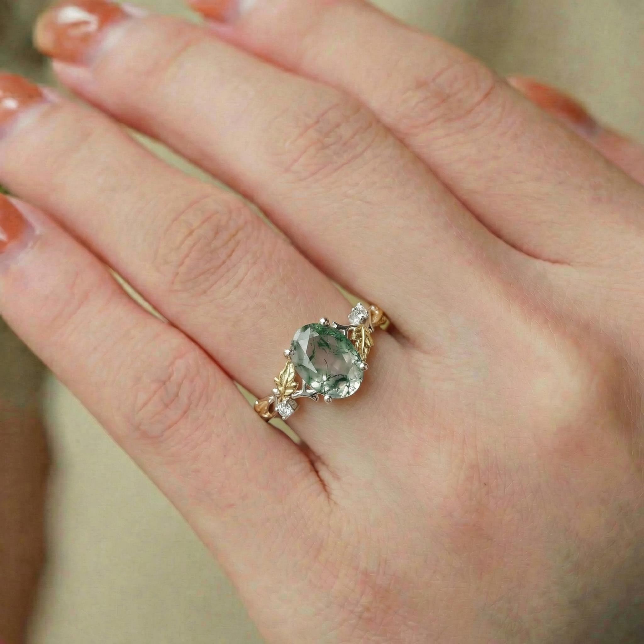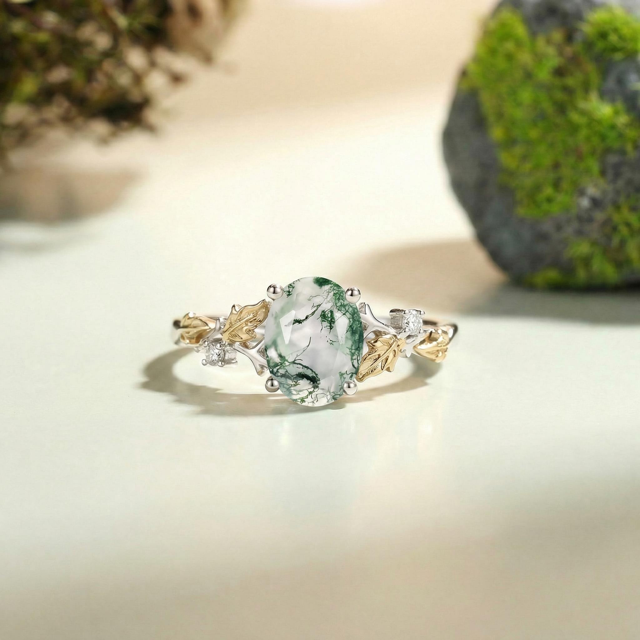 Most people buy moss agate rings in the nature inspired engagement rings collection because the green color and texture of moss agate are very close to nature.