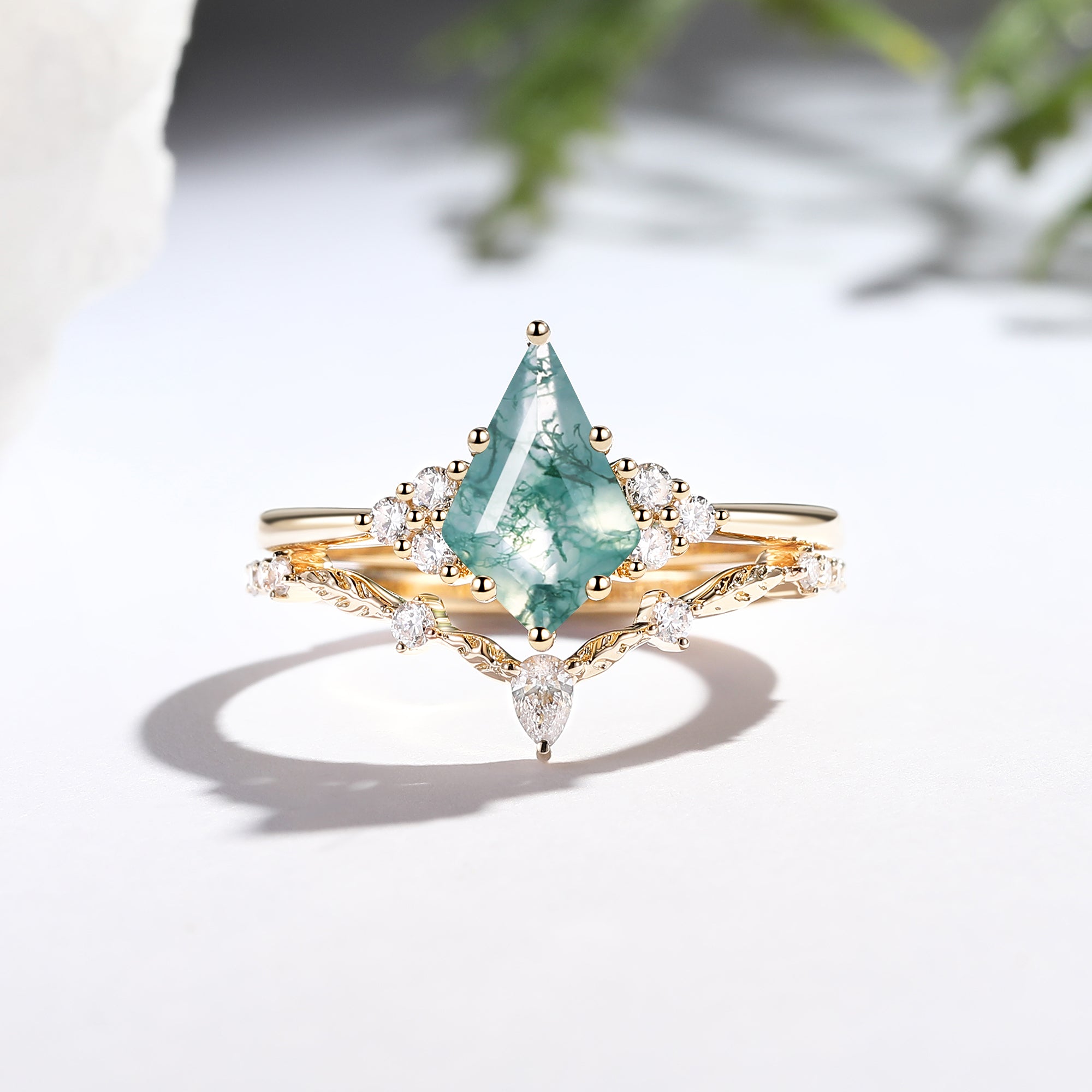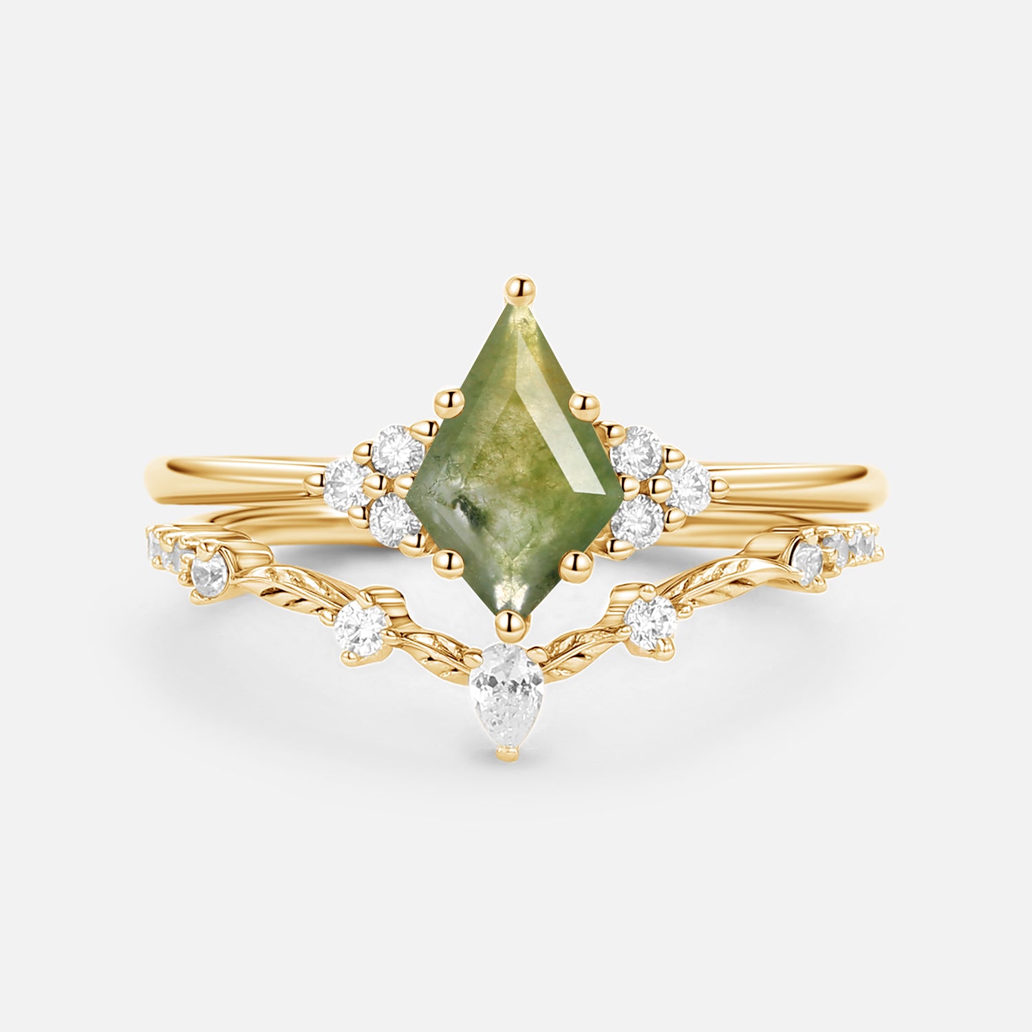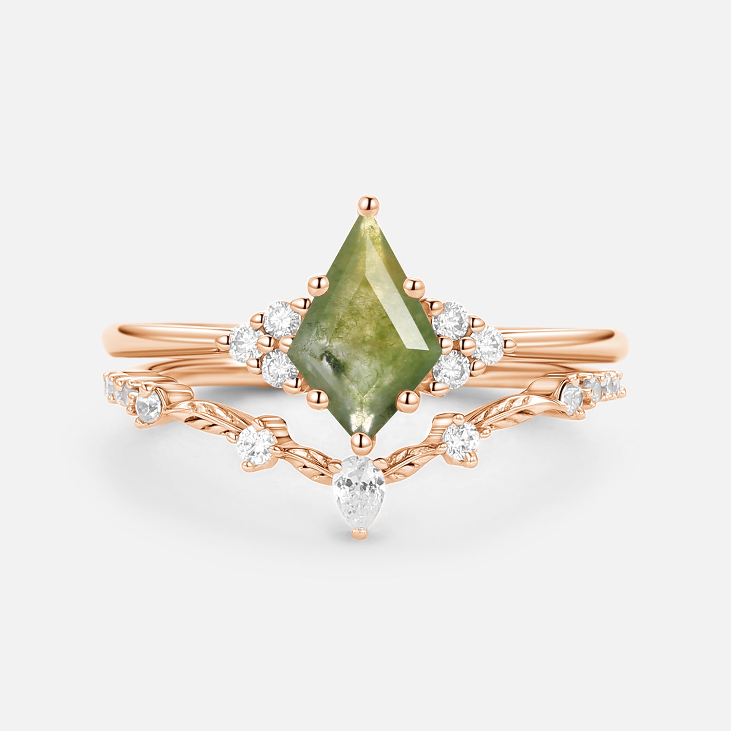 Kite Cut Moss Agate Leafy Engagement Ring Set 2pcs - Ava