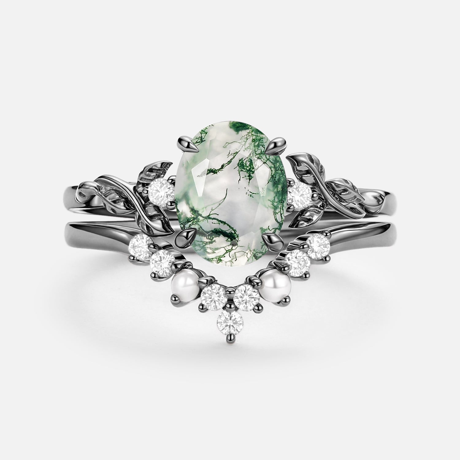 Felicegals Oval Moss Agate White Gold Leafy Ring Set 2pcs Moss Agate Engagement Ring Stacking Wedding Ring Anniversary Promise Women Gift