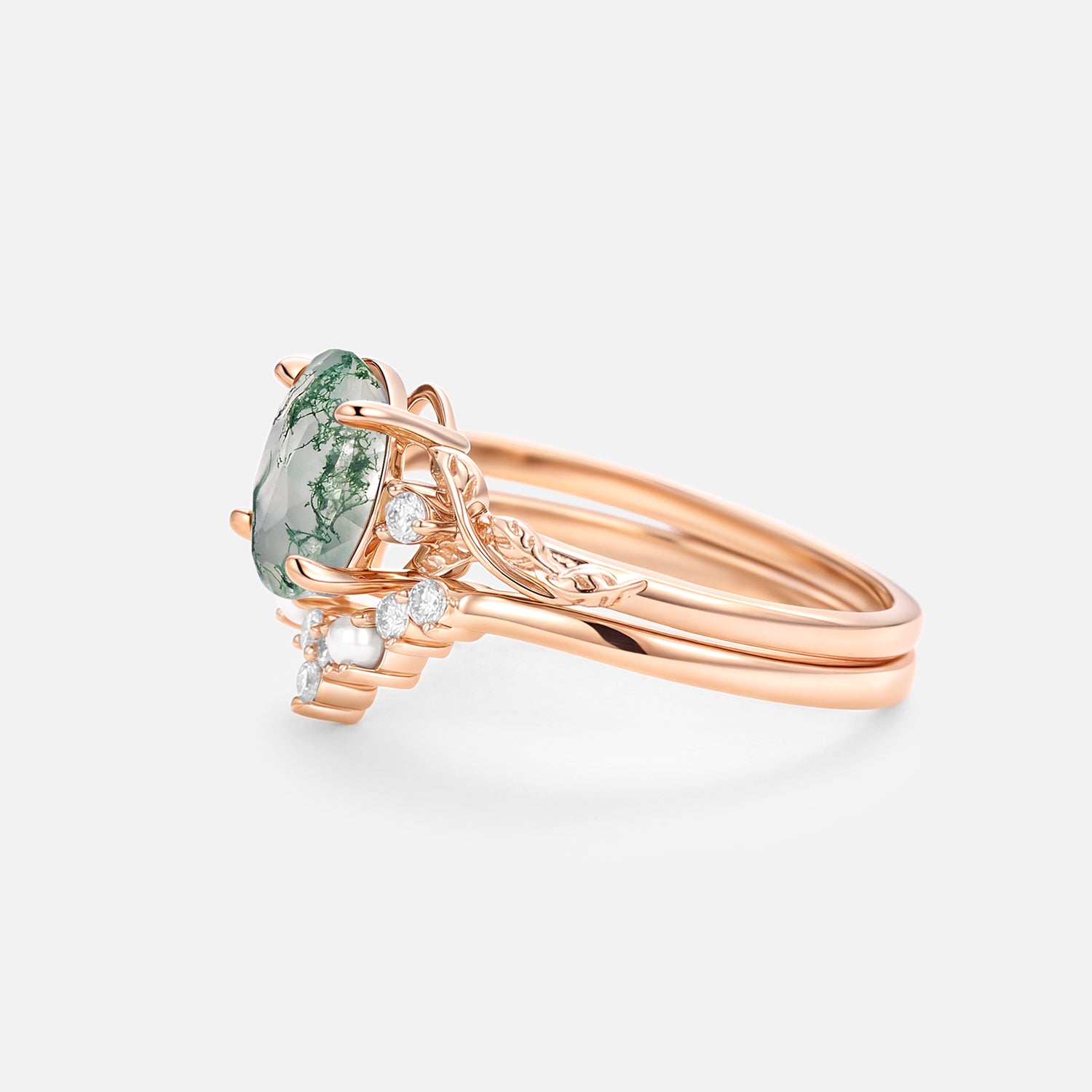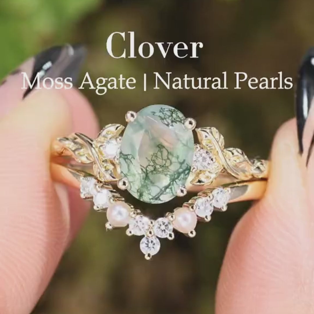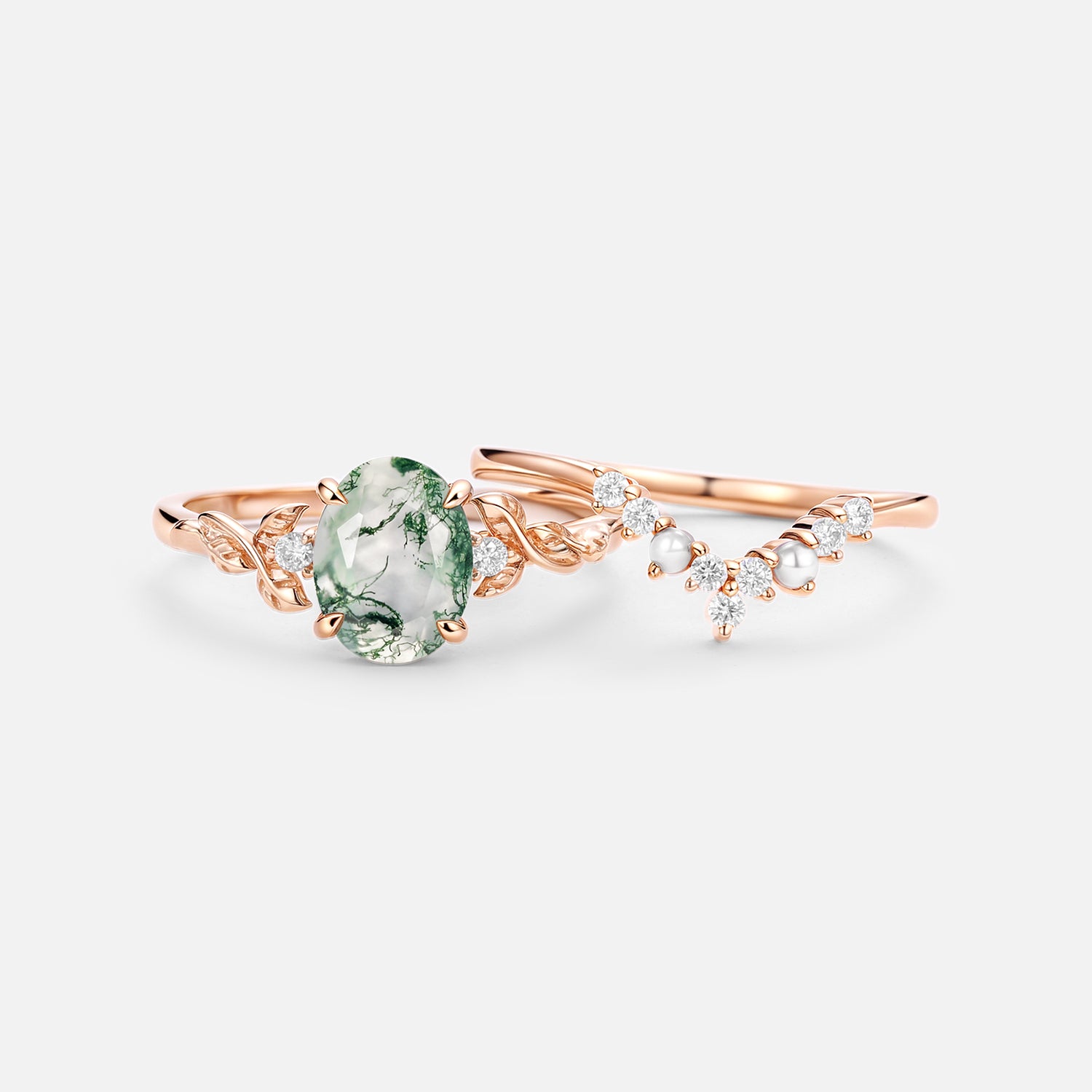 Oval Cut Moss Agate Leafy Gold Ring Set 2pcs - Clover
