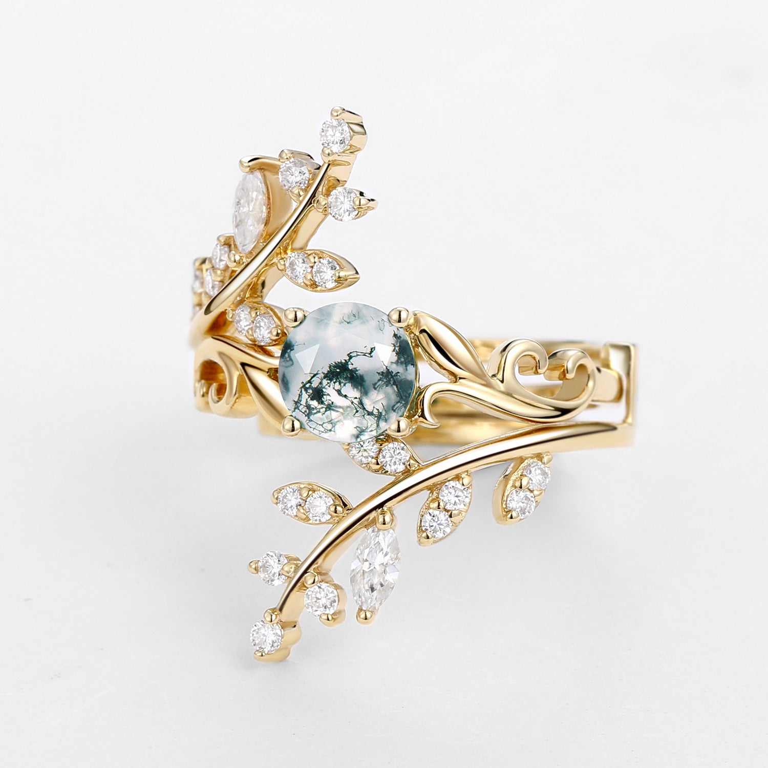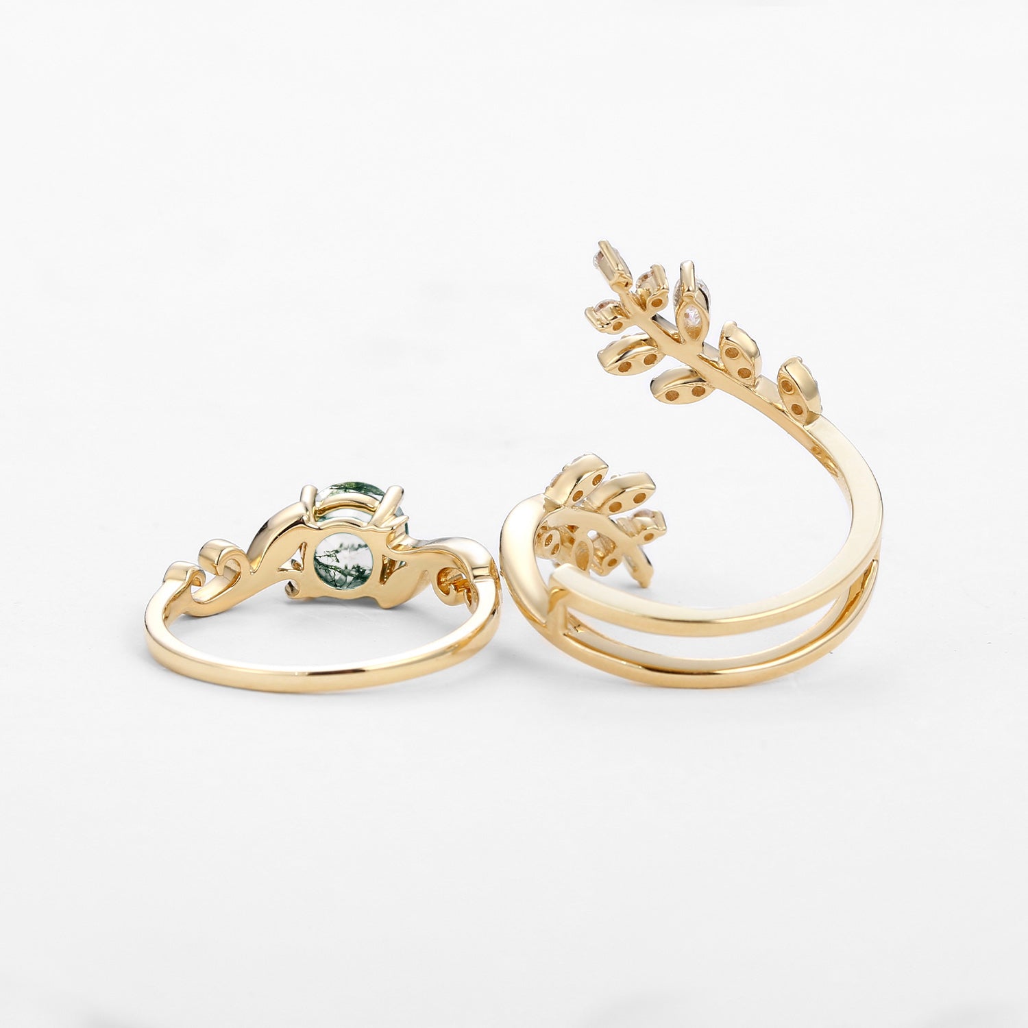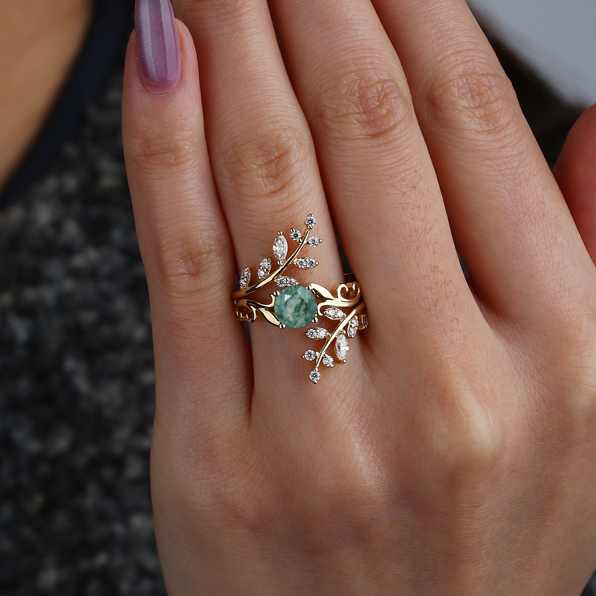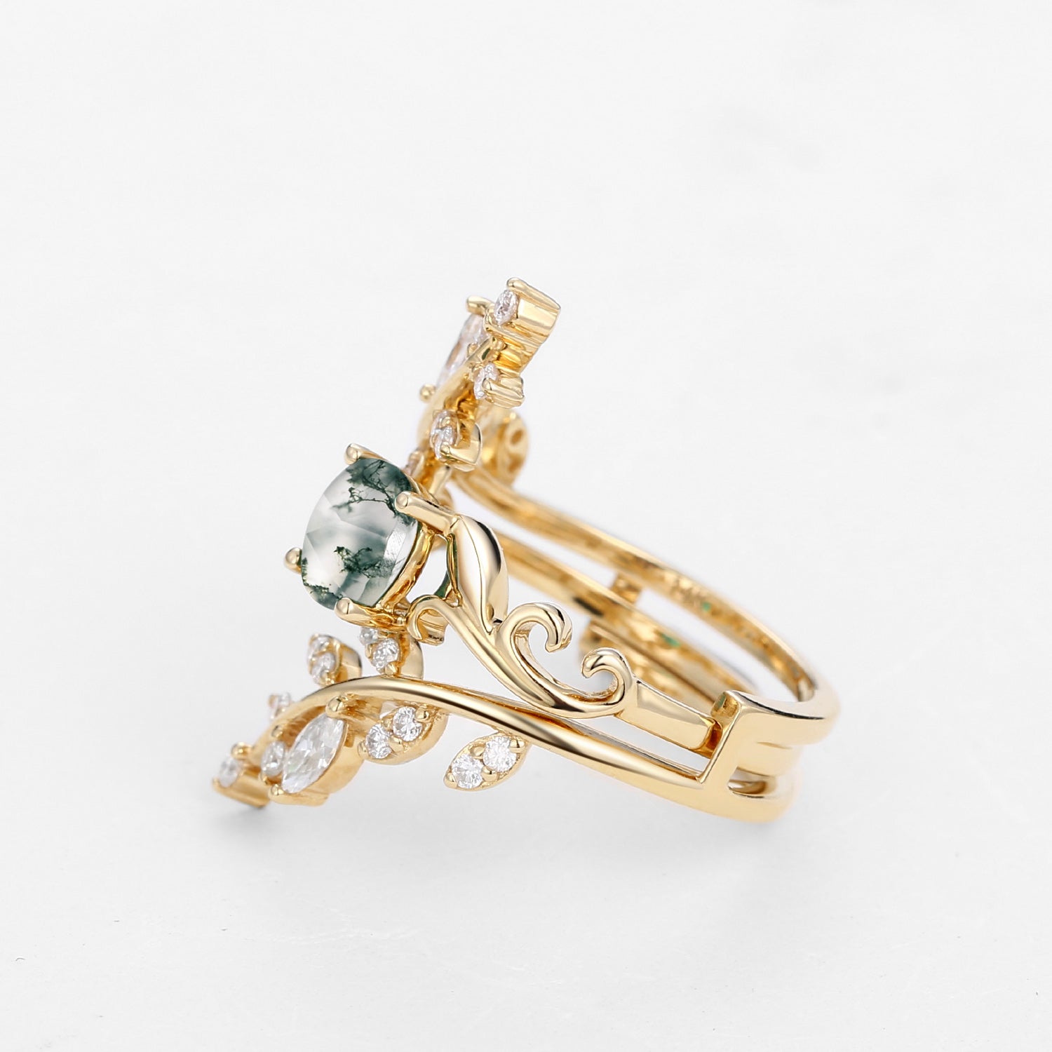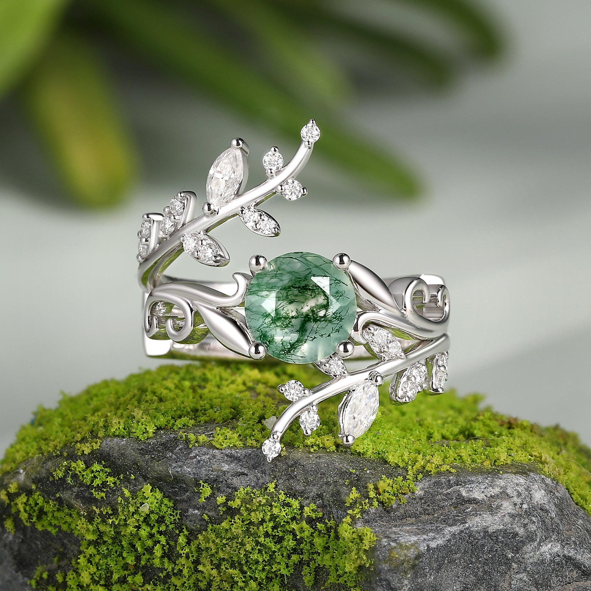 Round Shaped Vine Moss Agate Engagement Ring Sets 2PCS