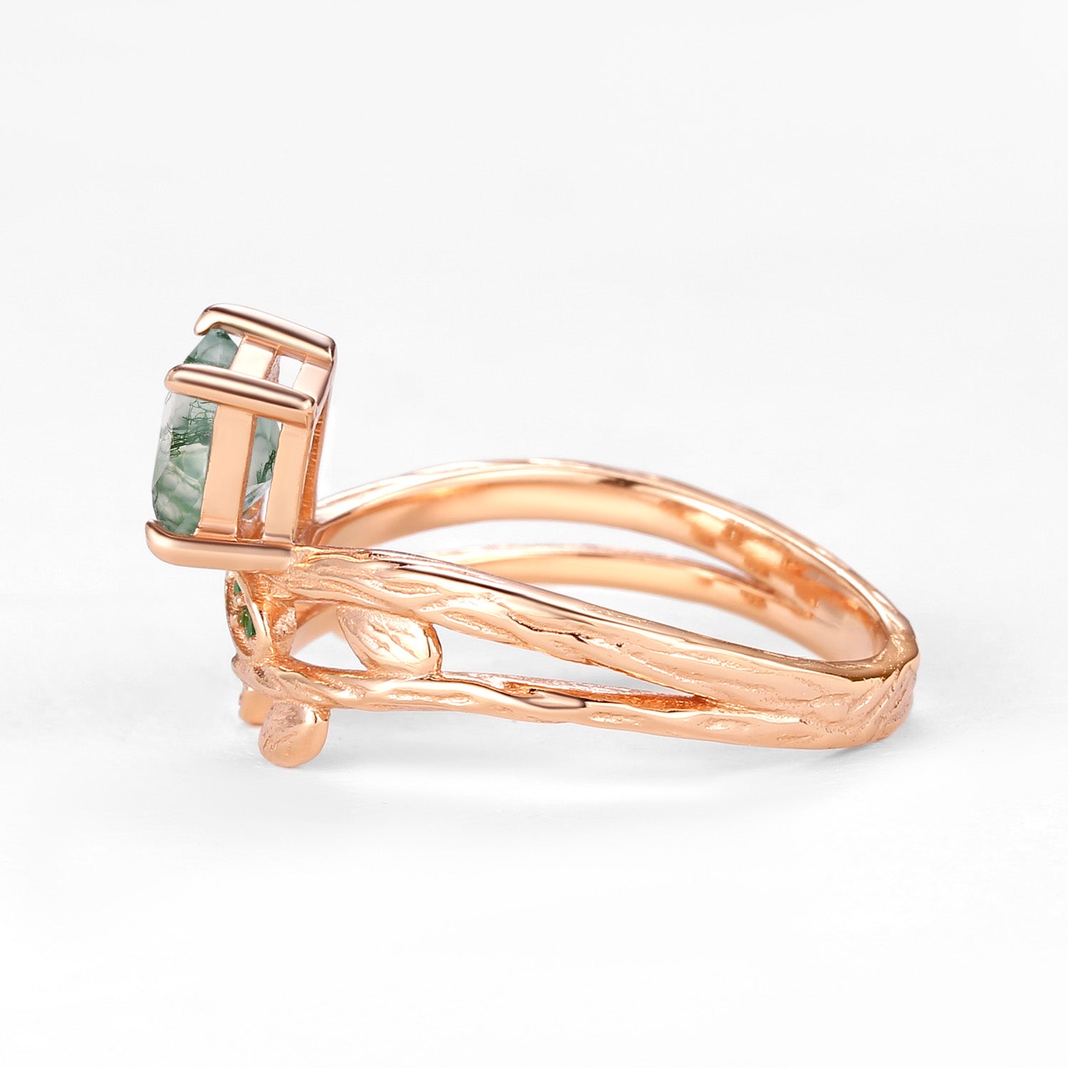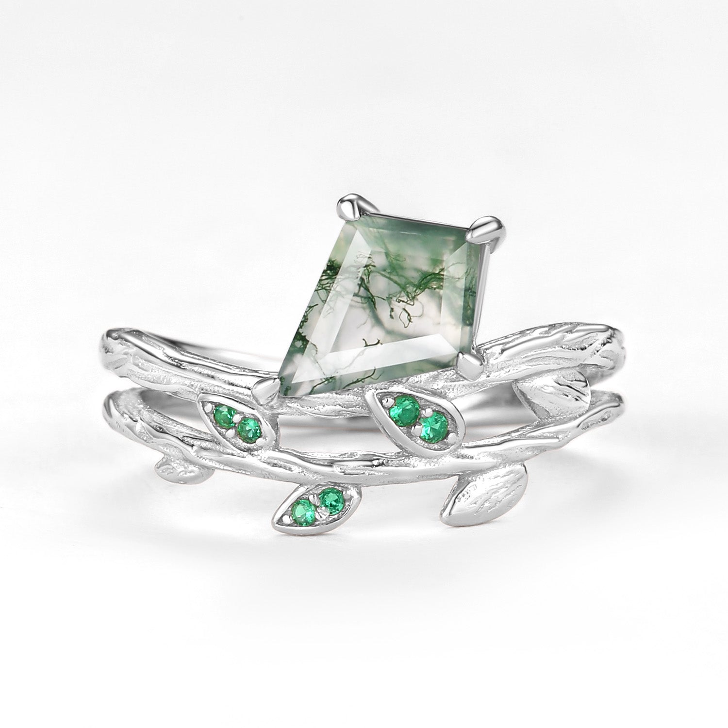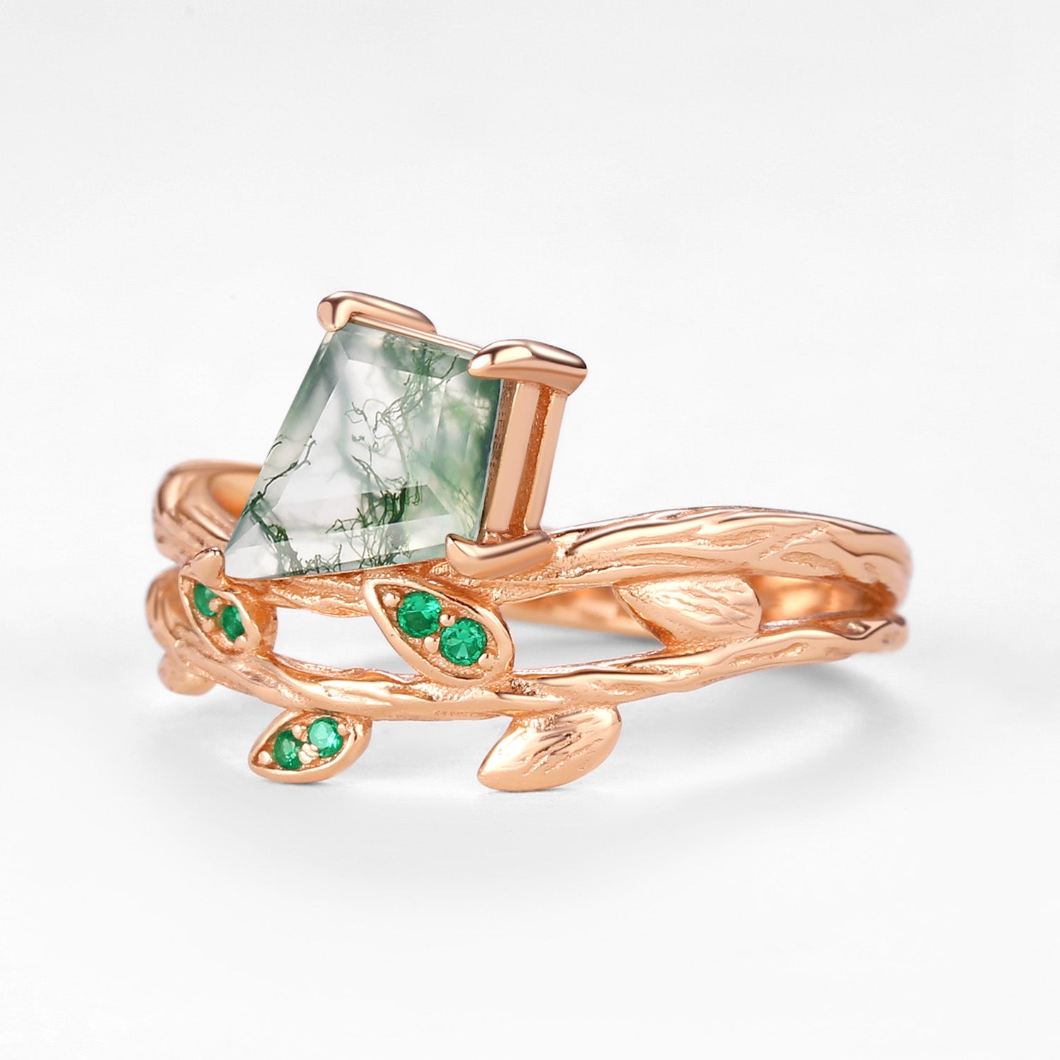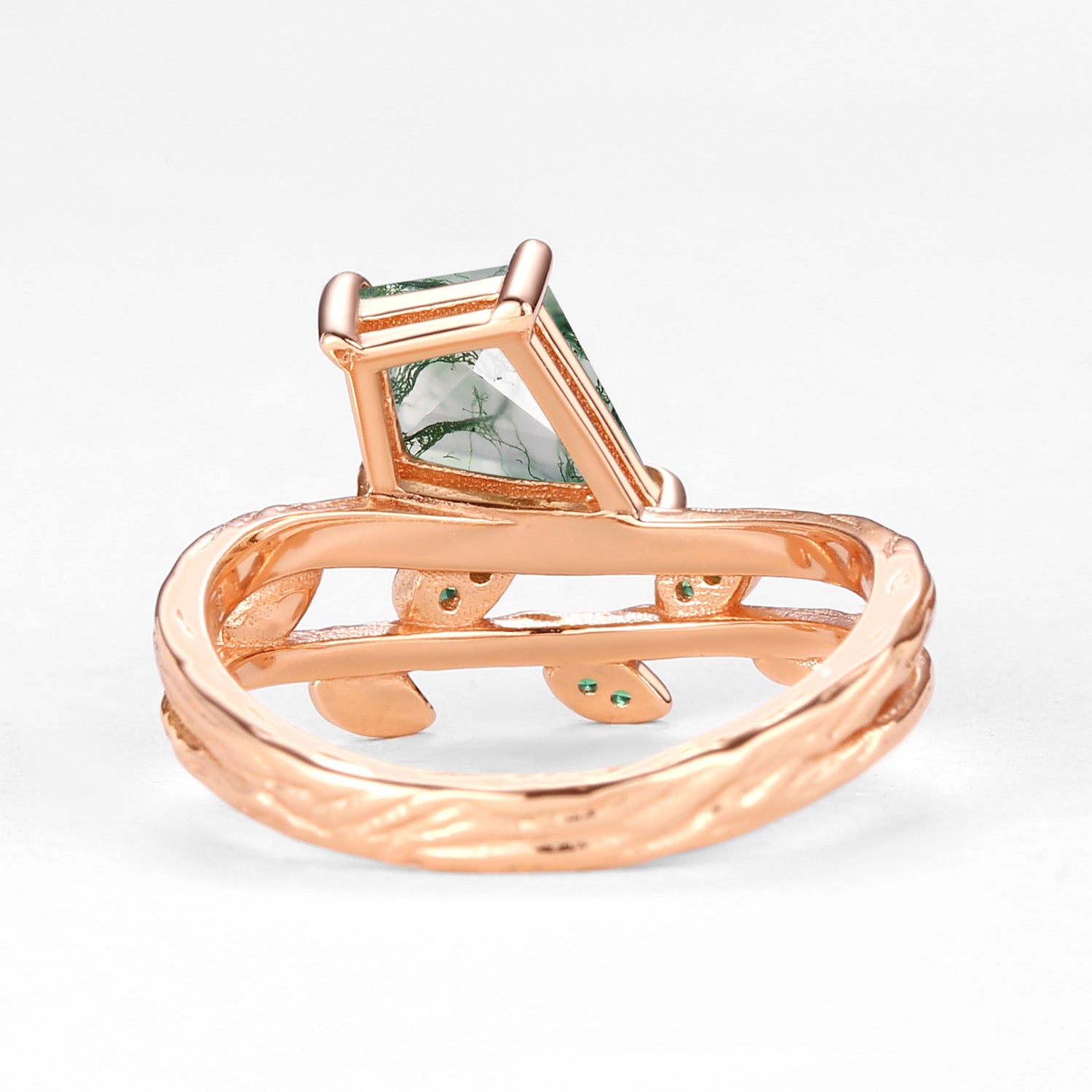 Unique Kite Cut Moss Agate & Emerald Leafy Engagement Ring