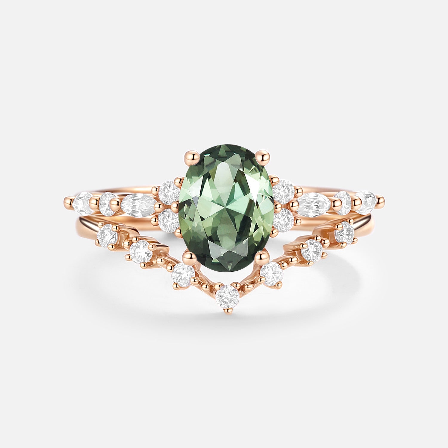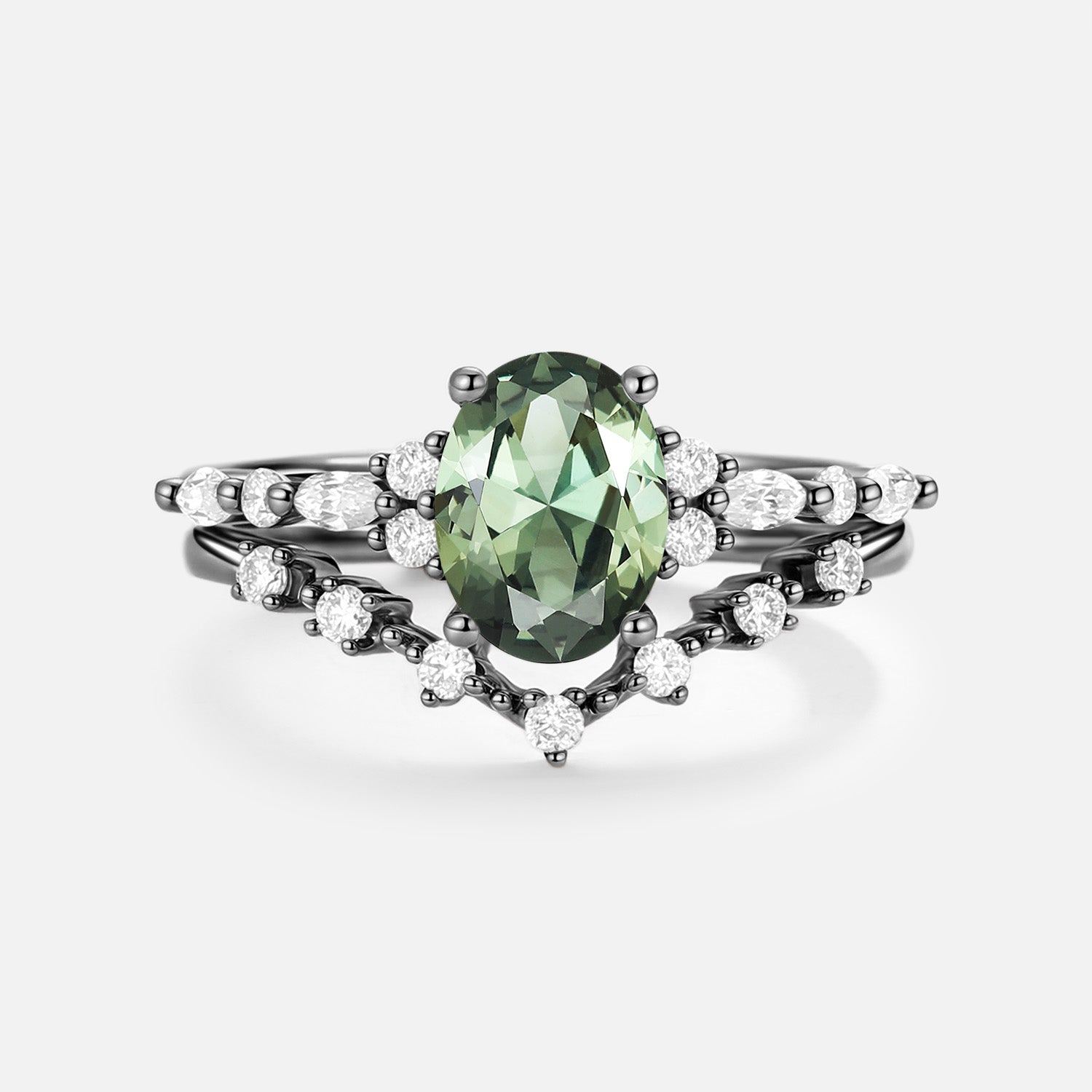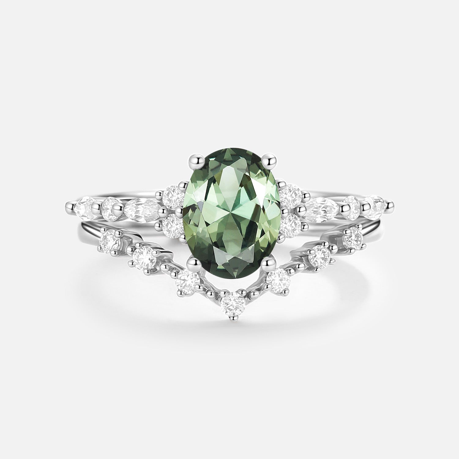 Oval Cut Lab Green Sapphire Classic Engagement Ring Set 2pcs