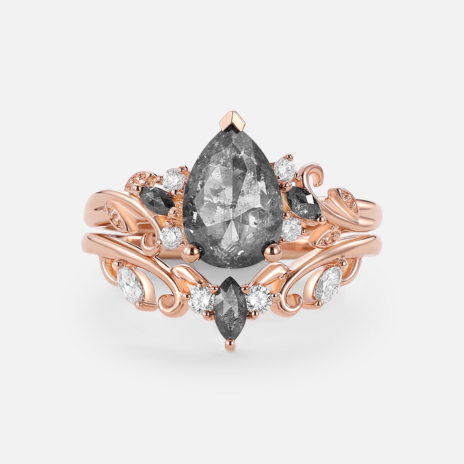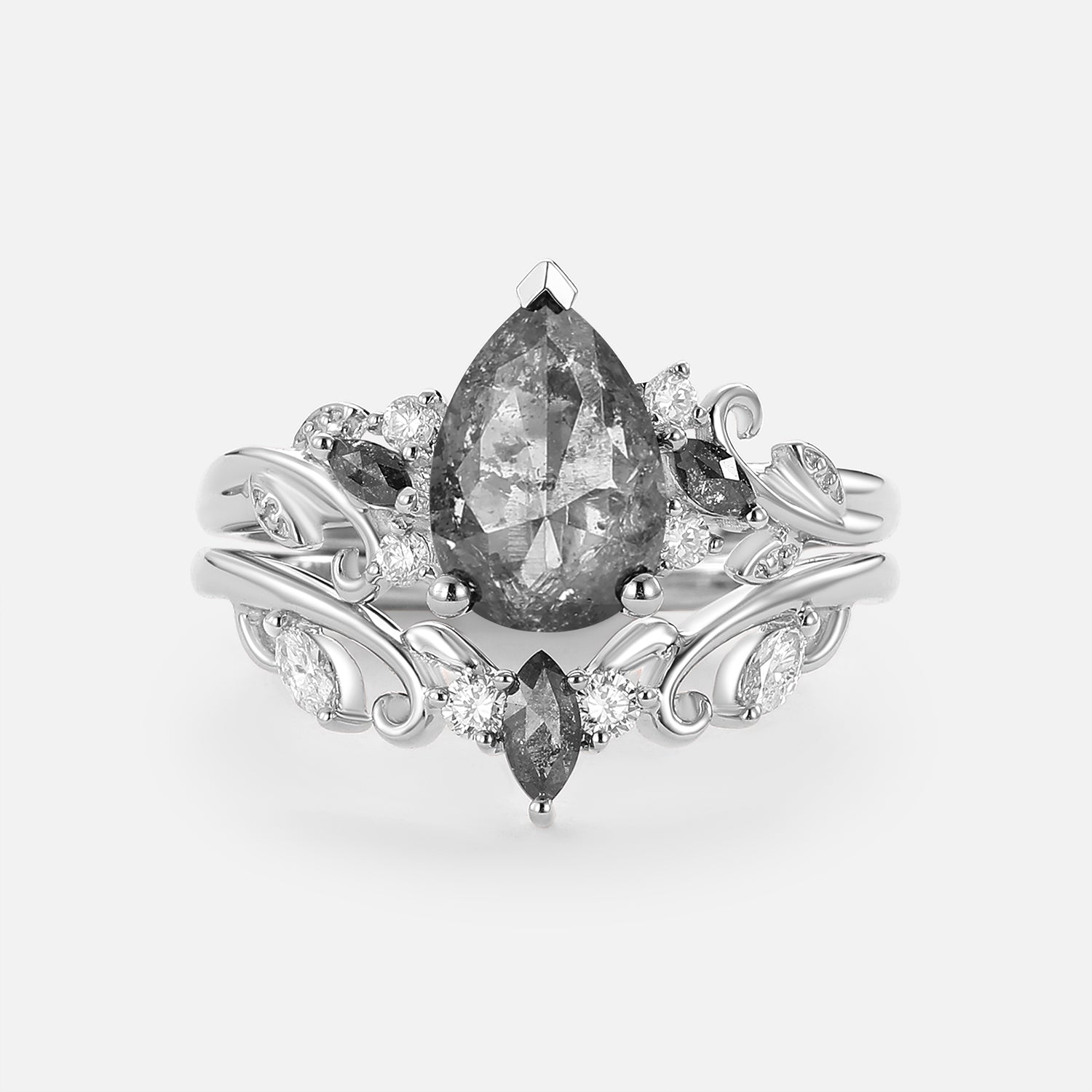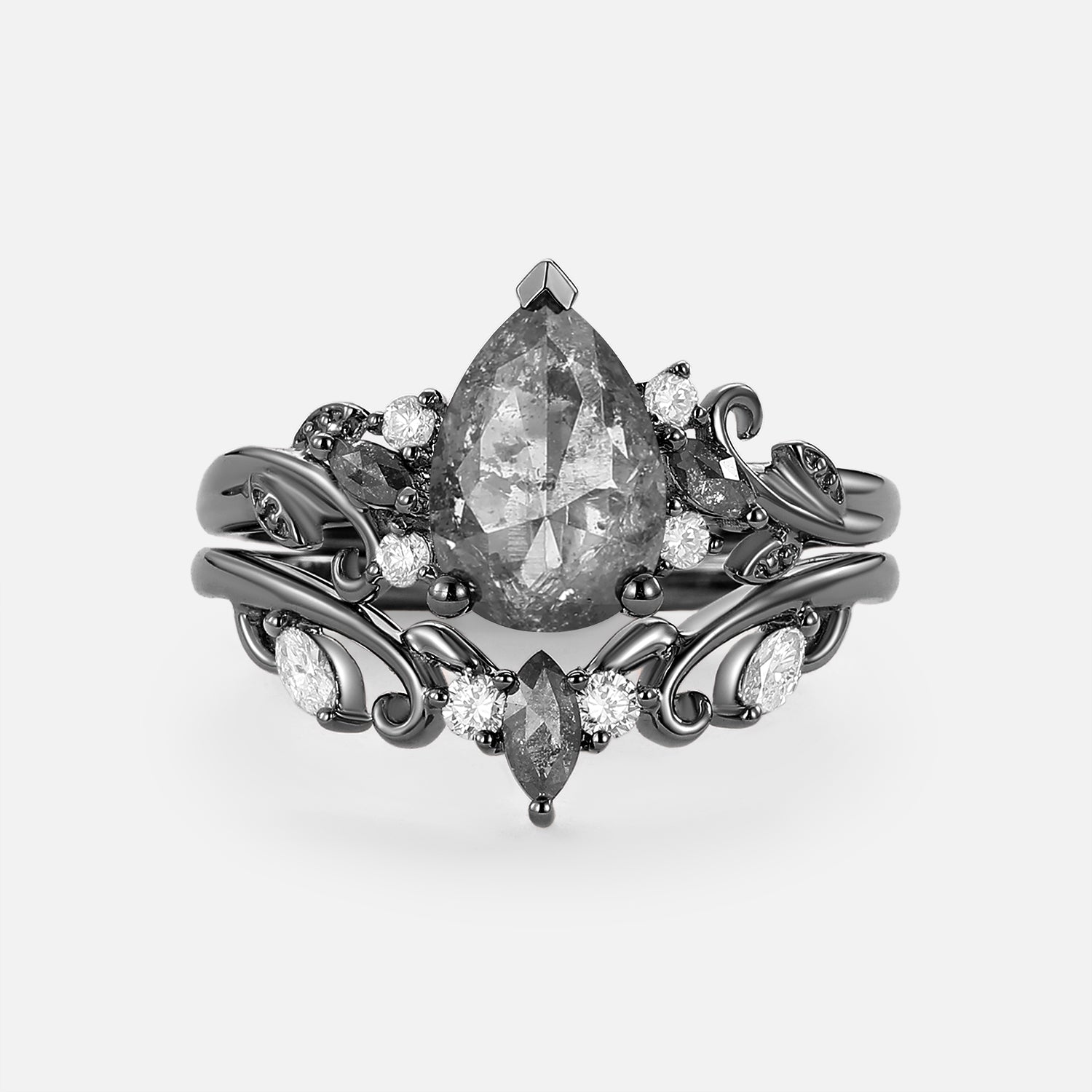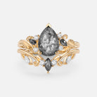 Pear Cut Leafy Salt and Pepper Diamonds Engagement Ring Sets 2pcs - Pyrrhus