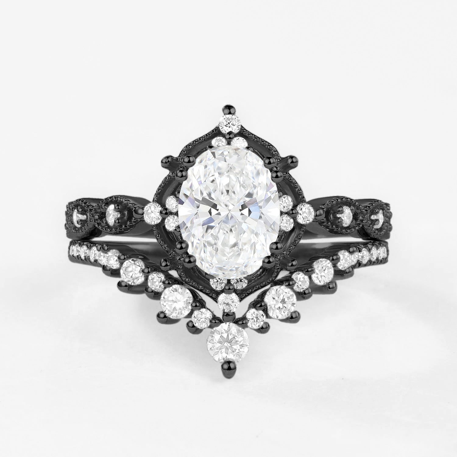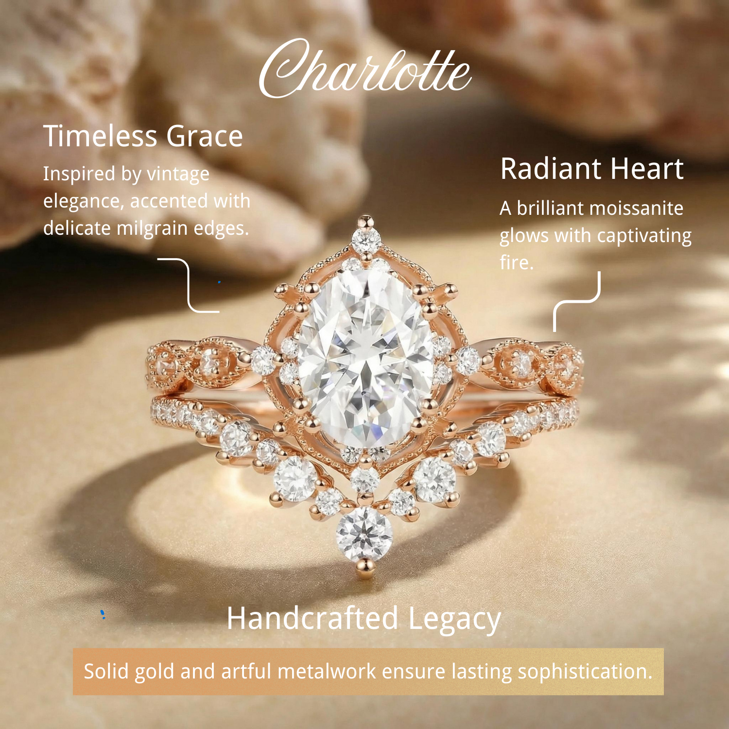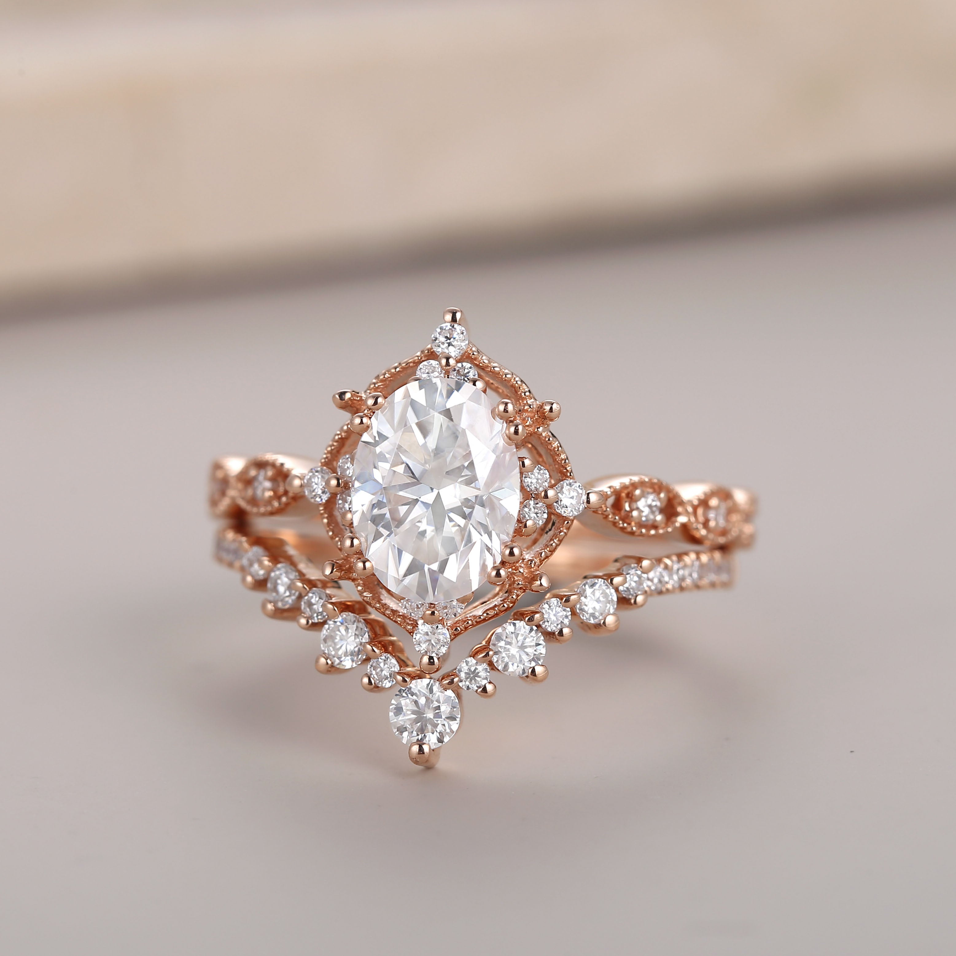 The ring set is our proudest and best-selling design by far. The beautifully crafted milgrain details and the moissanite accents truly serve the perfect amount of vintage vibes that is elegant and unique yet - not extra. A design that is suitable for every scene.