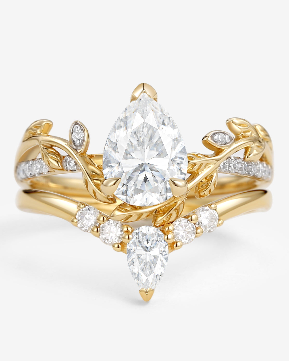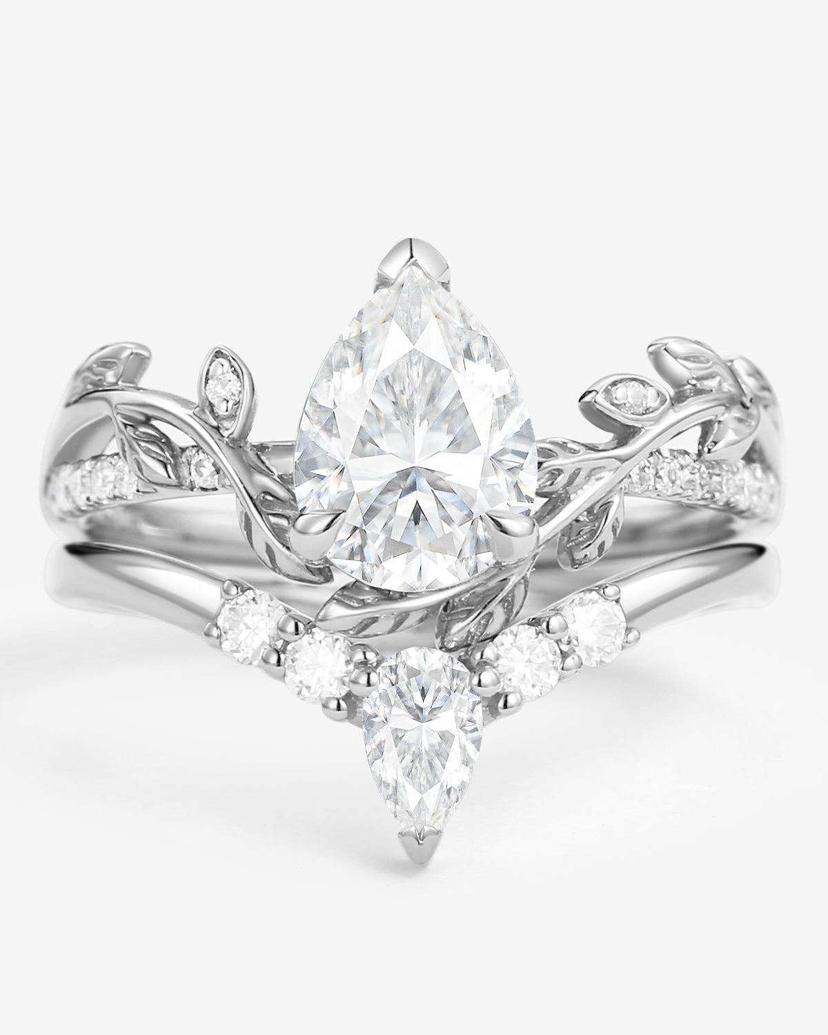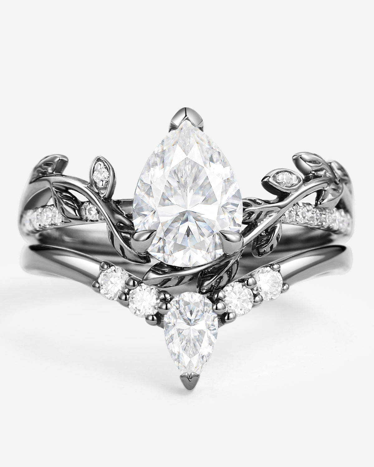 Like a dazzling star, this beautiful pear ring features lustrous pear cut moissanite that sparkles in the light. Pear-shaped engagement rings come in many styles, including cluster engagement rings, unique engagement rings, vintage engagement rings, and infinity halo engagement rings.