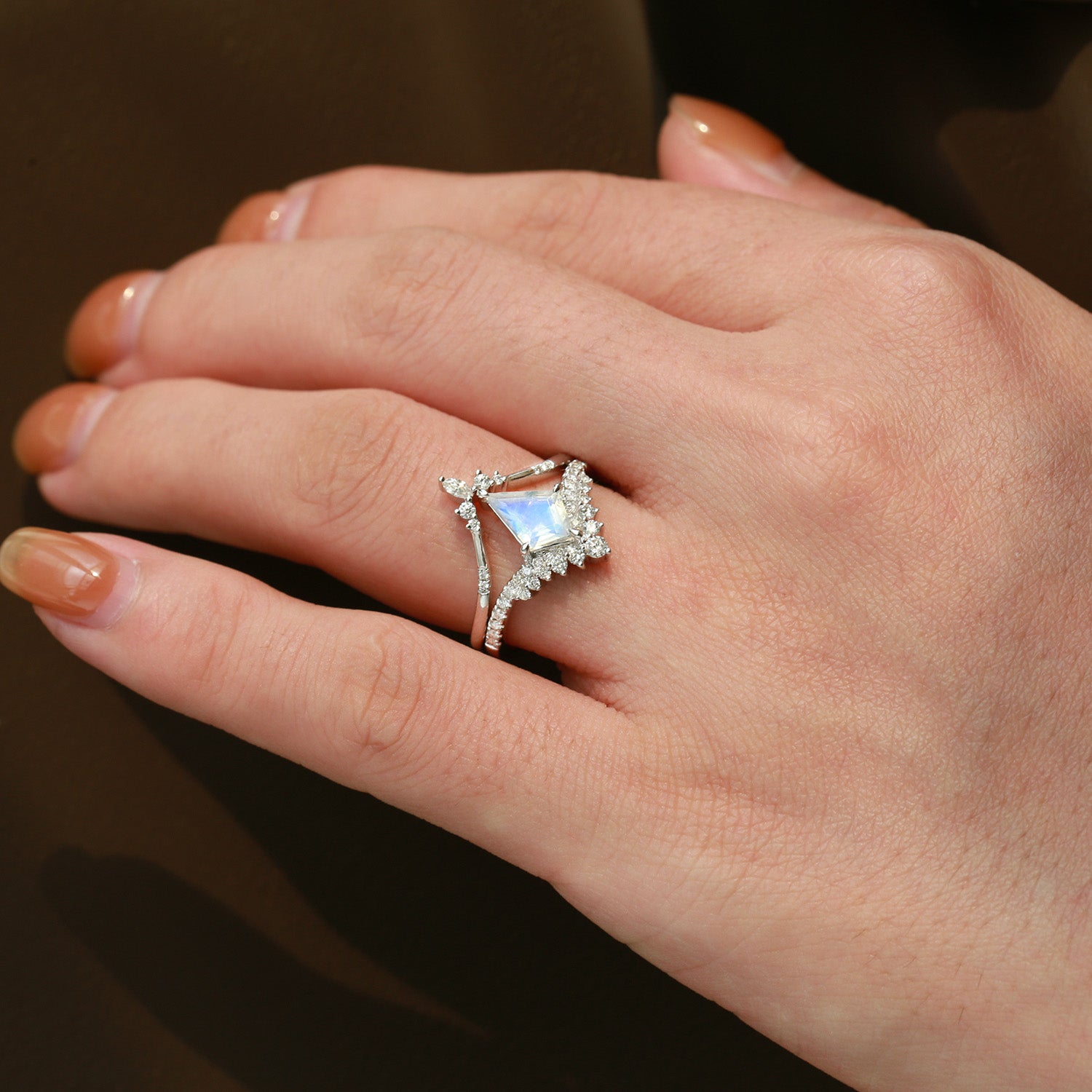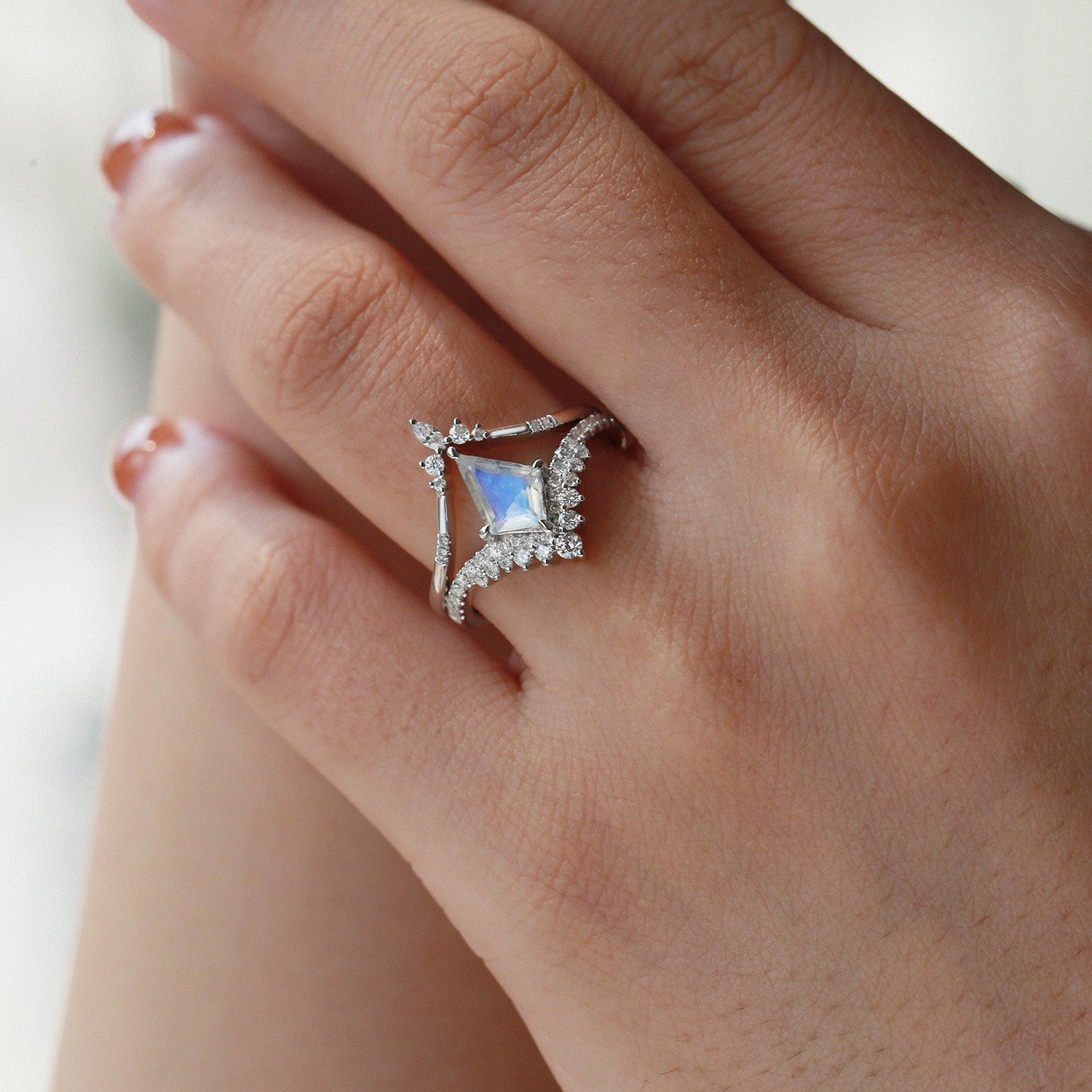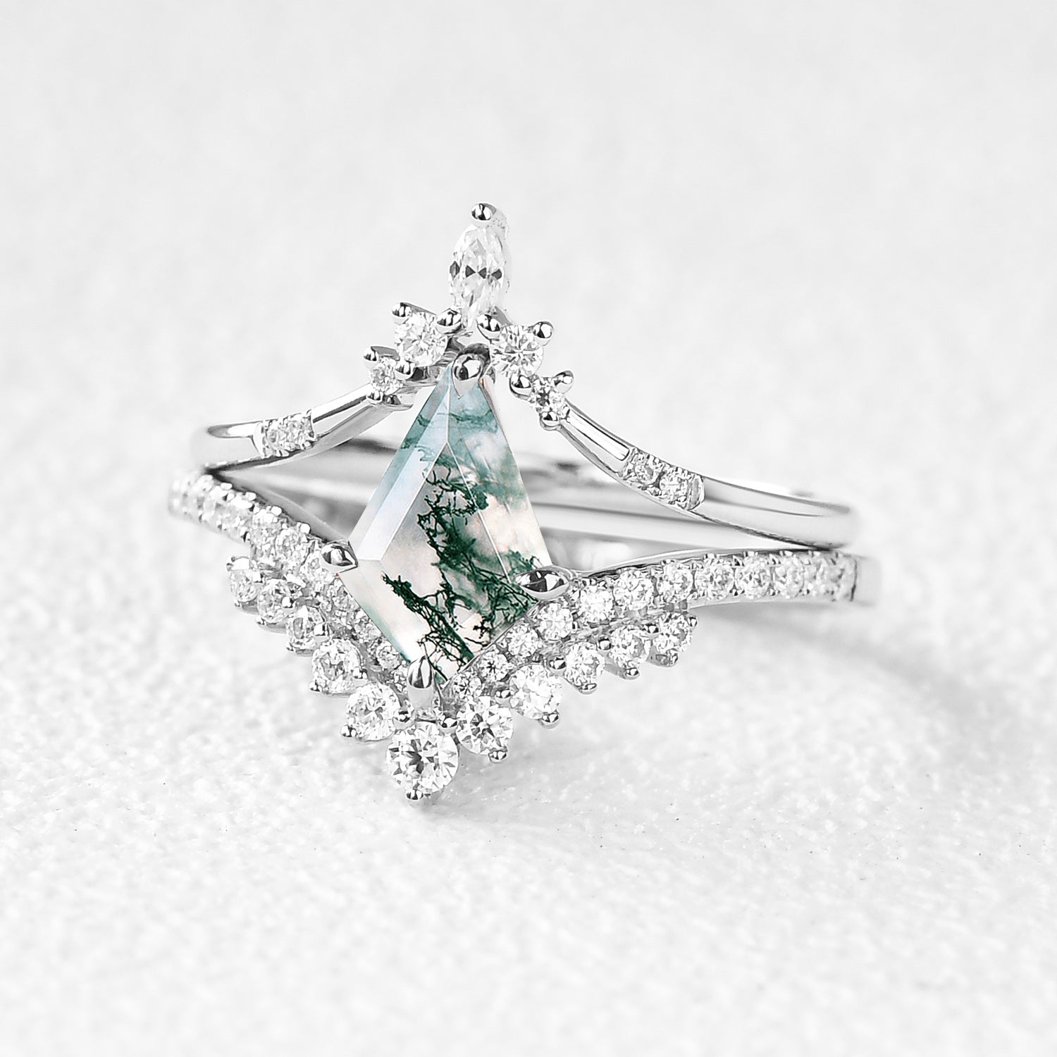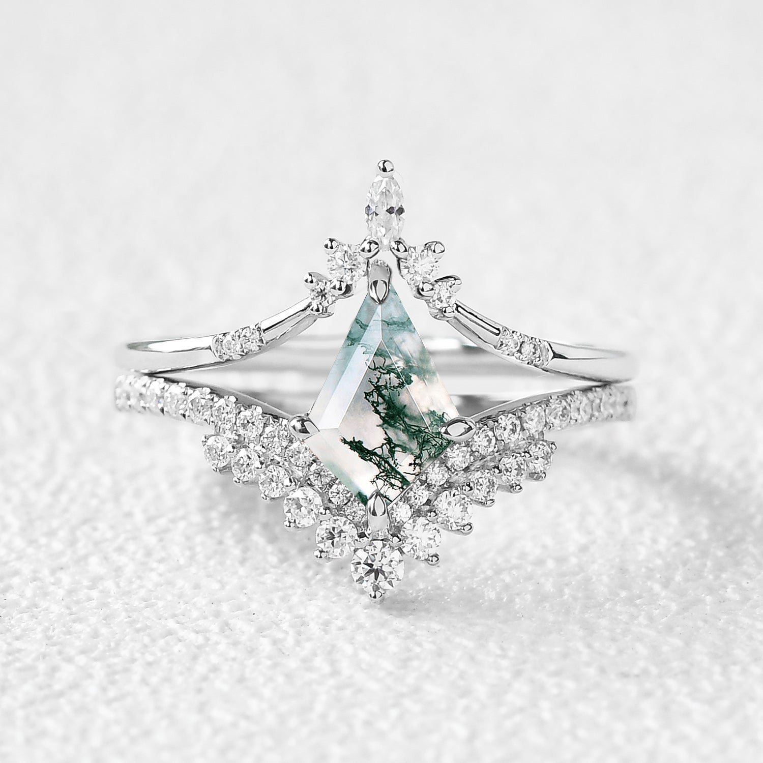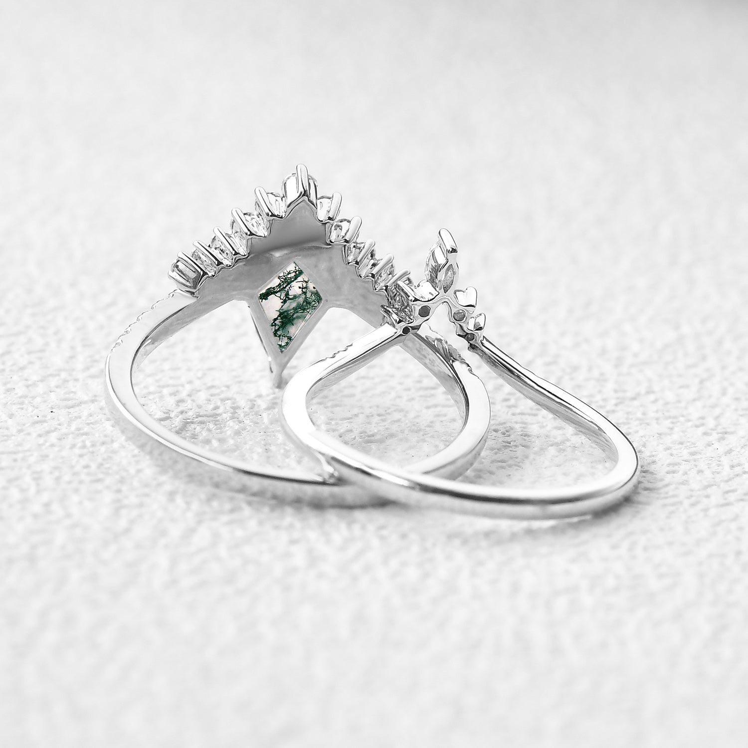 Felicegals Moss Agate & Moissanite Solid Gold Ring Set 2pcs Chevron V Shaped Moissanite Wedding Ring Set 2pcs