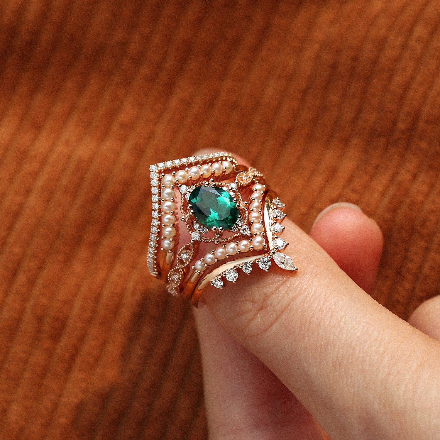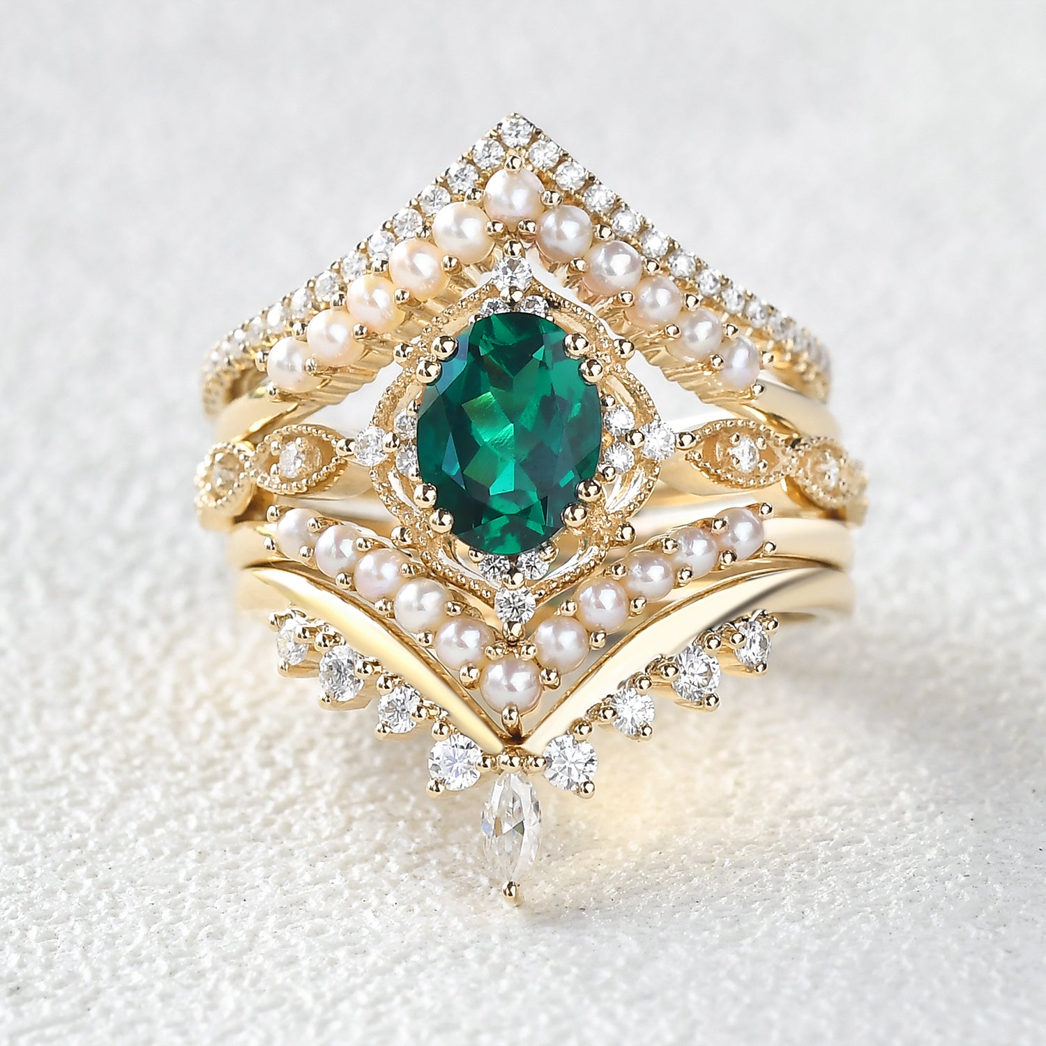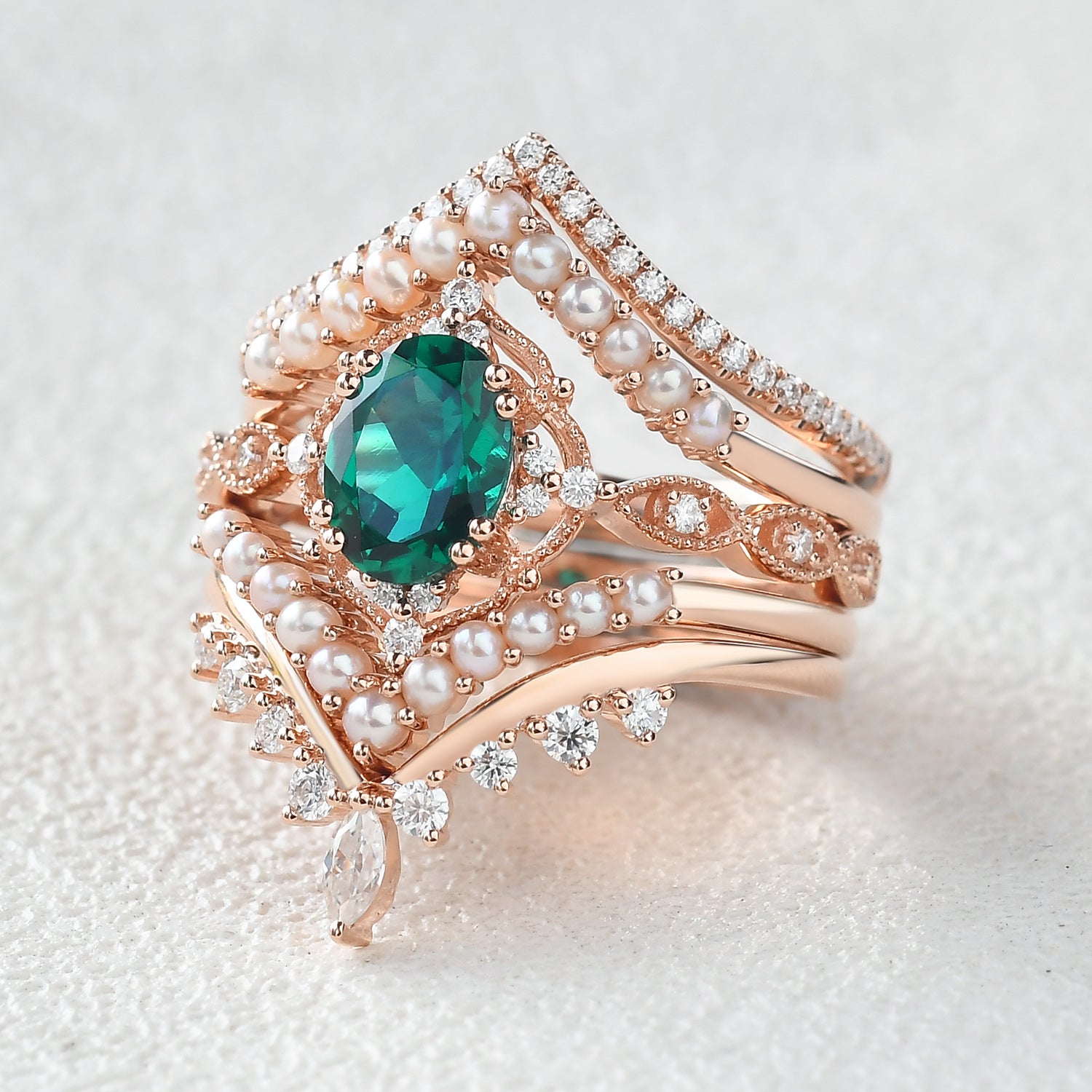 Felicegals 1.5ct Emerald Signature Vintage Extravaganza Ring Set 5pcsSet 3pcs Antique Oval Akoya Pearl Wedding Ring Vine Vintage Inspired Ring Art Deco Curved Moissanite Wedding Band