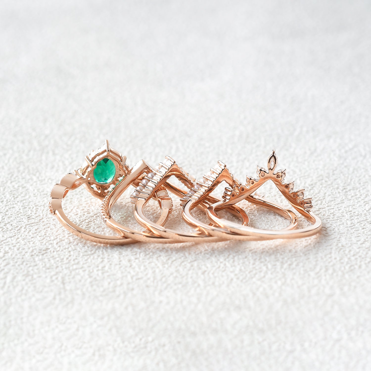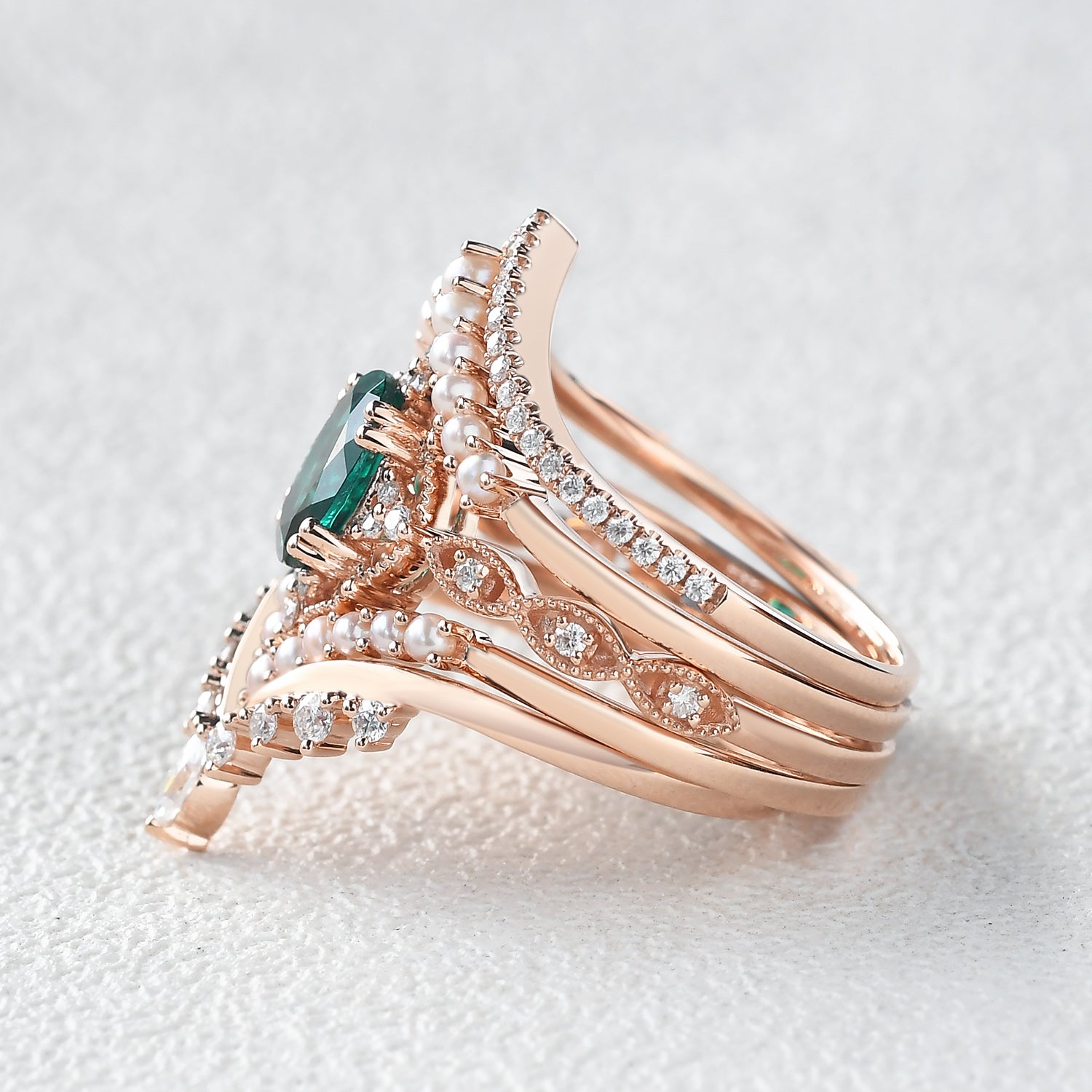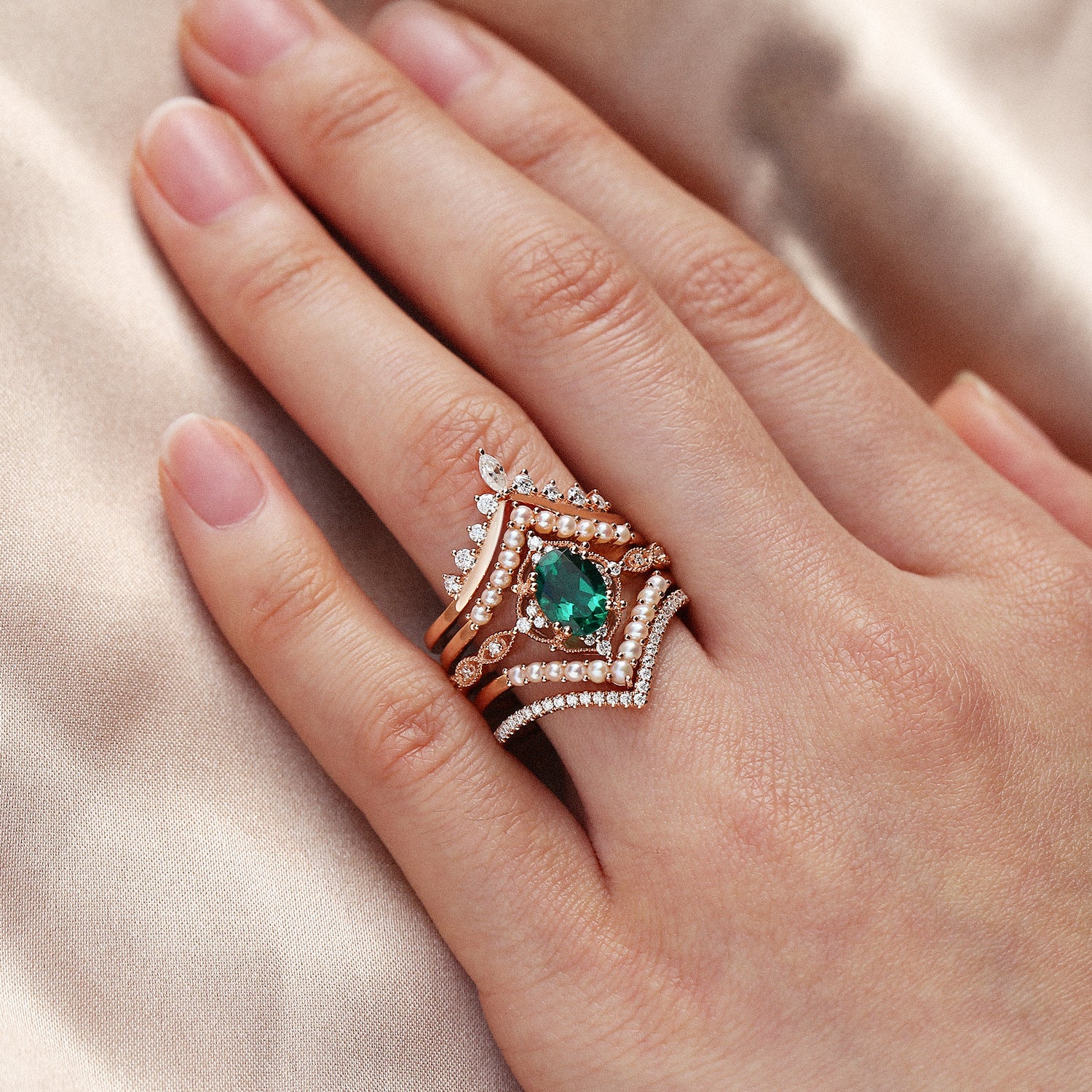 Felicegals 1.5ct Emerald Signature Vintage Extravaganza Ring Set 5pcsSet 3pcs Antique Oval Akoya Pearl Wedding Ring Vine Vintage Inspired Ring Art Deco Curved Moissanite Wedding Band