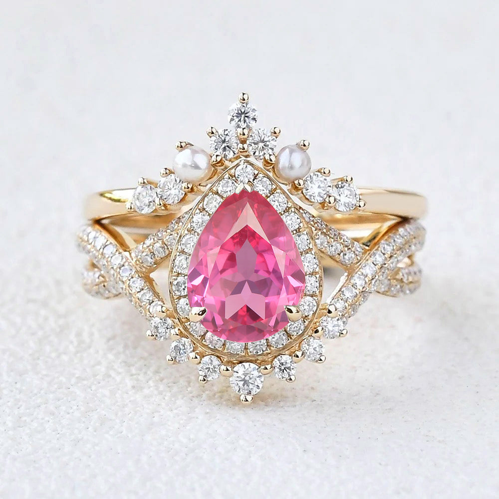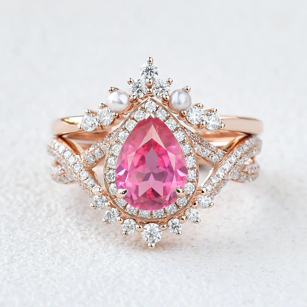 1.5ct Pear Rose Quartz Vintage Halo Infinity Ring Set 2pcs - Katherine