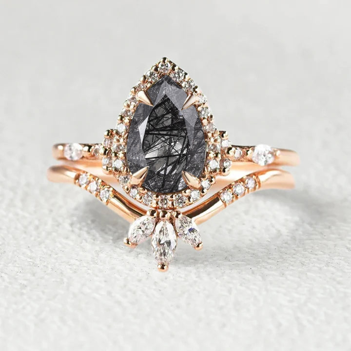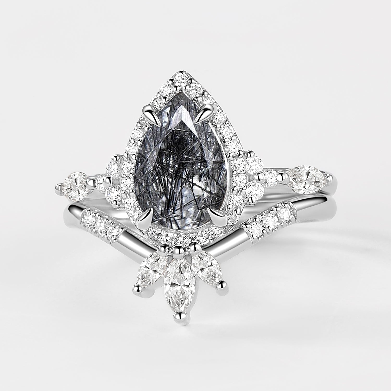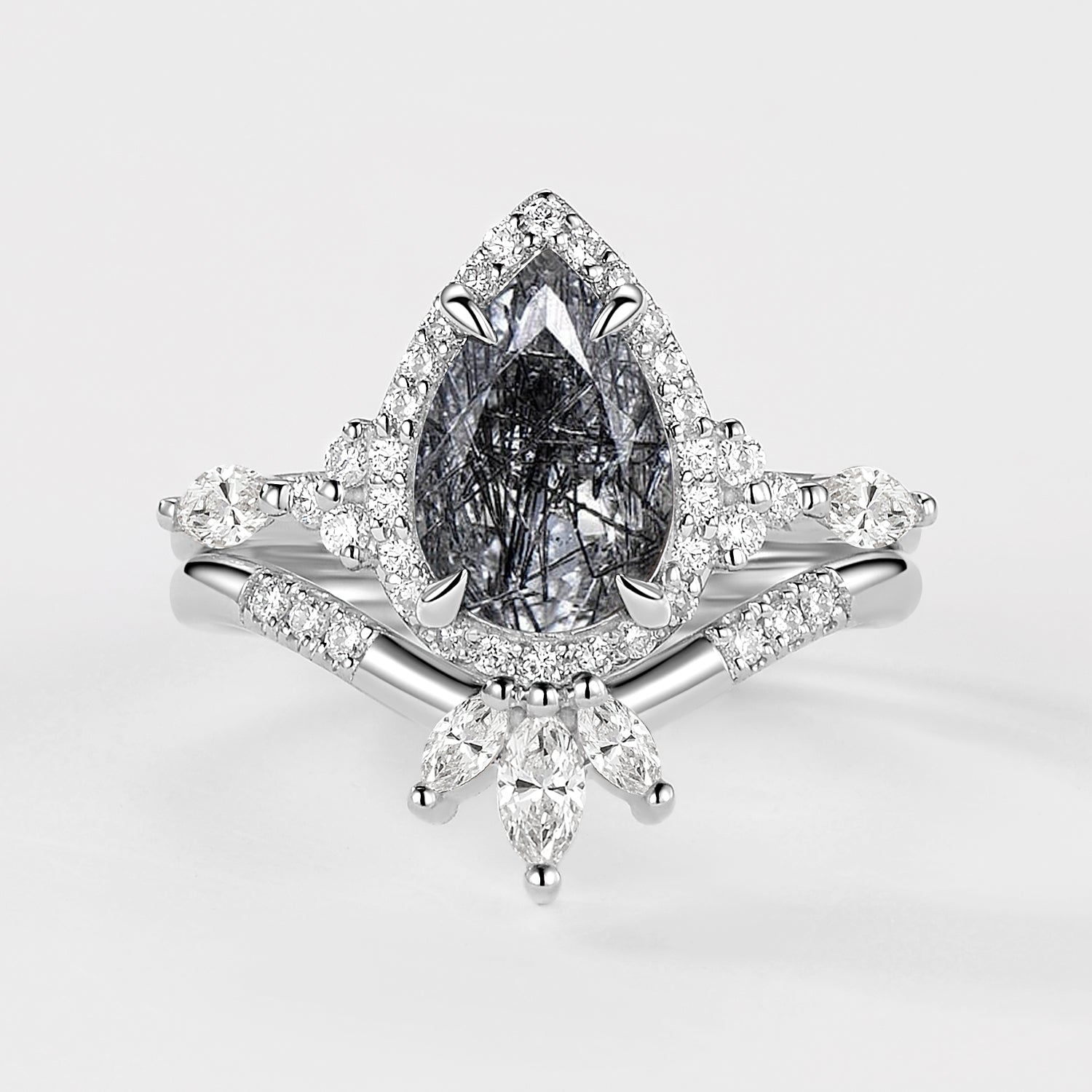 1.5ct Pear Shaped Black Rutilated Quartz Halo Ring Set 2pcs