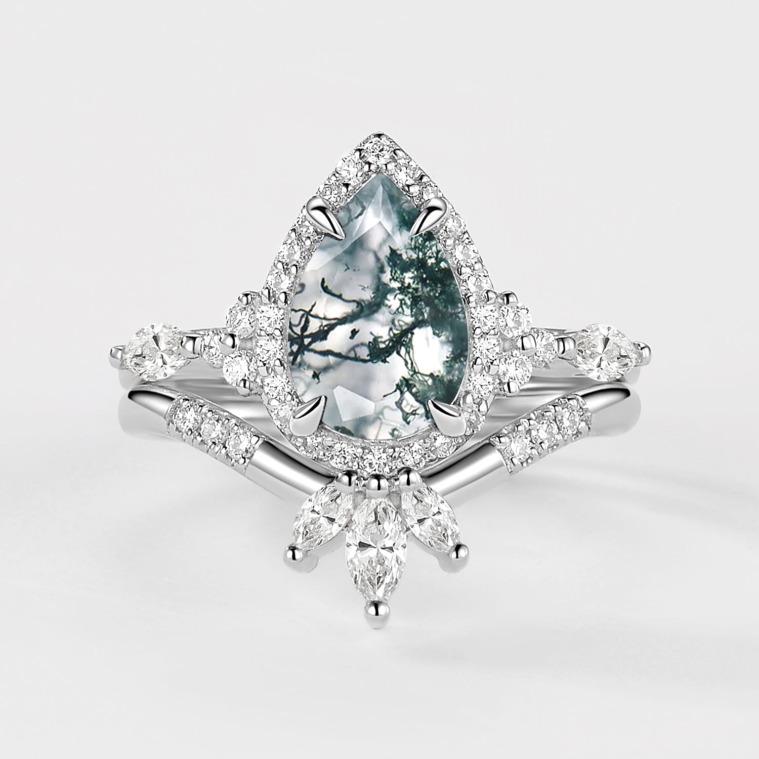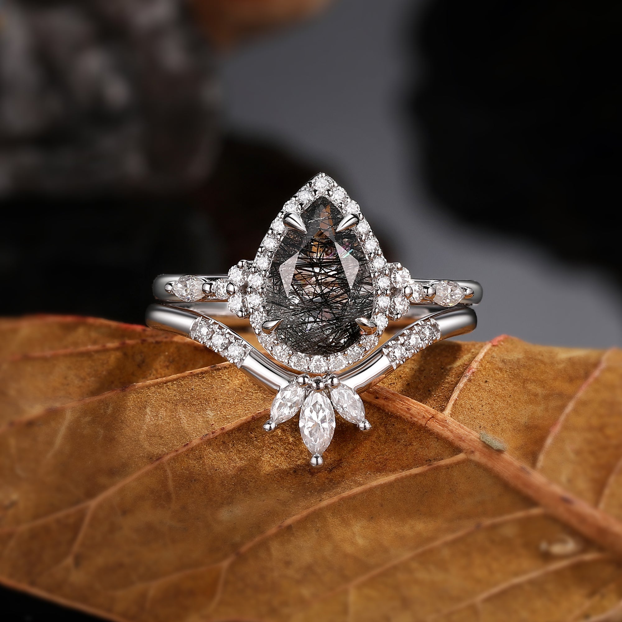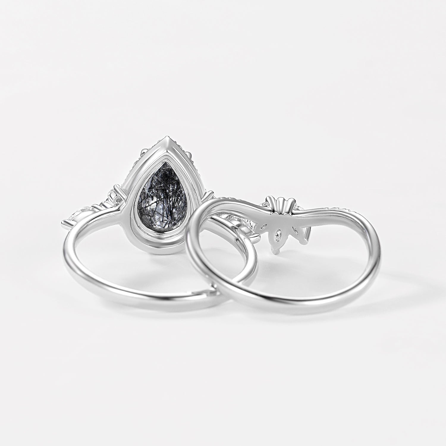1.5ct Pear Shaped Black Rutilated Quartz Halo Ring Set 2pcs