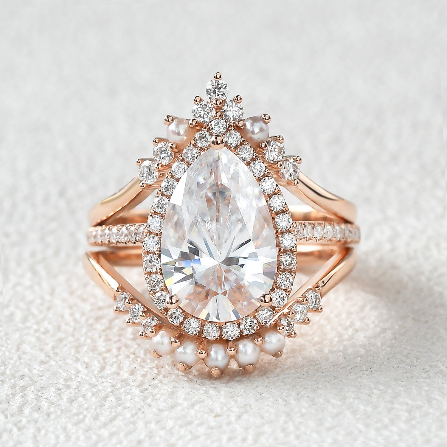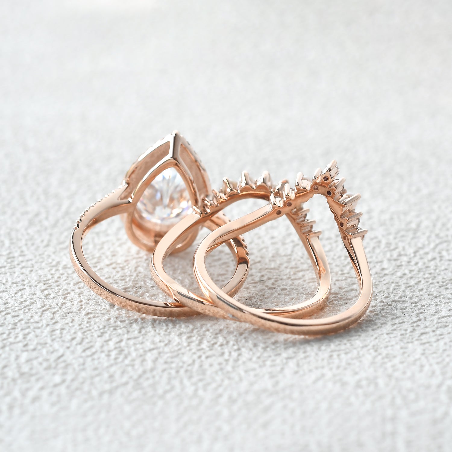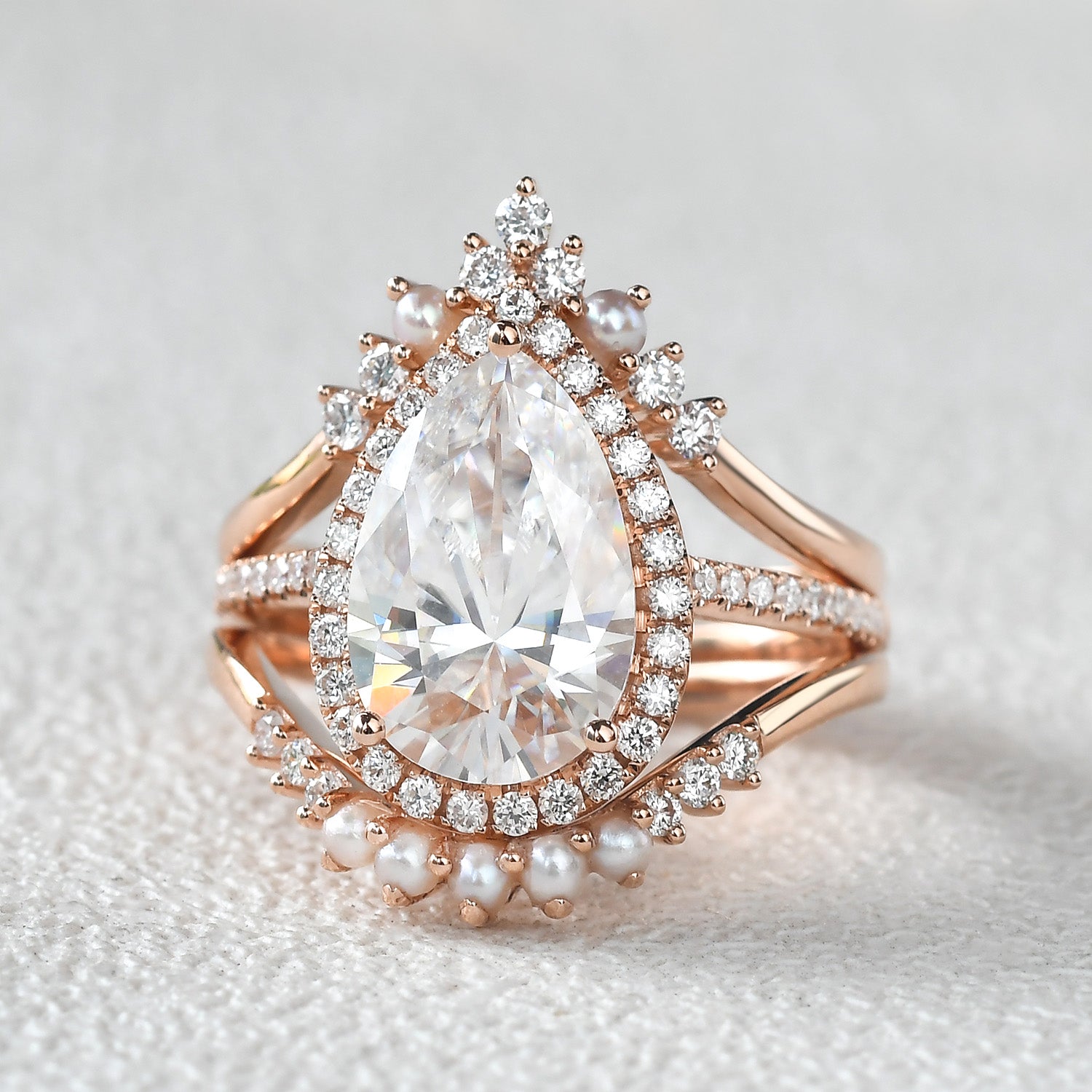 Felicegals 3.5ct Pear Shaped Moissanite Pearl-fect Engagement Rose Gold Ring Set 3pcs Colorless Moissanite Holo Wedding Ring Anniversary Gift