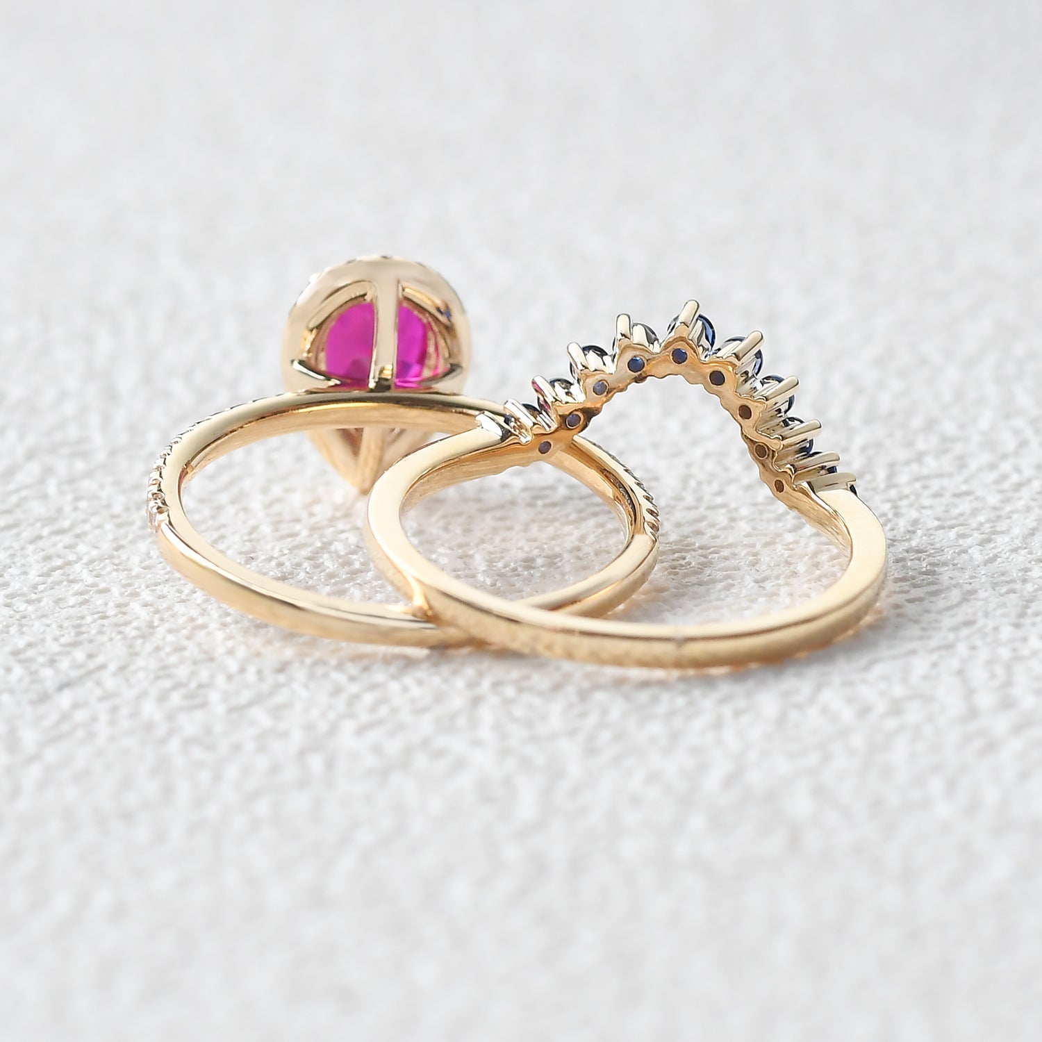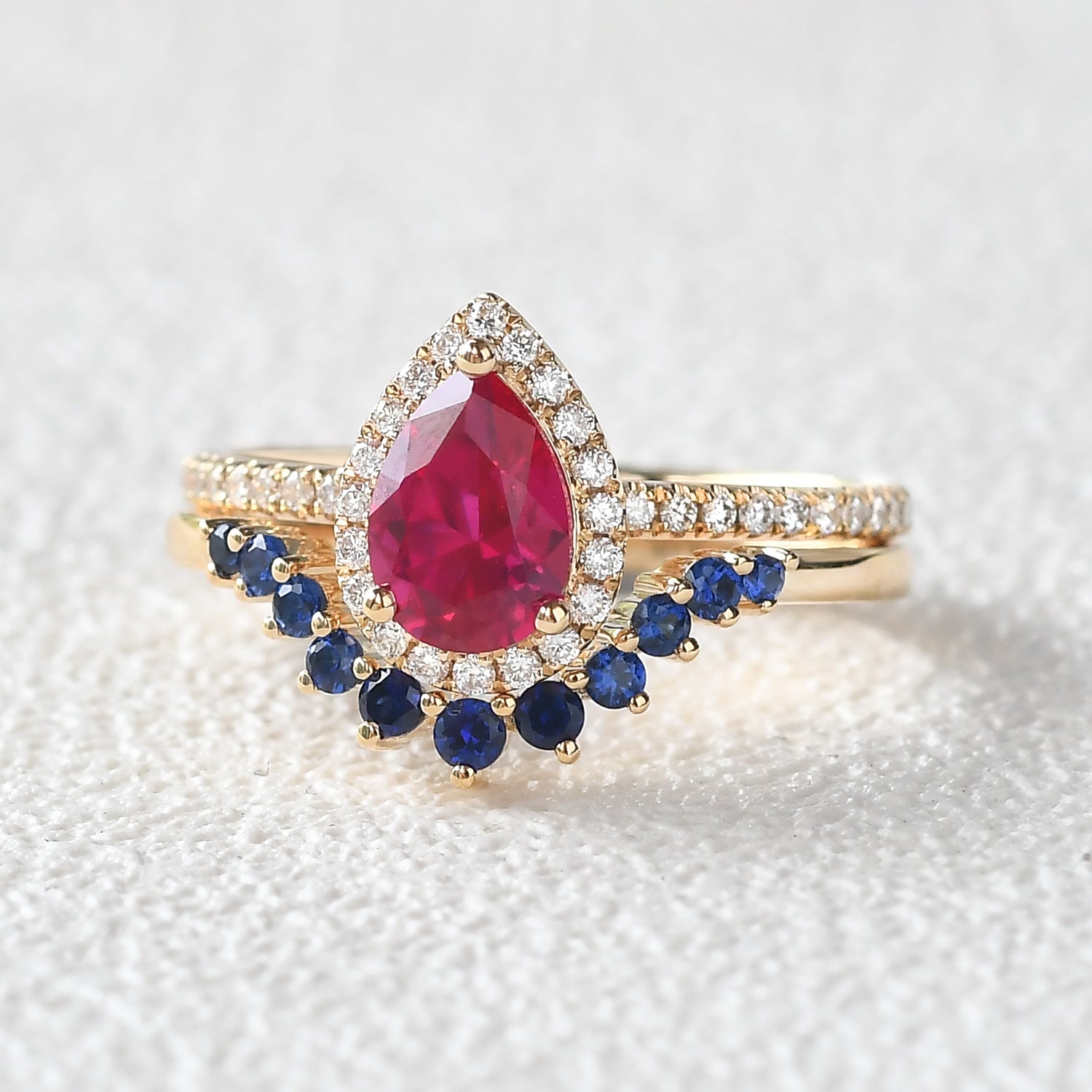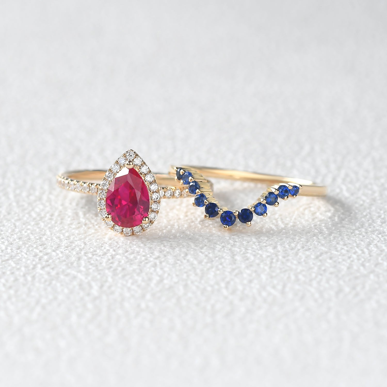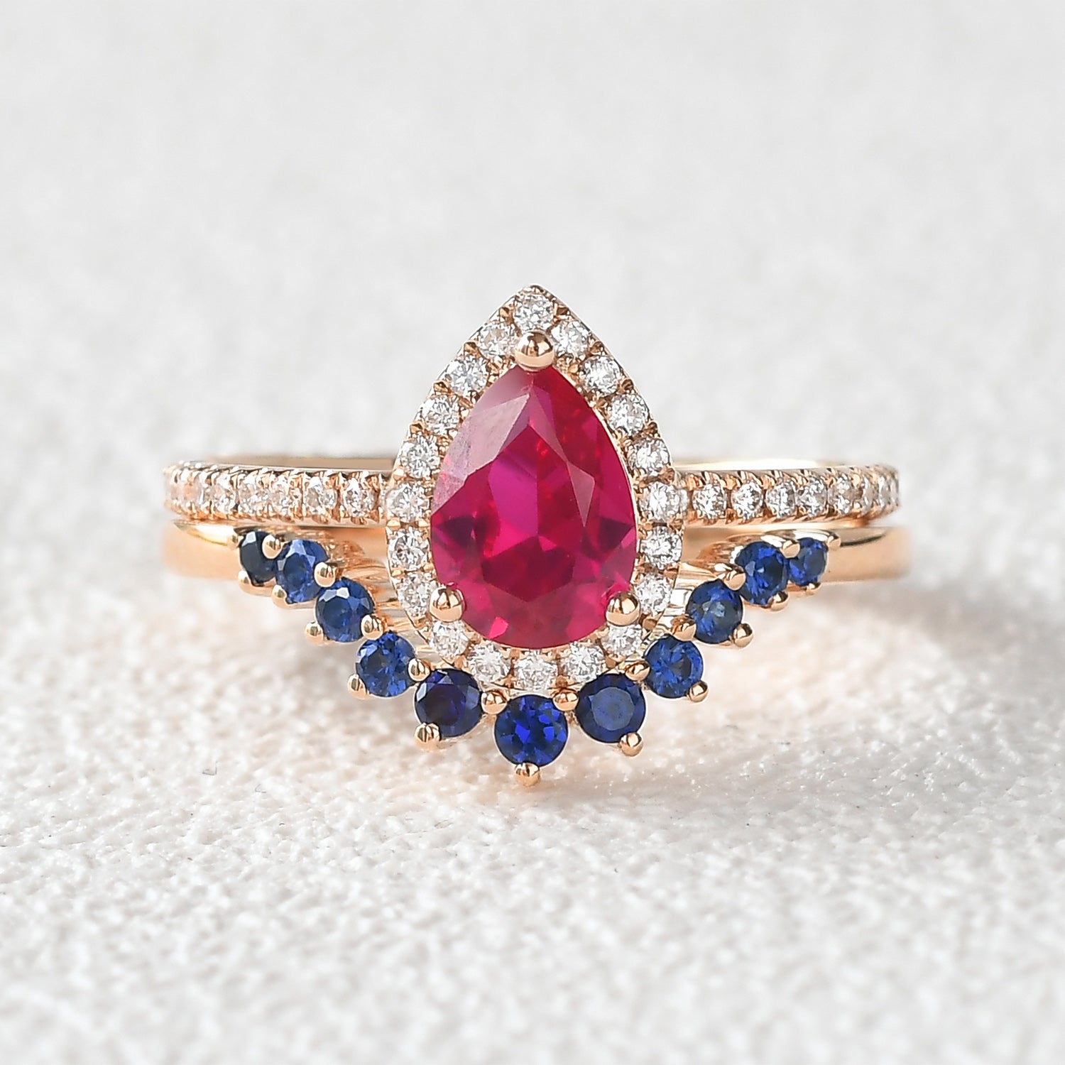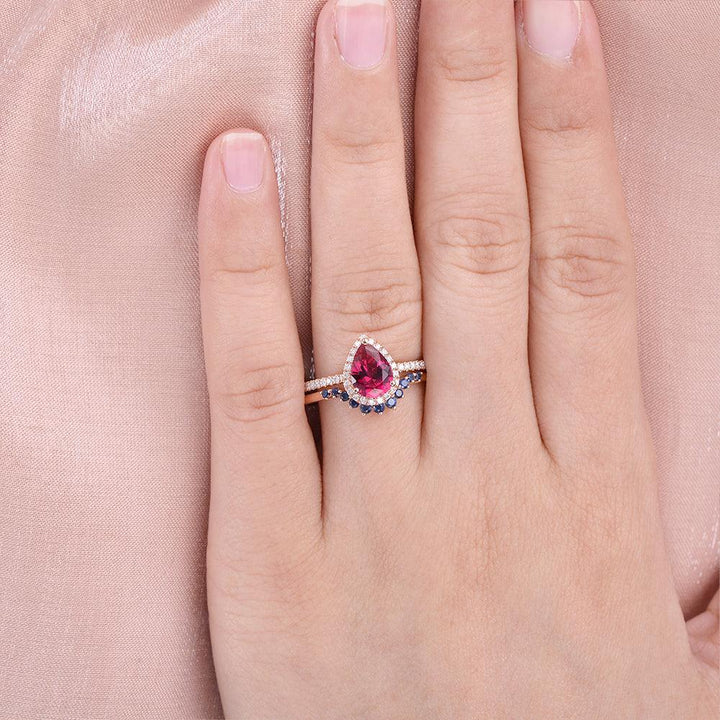 Art-Deco Pear Shaped Ruby Halo Ring Set 2pcs