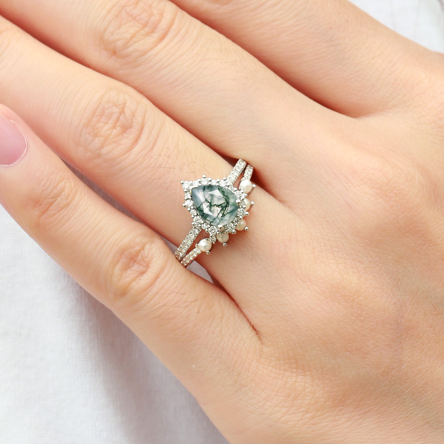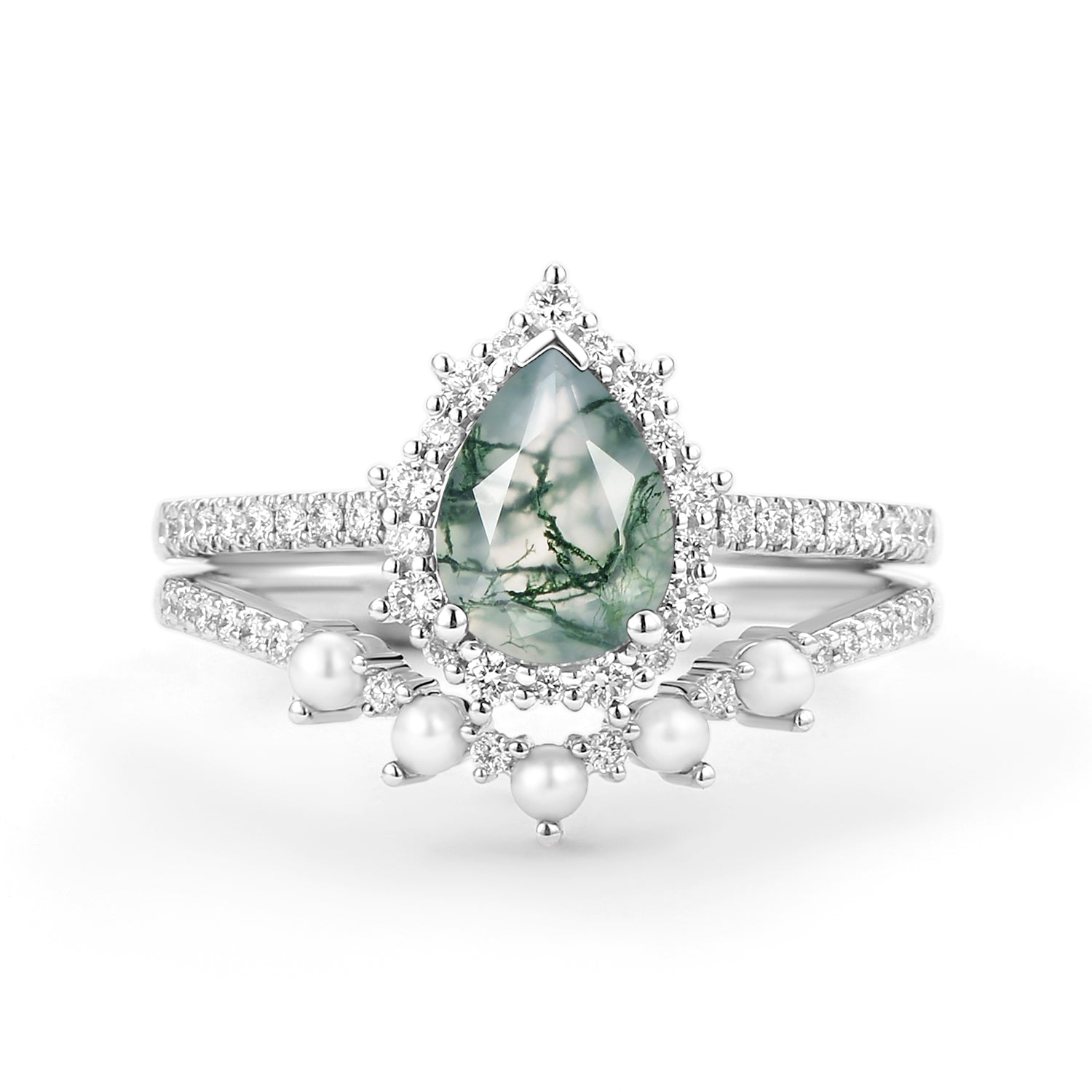 Halo Pear Shaped Moss Agate Pearl Ring Set 2pcs - Ophelia