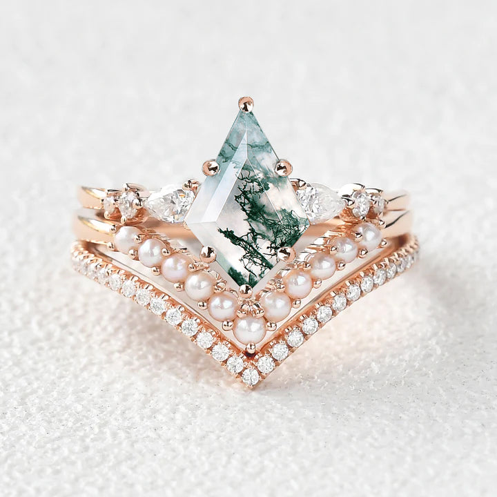 Kite Cut Moss Agate Pearl Stacking Engagement Bridal Set 3pcs