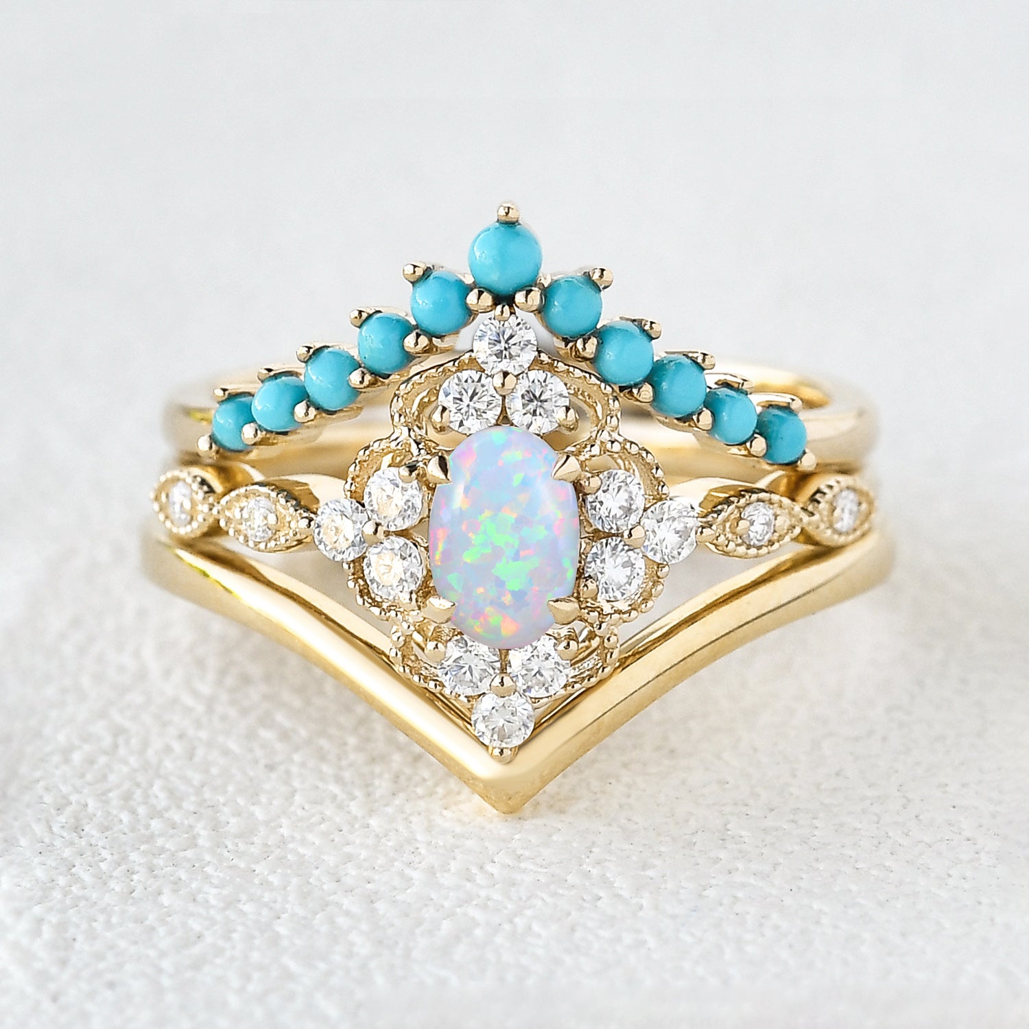 Felicegals Lab Opal & Turquoise Vintage Inspired Engagement Ring Set 3pcs Chevron Turquoise Stacking Wedding Band Art Deco Bridal Anniversary Gift Promise Vintage Inspired Style