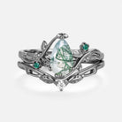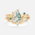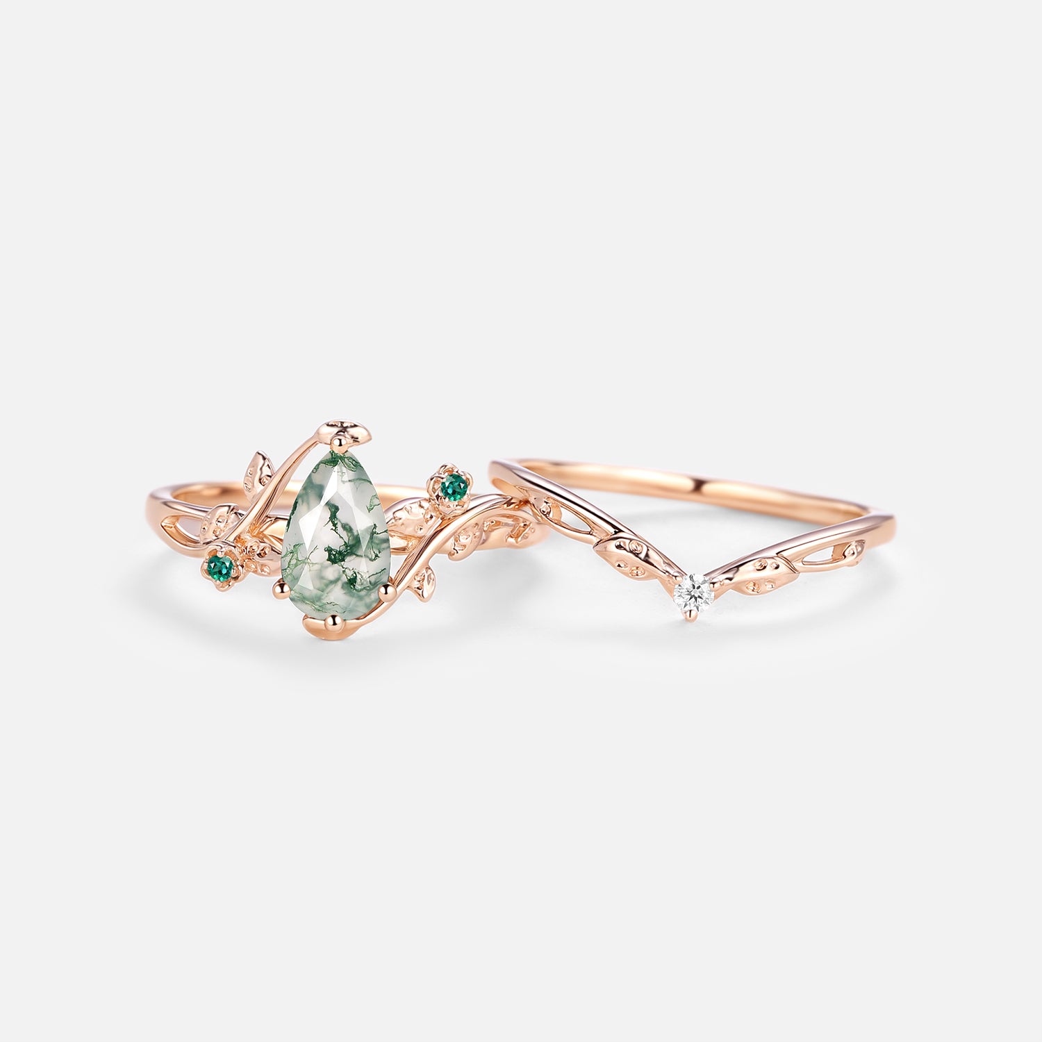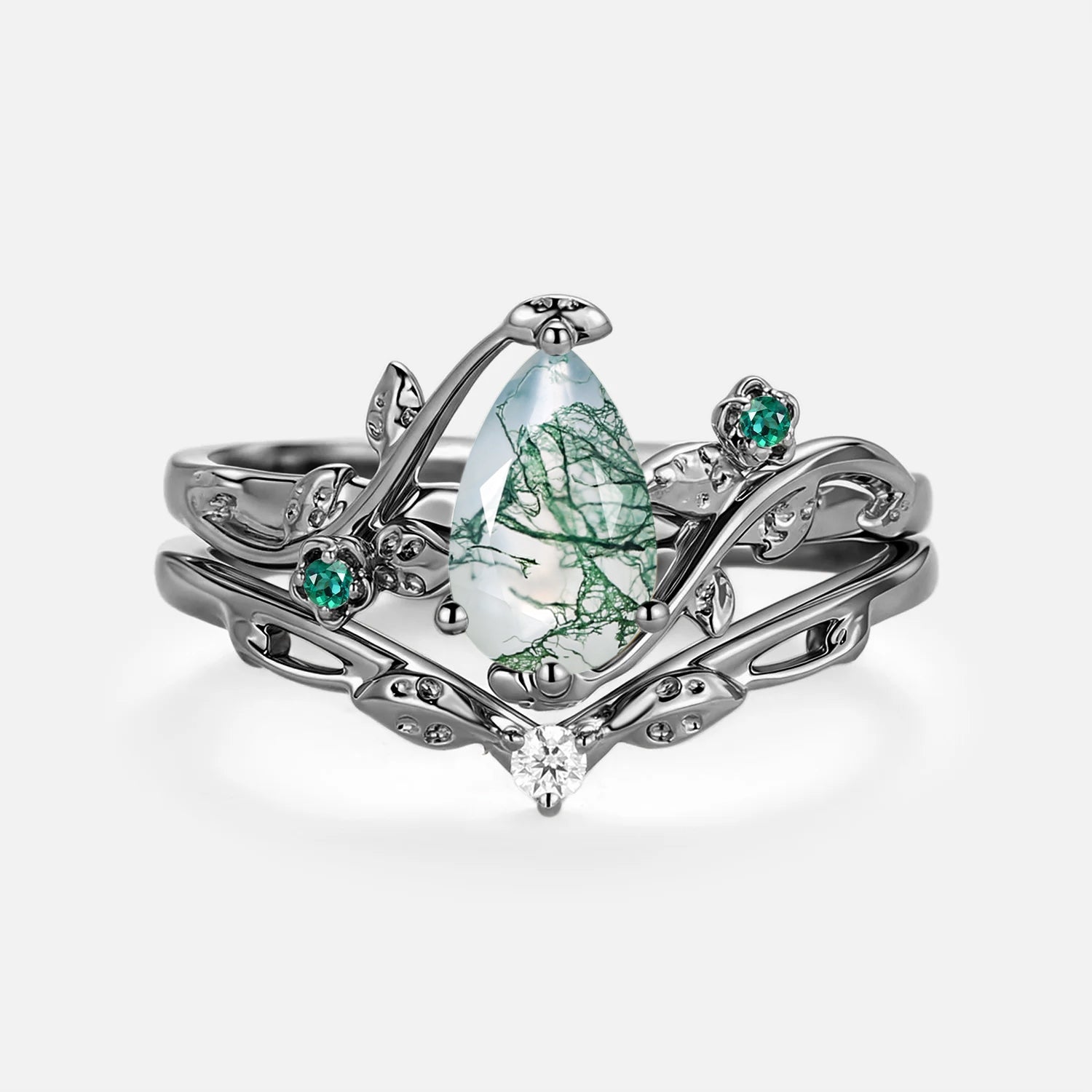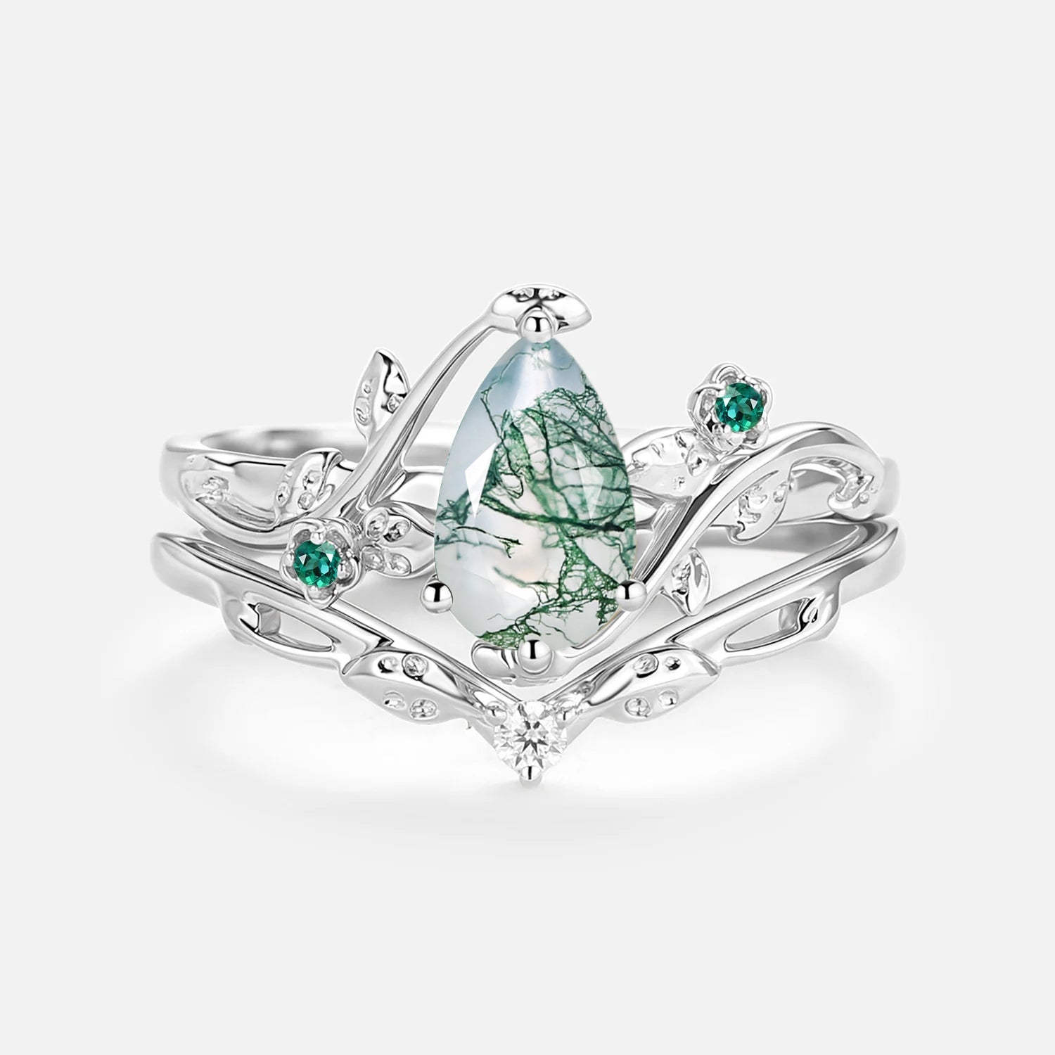 Leafy & Floral Pear Shaped Moss Agate Engagement Ring Sets 2pcs - Floret