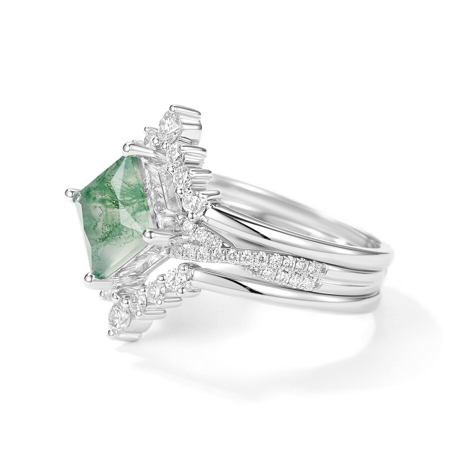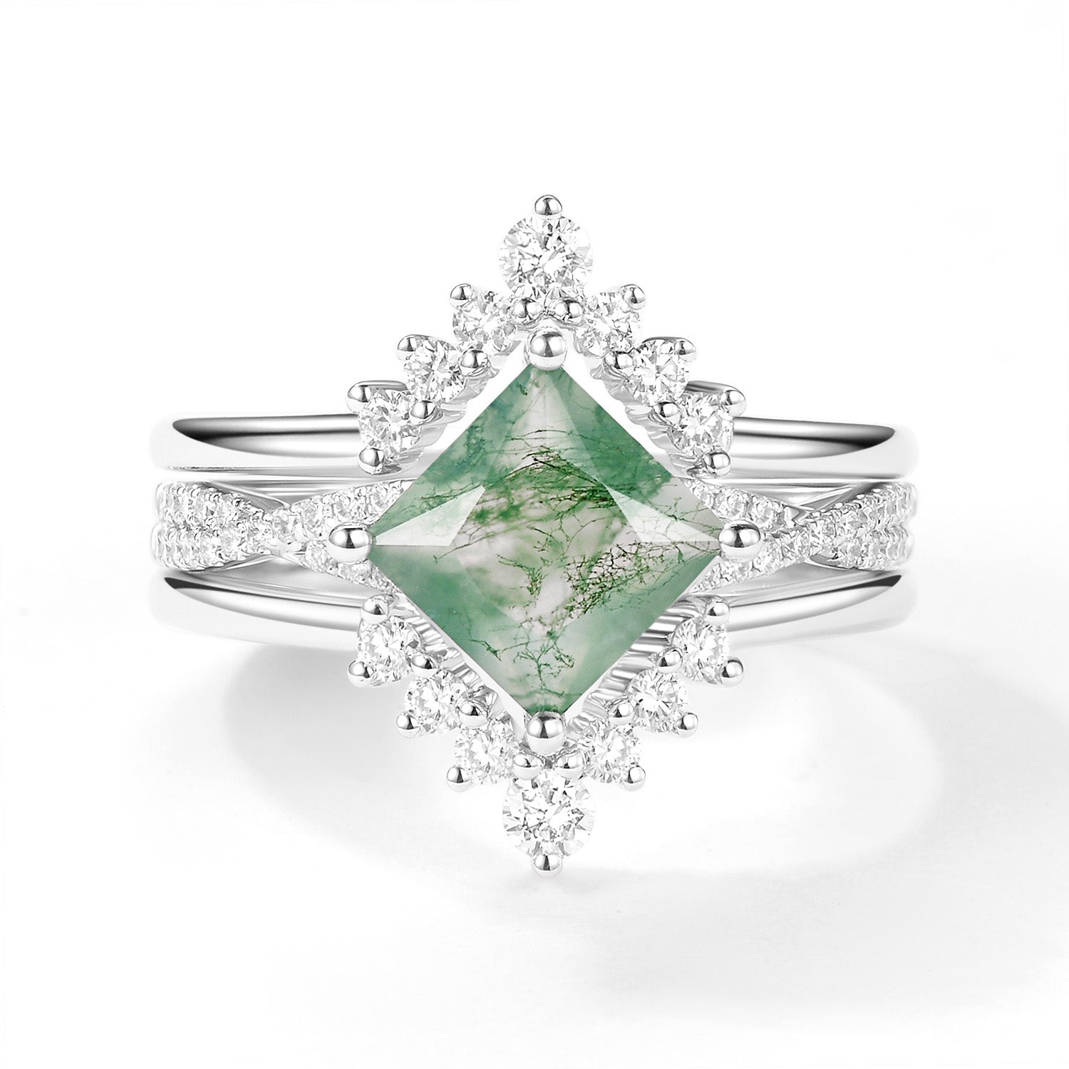 2.0ct Moss Agate Princess Cut Stacking Engagement Ring Set 3pcs