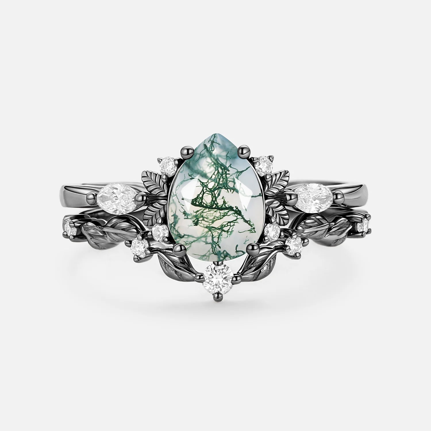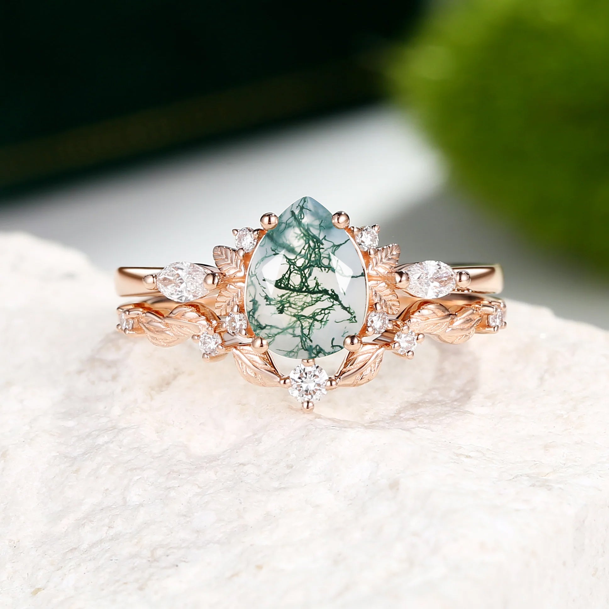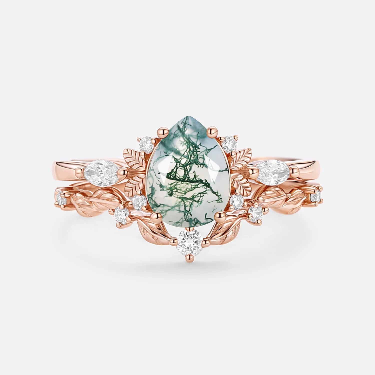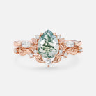 Nature Inspired - Pear Shaped Moss Agate Leafy Fairy Ring Set 2pcs - Susan