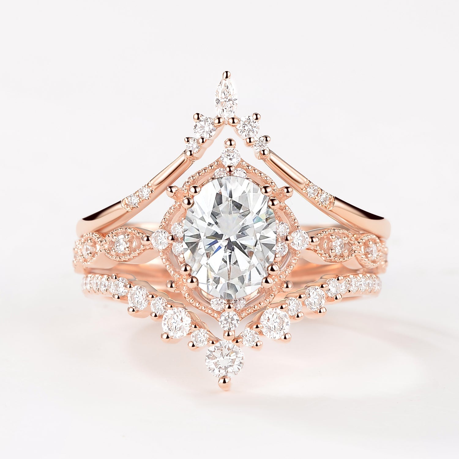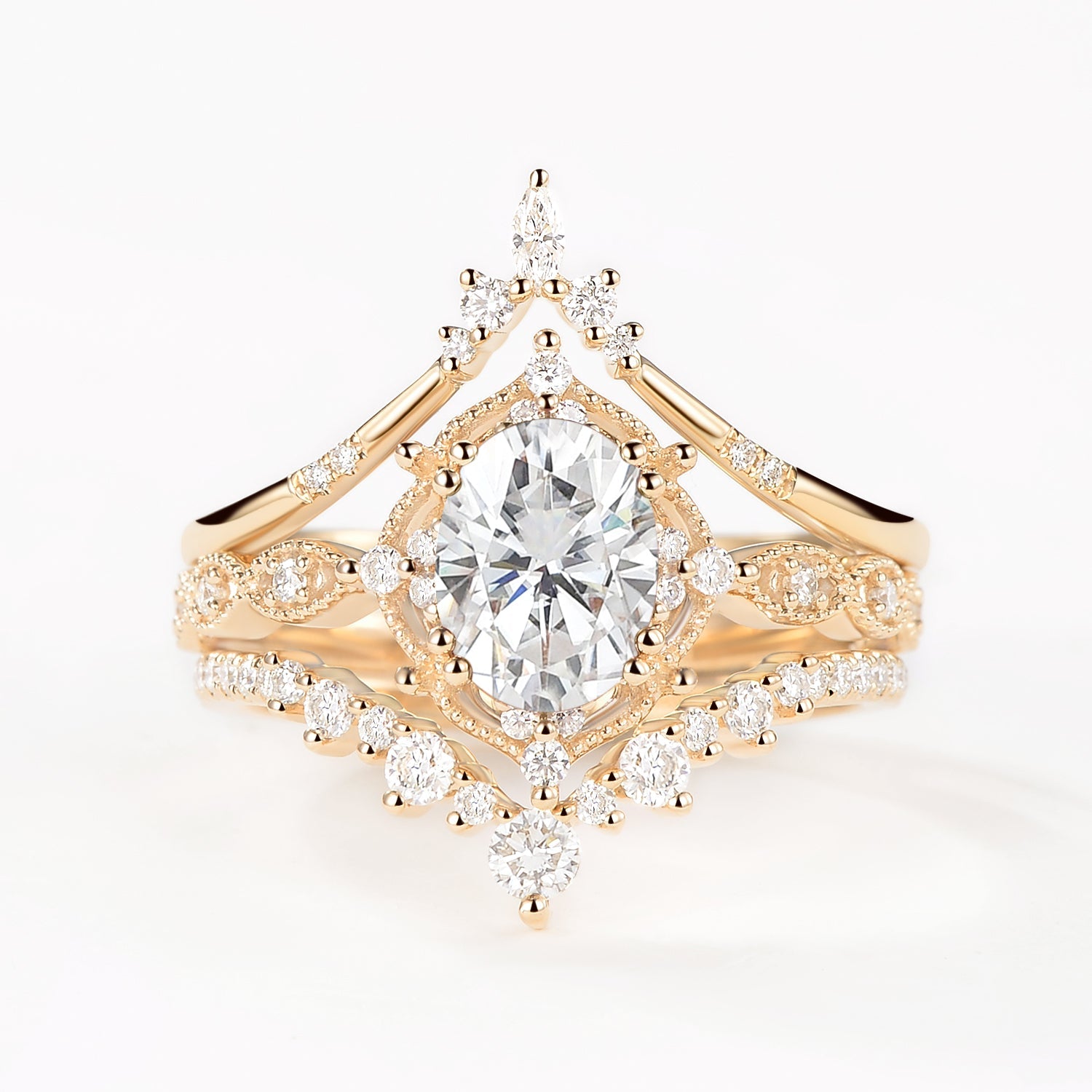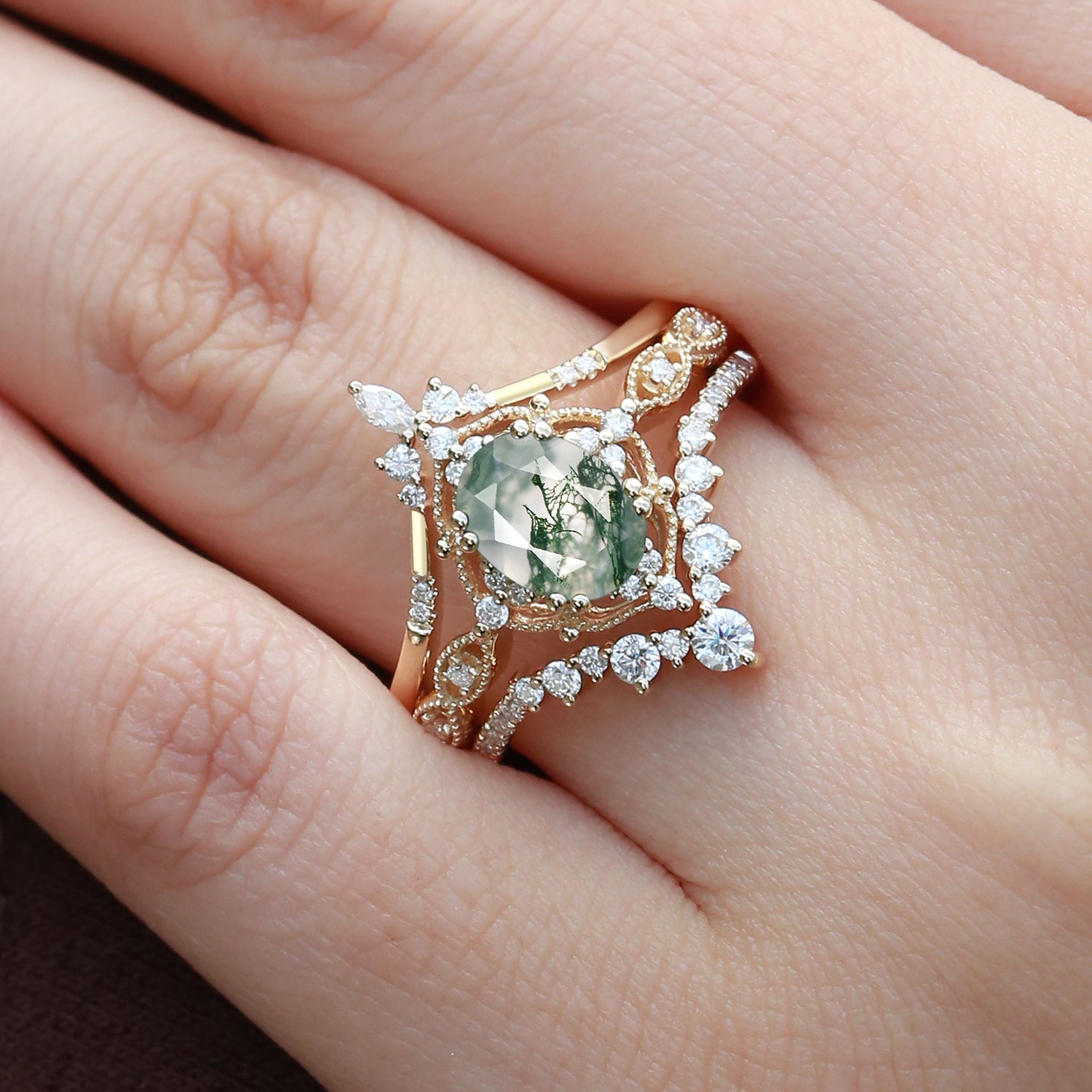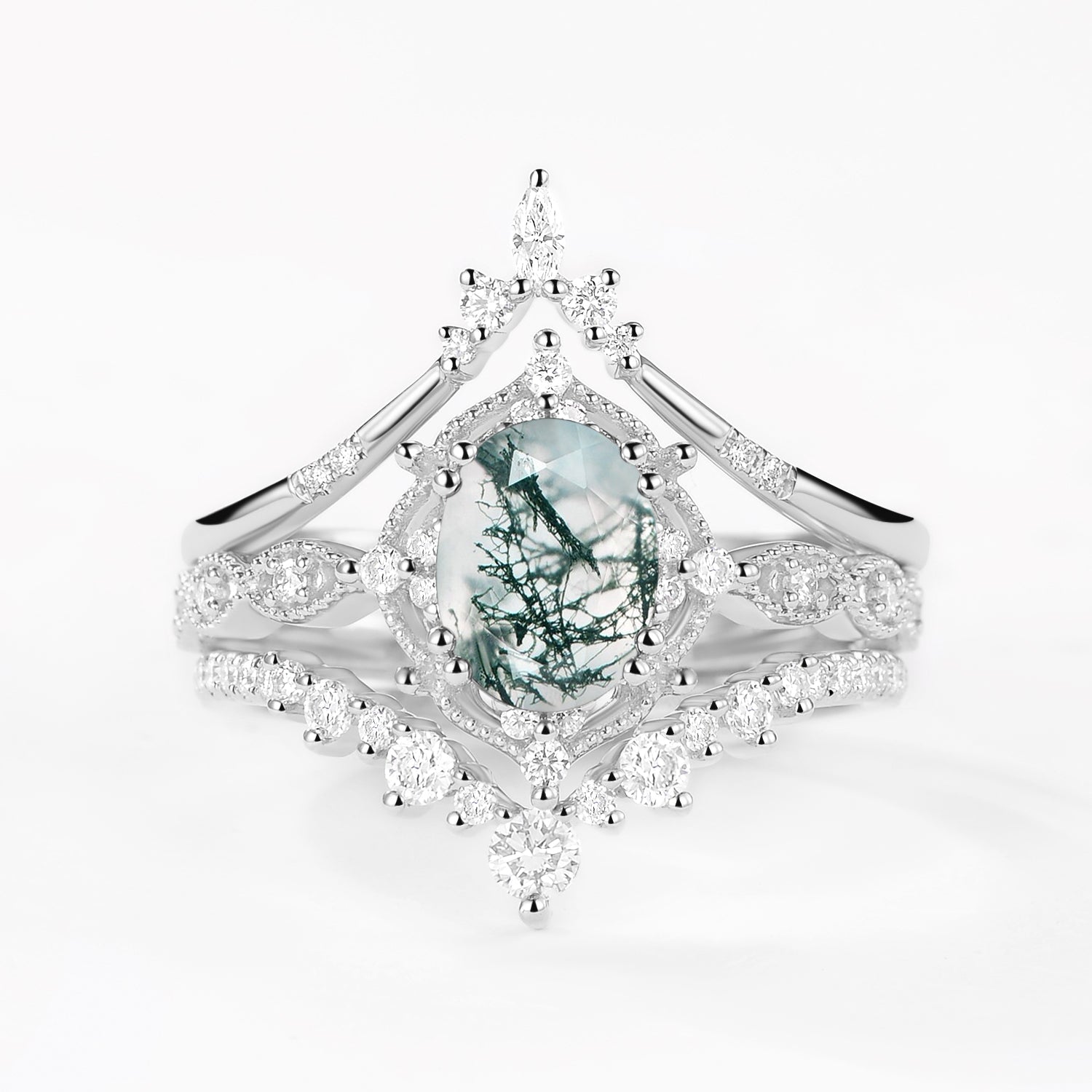 Oval Moss Agate Signature Vintage Ring Set 3pcs
