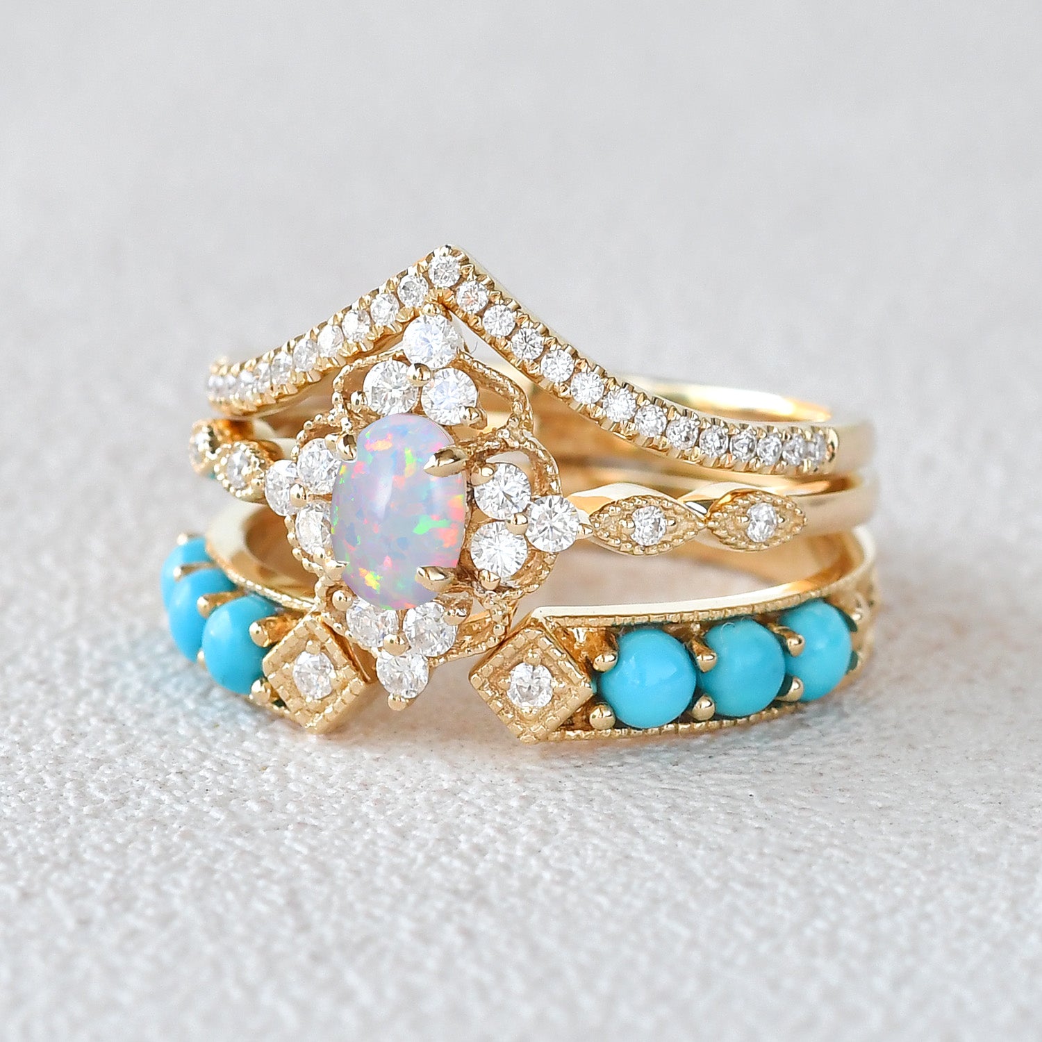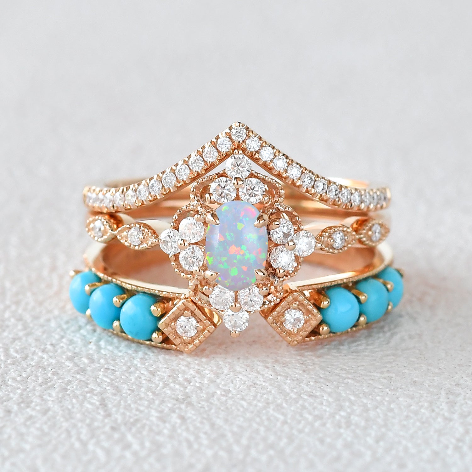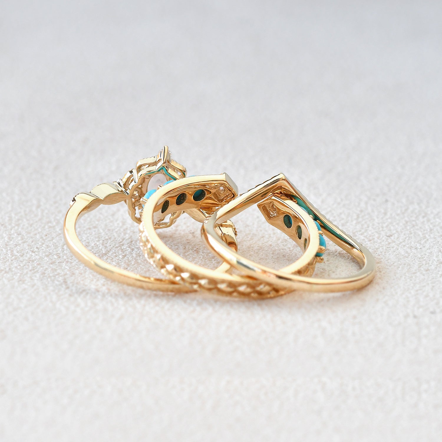 Oval Opal & Turquoise Vintage Gold Ring Set 3pcs