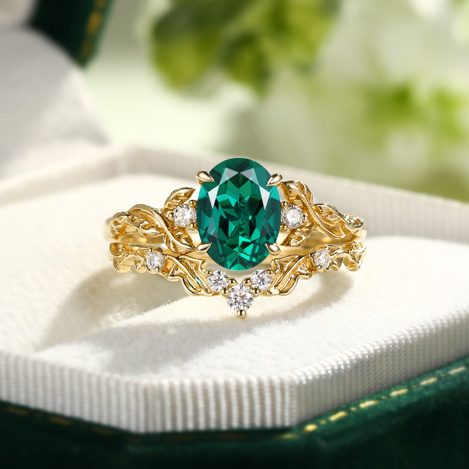 Oval Shaped Lab Emerald Leafy Engagement Ring Set 2pcs - Brook