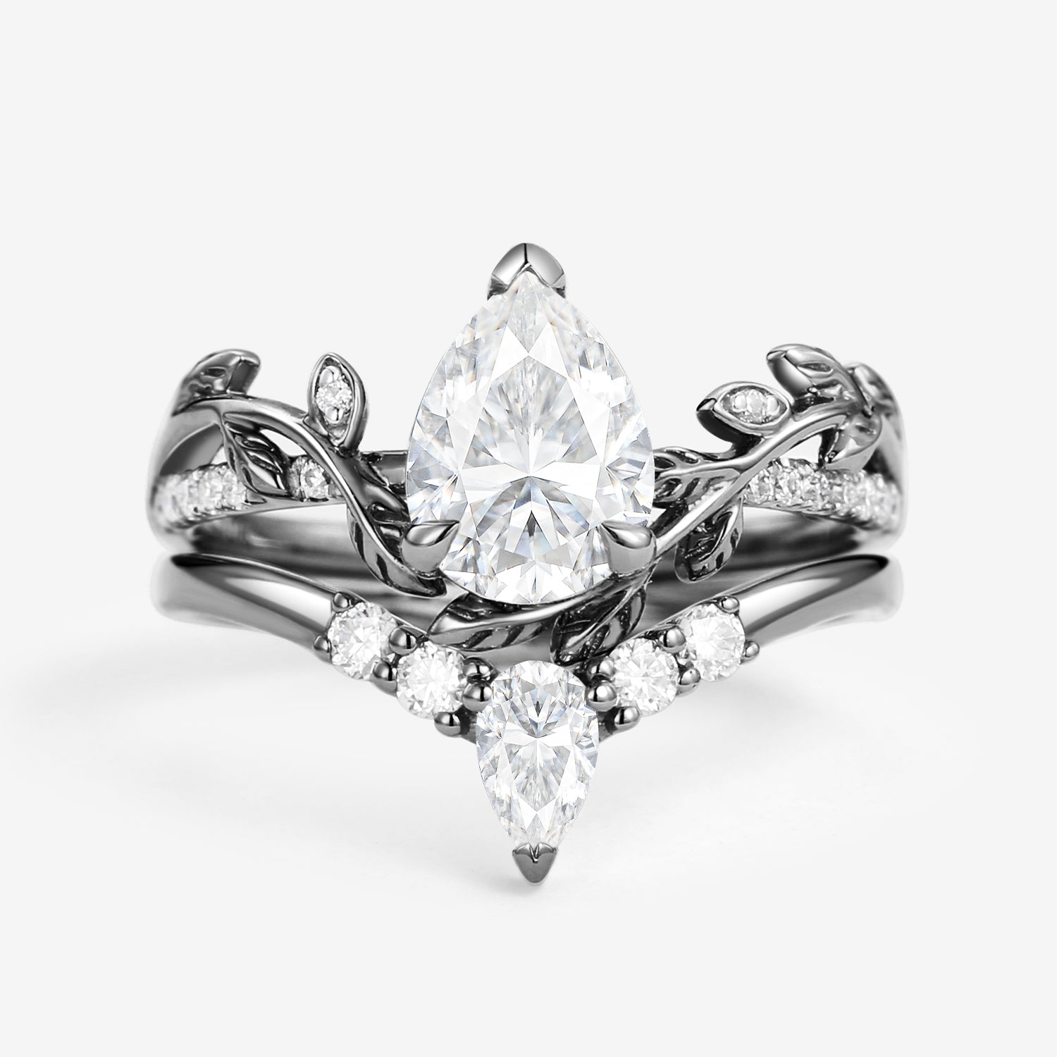 Pear Shaped Moss Agate & Moissanite Leafy Bridal Ring Set 2pcs