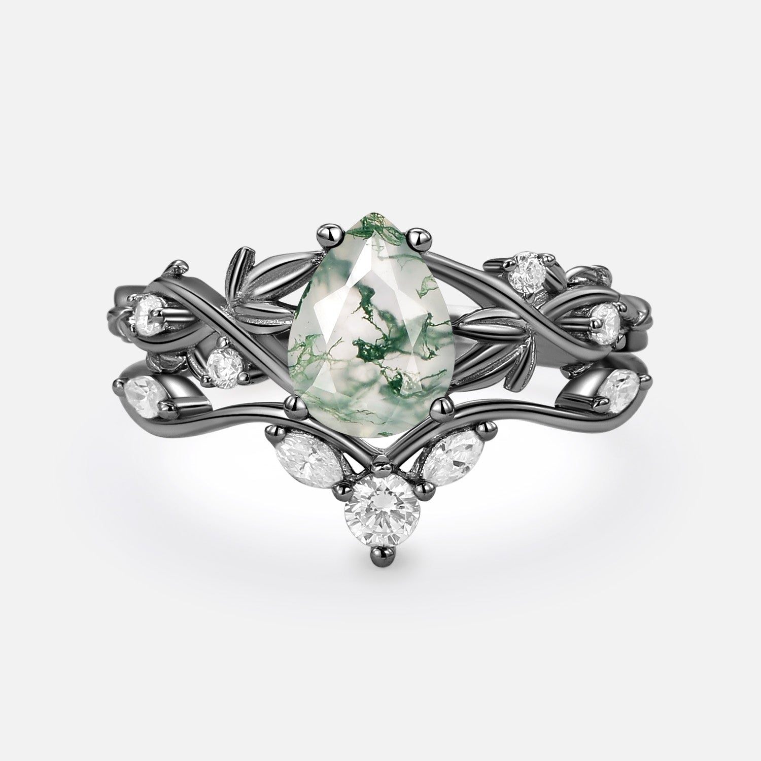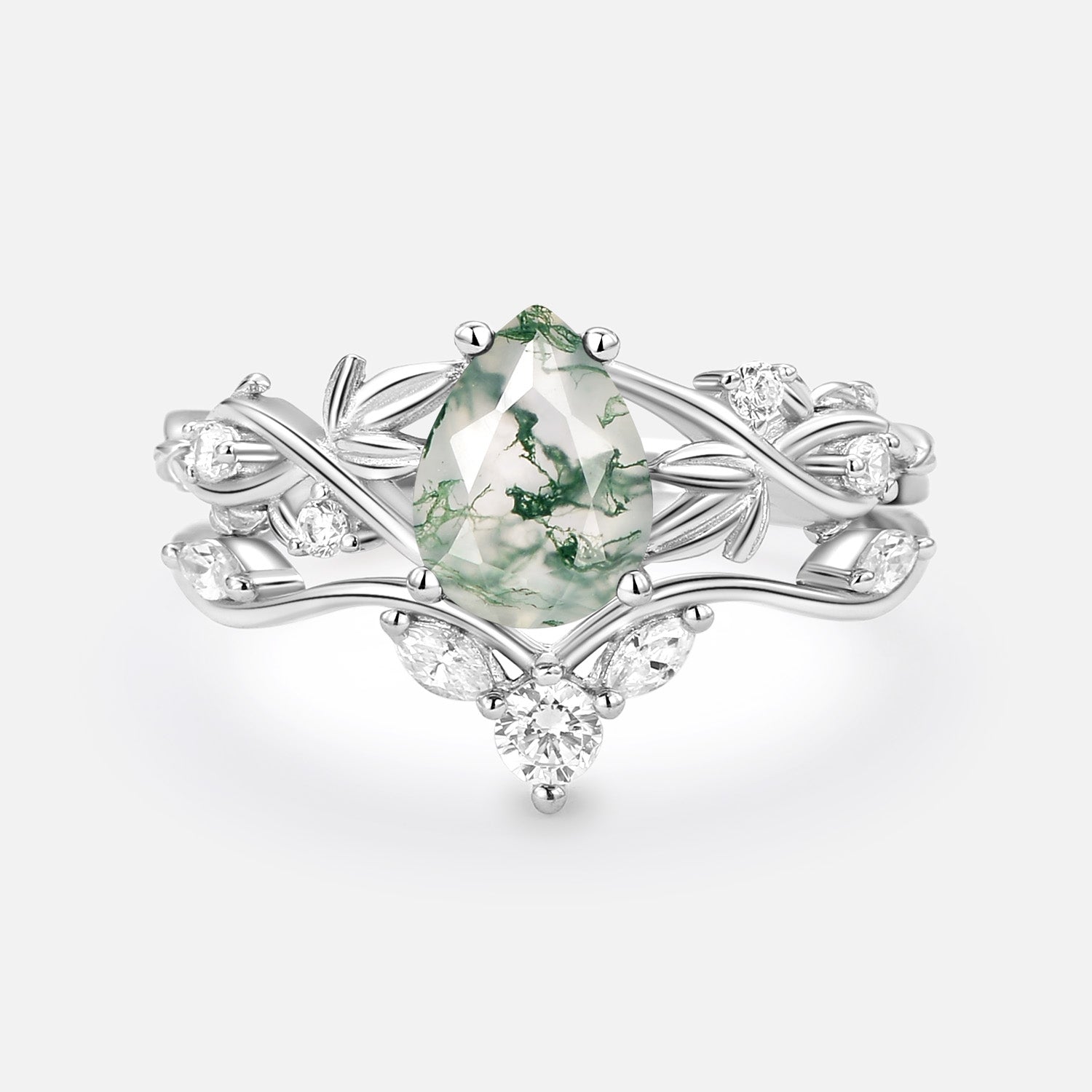 Pear Shaped Moss Agate Three Leaves Bridal Ring Set 2pcs