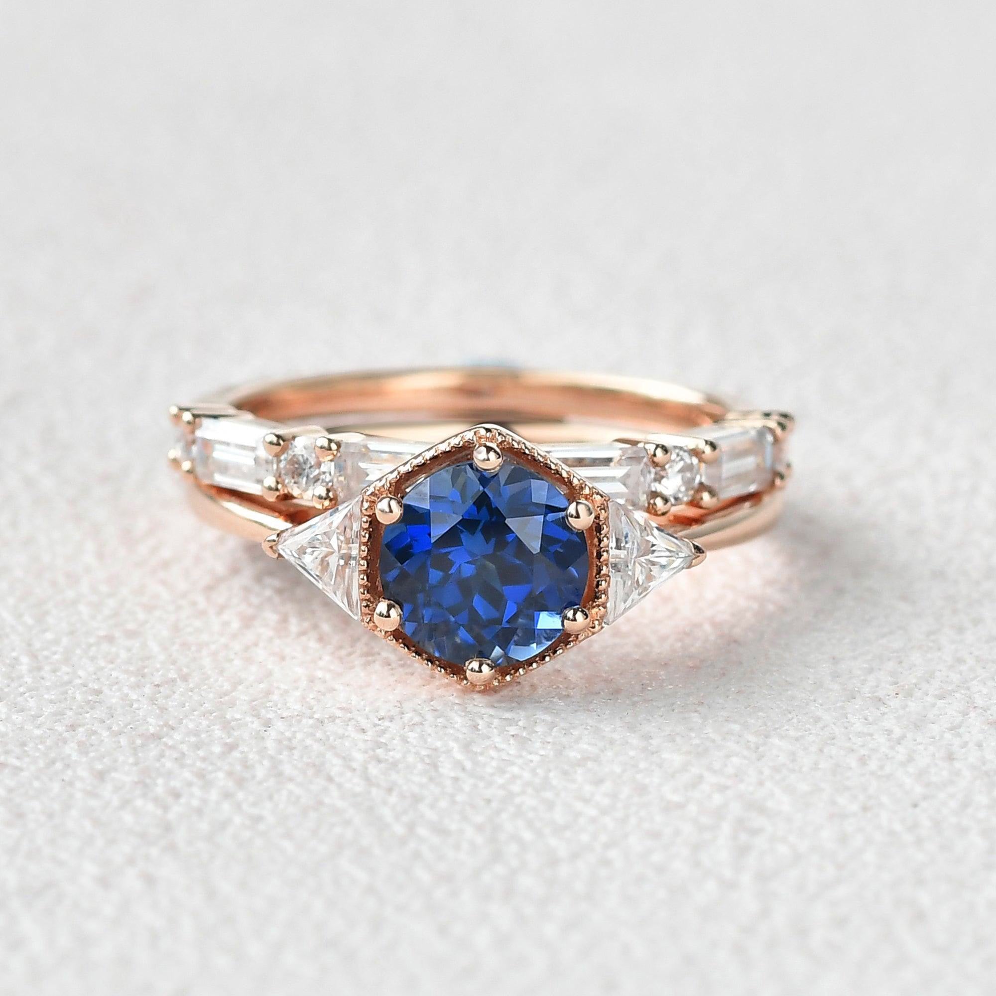 Felicegals Sapphire Engagement Ring Set 2pcs Antique Emerald Band Vintage Inspired Wedding Ring Moissanite Wedding Band Anniversary Gift for Her