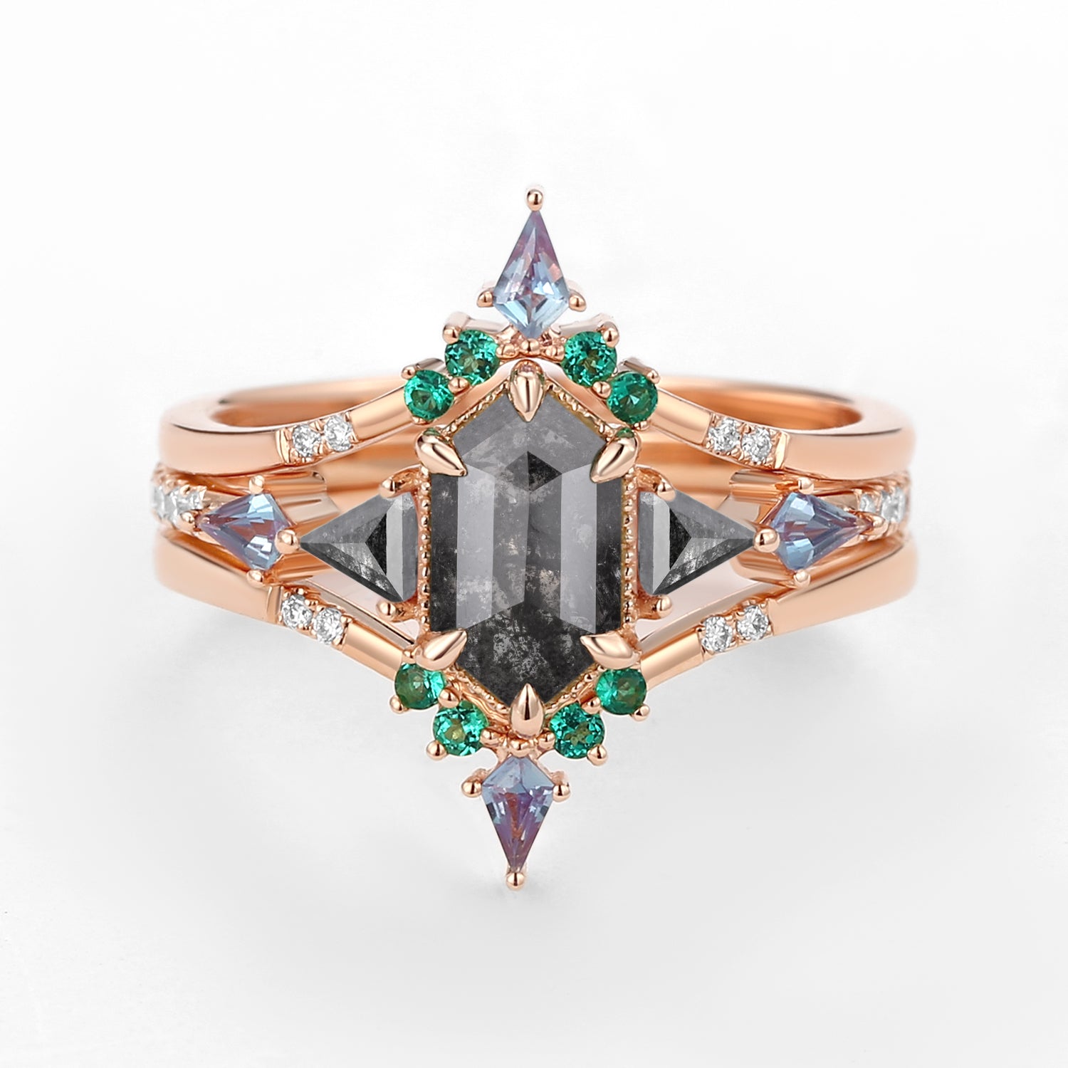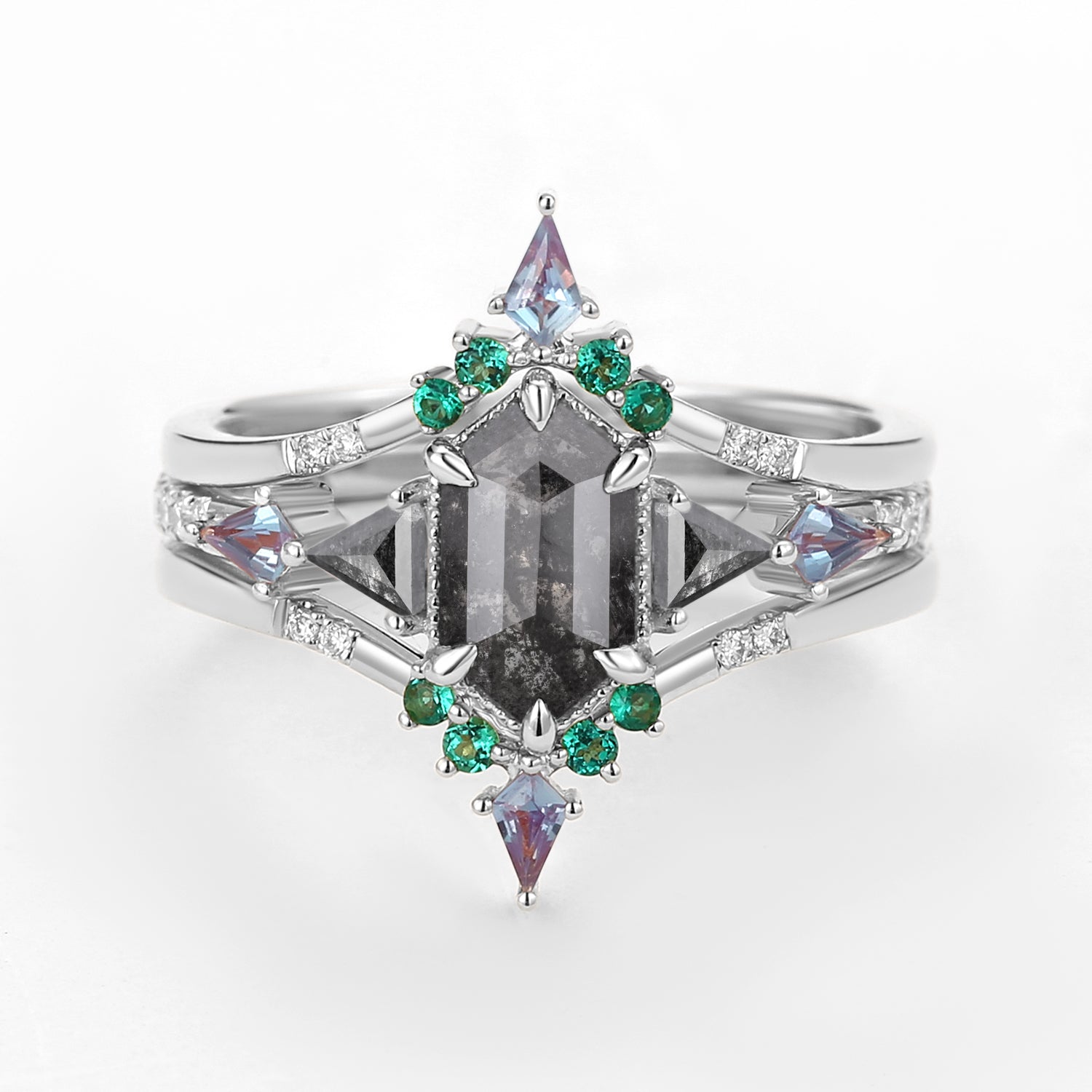 Black Gold Long Hexagon Salt and Pepper Diamond & Opal & Alexandrite & Emerald Engagement Ring Set 3pcs - Max