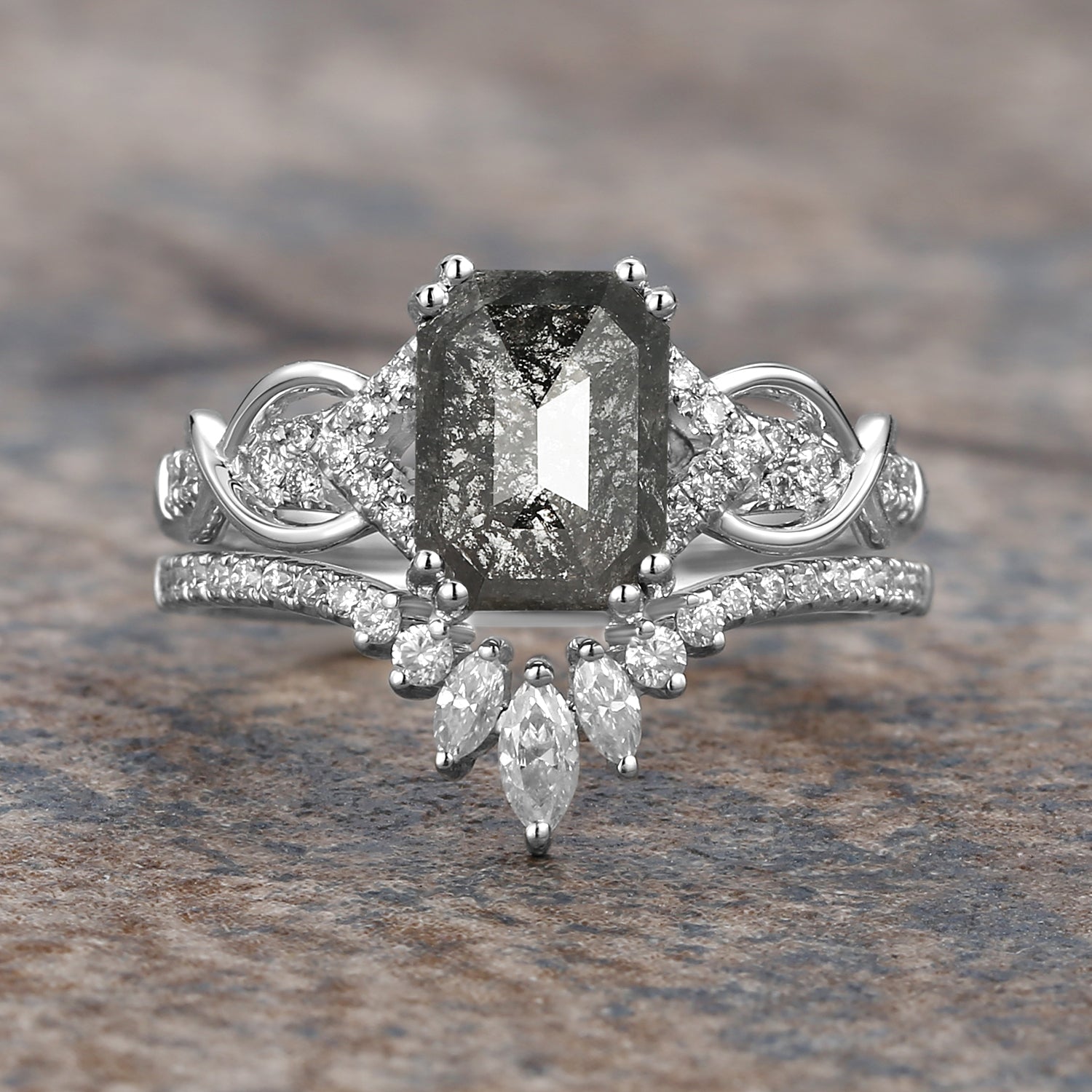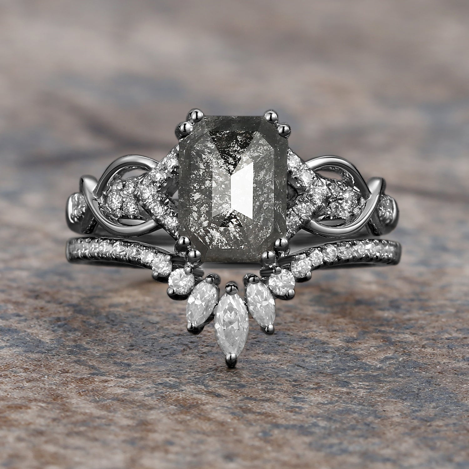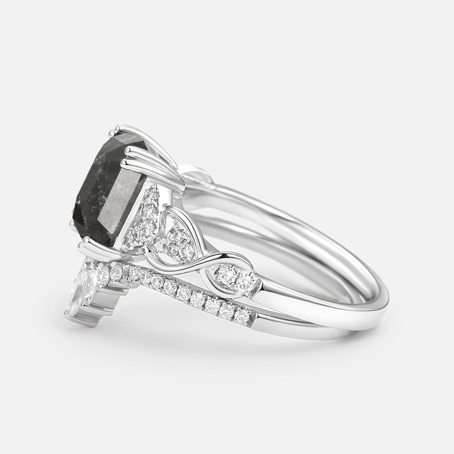 Cushion Cut Salt and Pepper Diamonds Infinity Gold Ring Set 2pcs