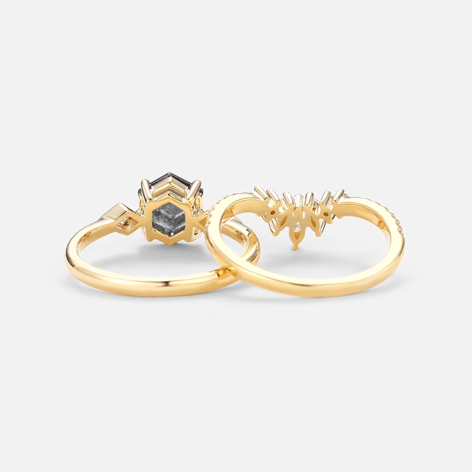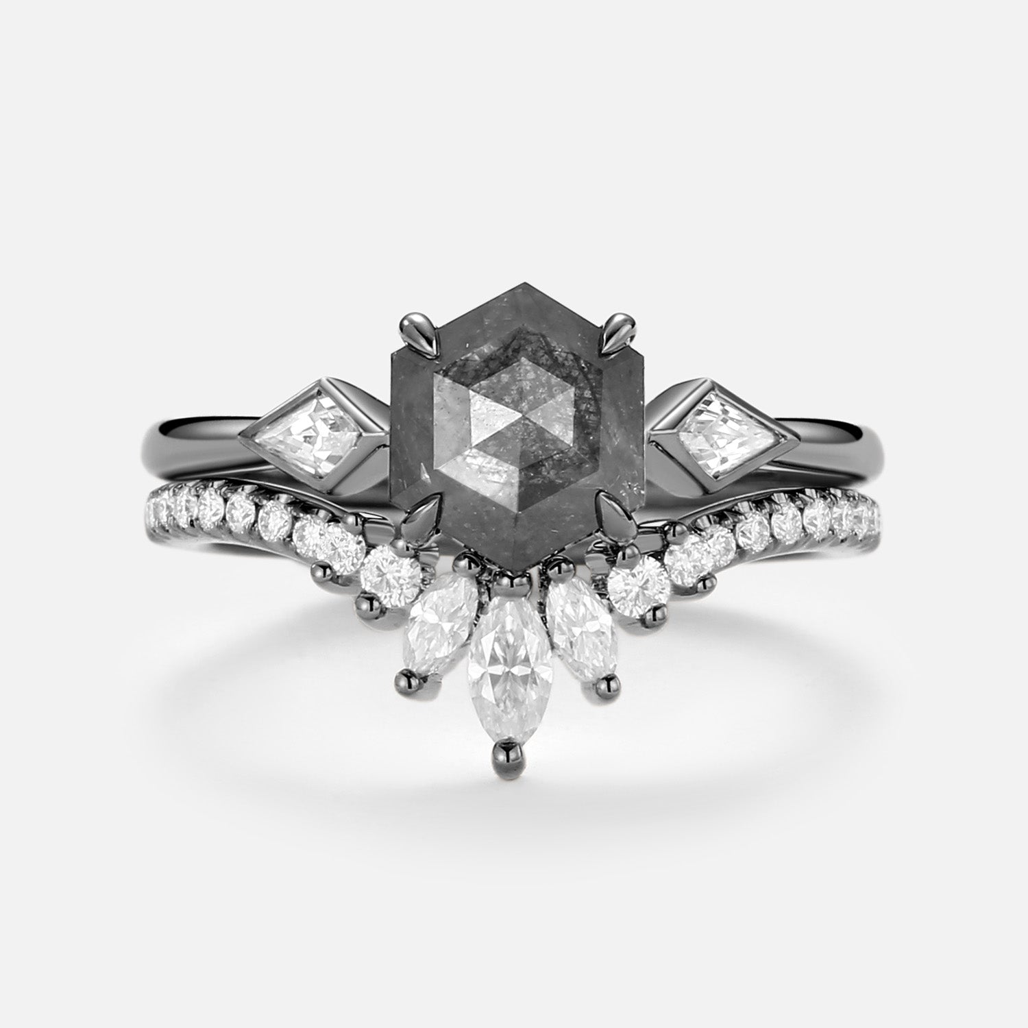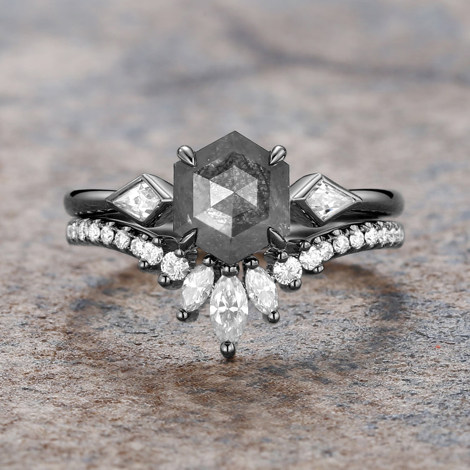 Hexagon Salt and Pepper Diamonds Three Stone Engagement Ring Set 2pcs Bridal Ring Set Anniversary Gift