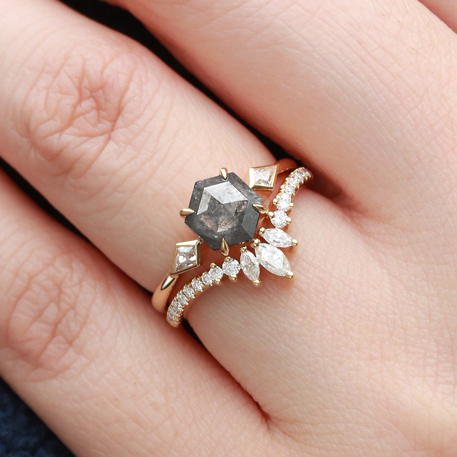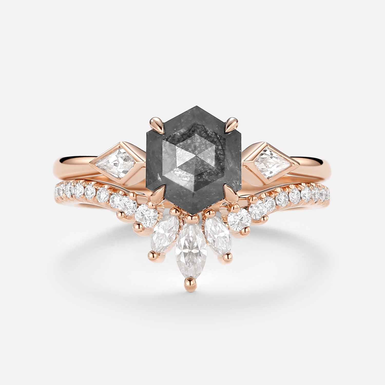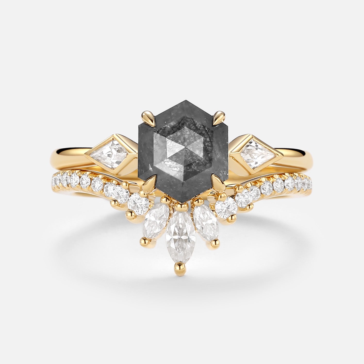 Hexagon Salt and Pepper Diamonds Three Stone Engagement Ring Set 2pcs Bridal Ring Set Anniversary Gift