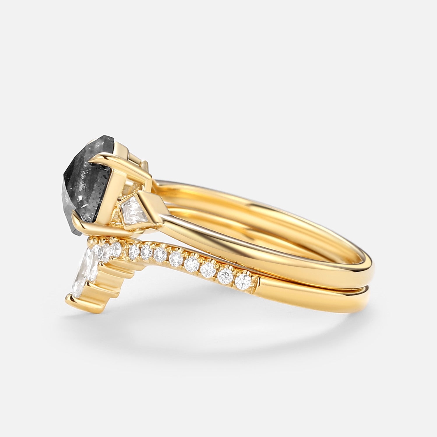 Hexagon Salt and Pepper Diamonds Three Stone Engagement Ring Set 2pcs - Noir