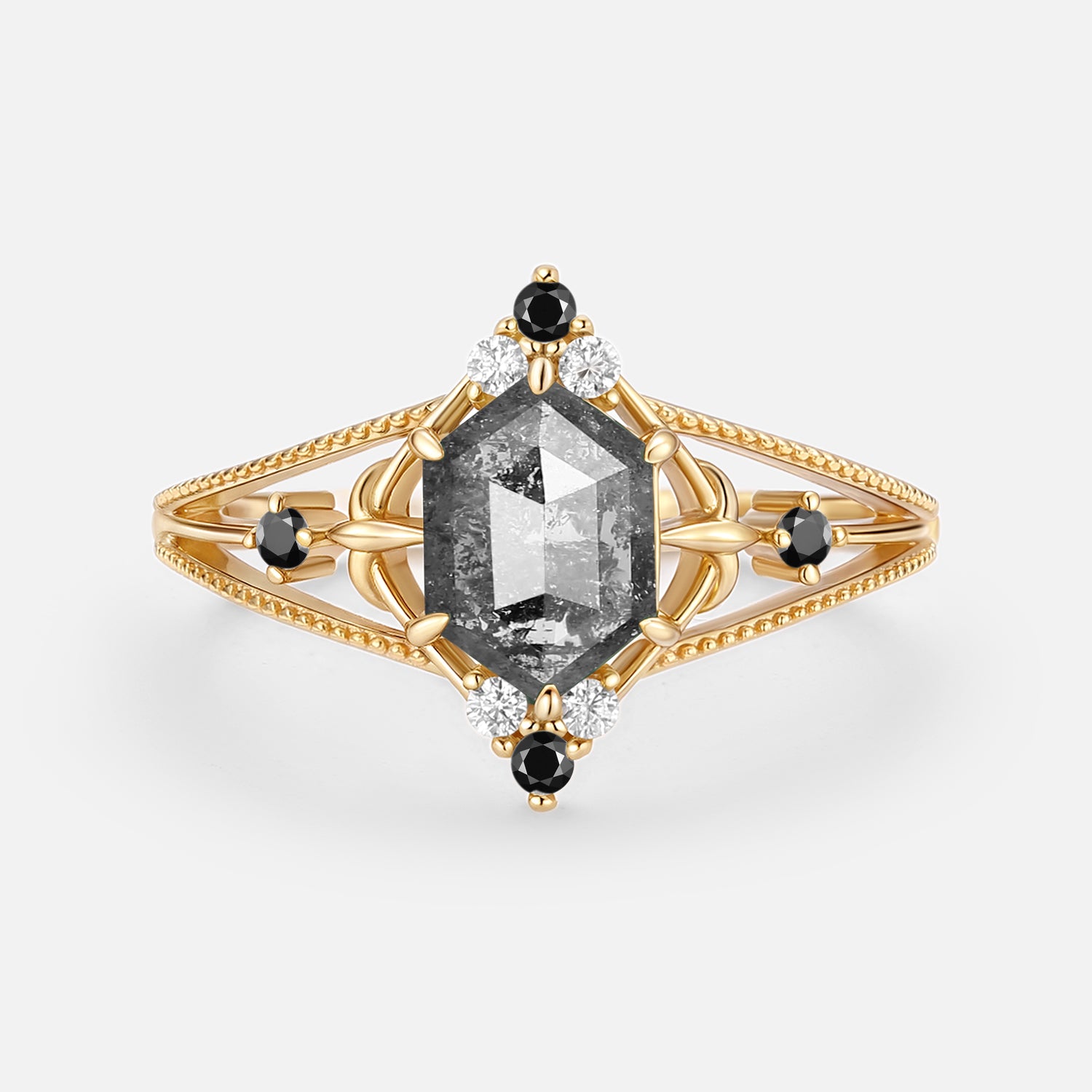 Hexagon Salt and Pepper Diamonds Unique Engagement Ring - Erebus