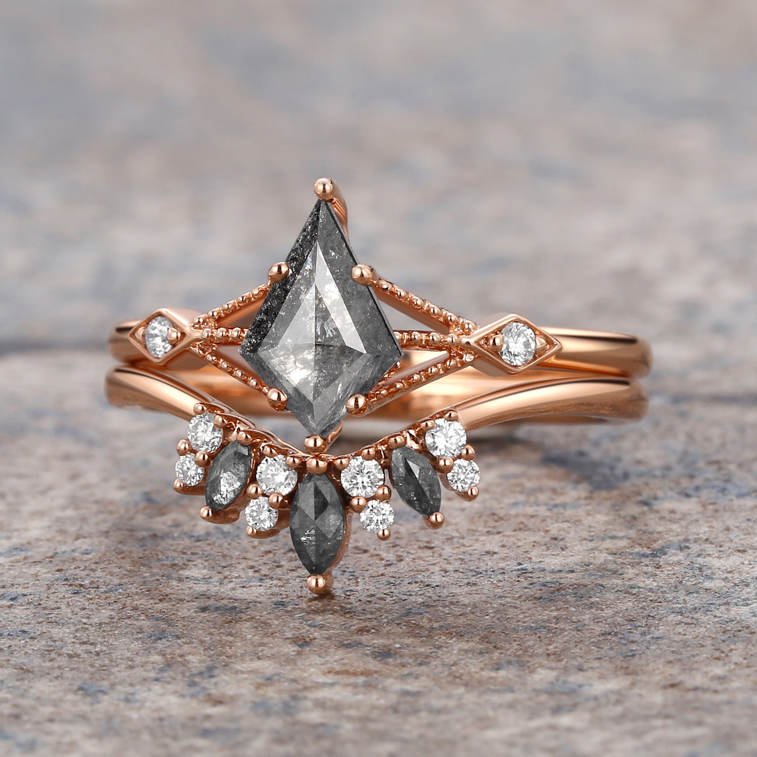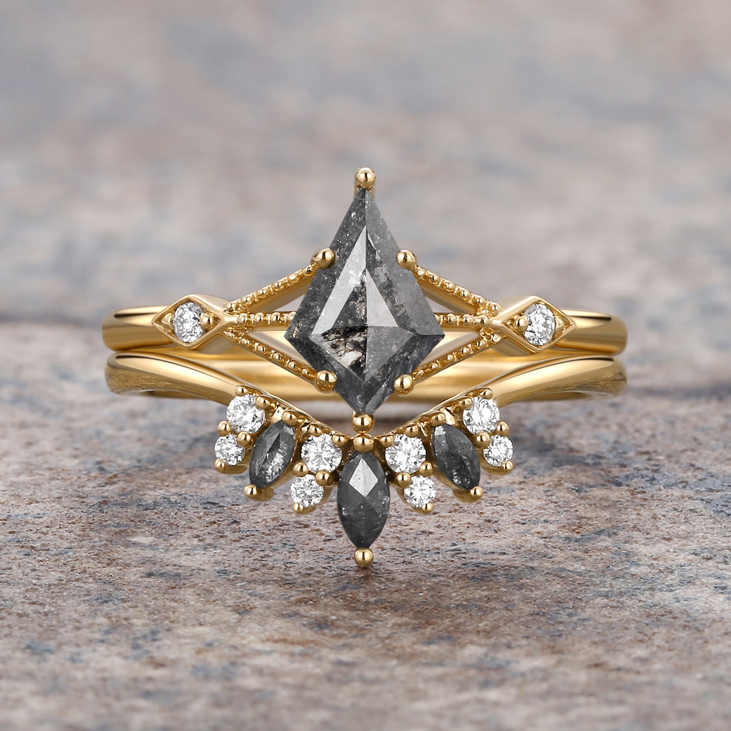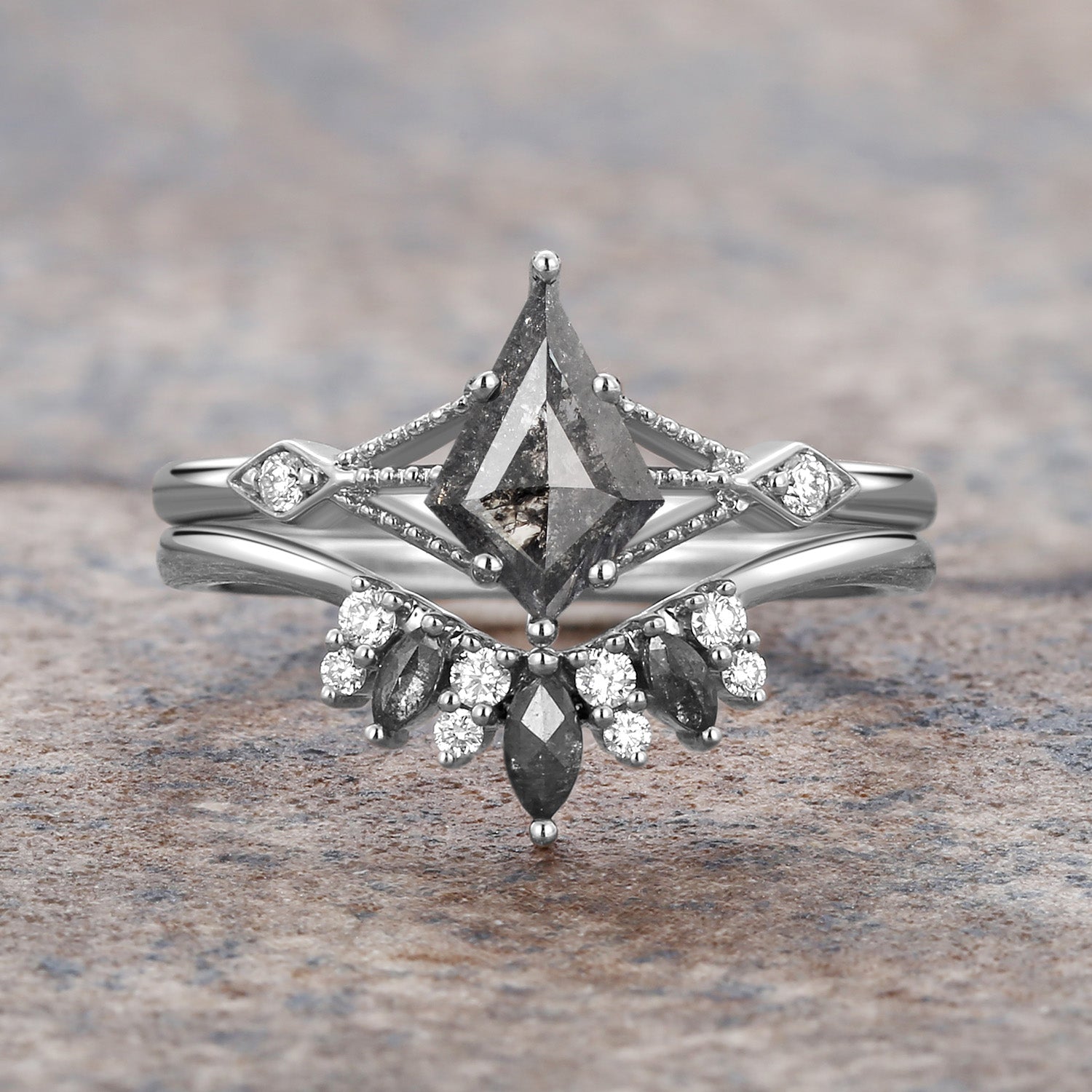 Felicegals Kite Salt and Pepper Diamonds Engagement Ring Set 2pcs Natural Diamond Ring Set Salt and Pepper Engagement Unique Kite Ring Spookier Vibe Bridal Set
