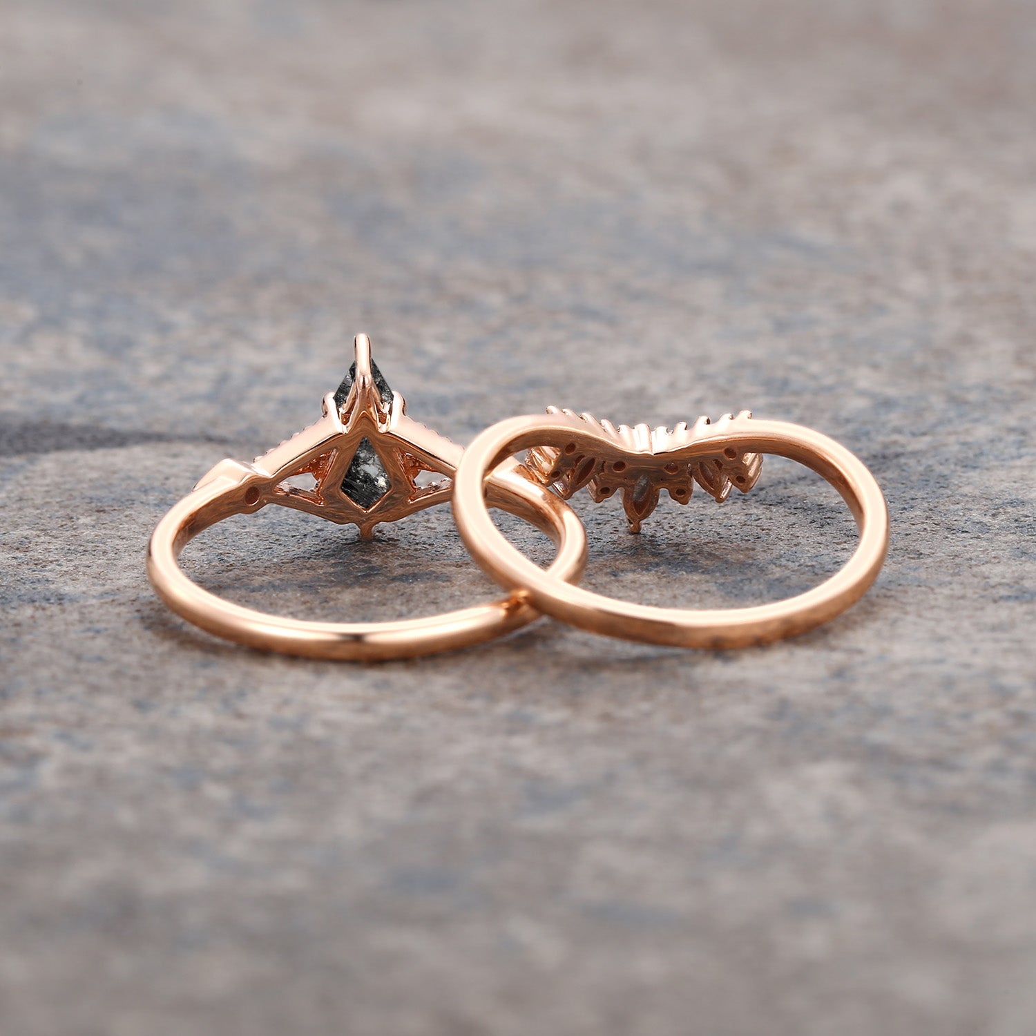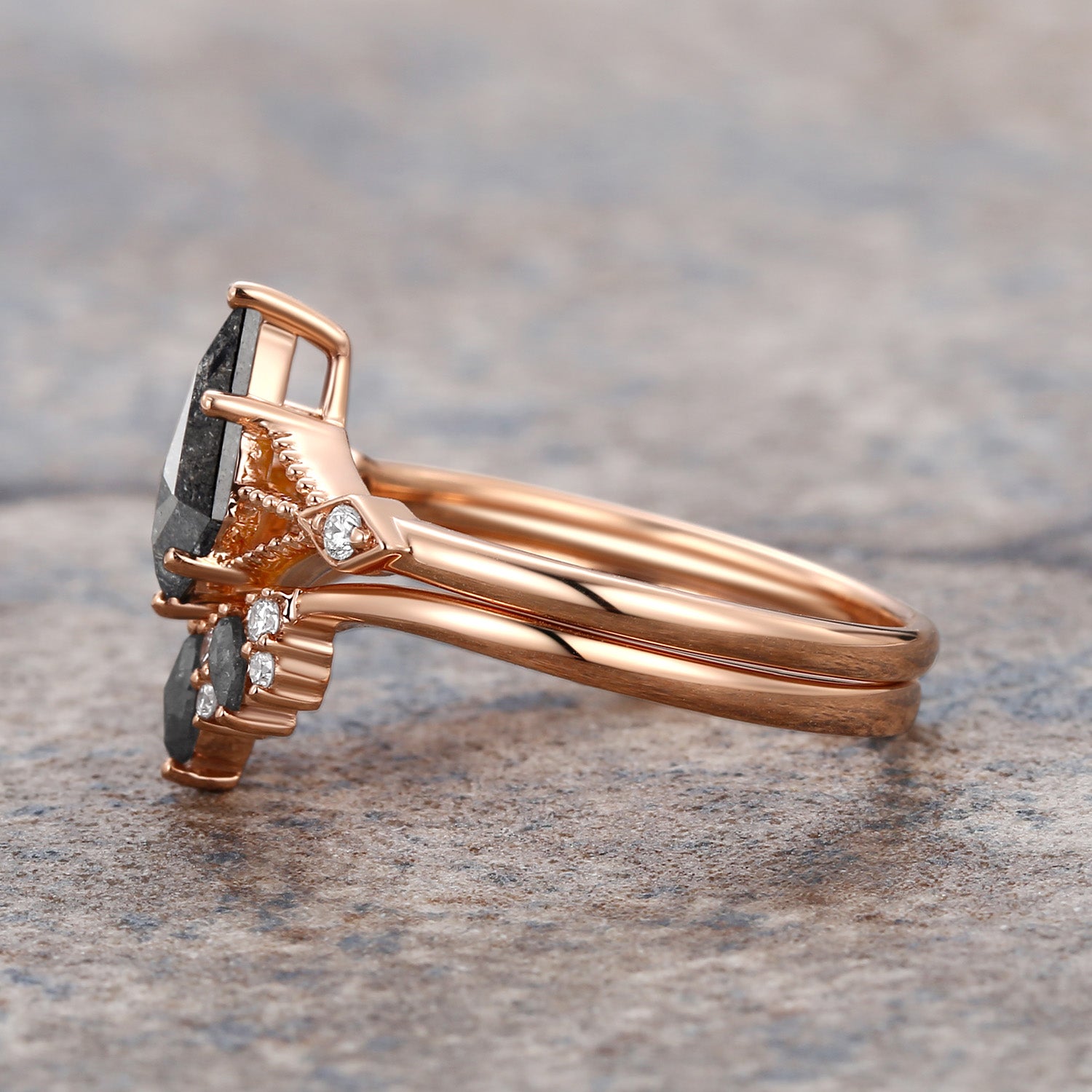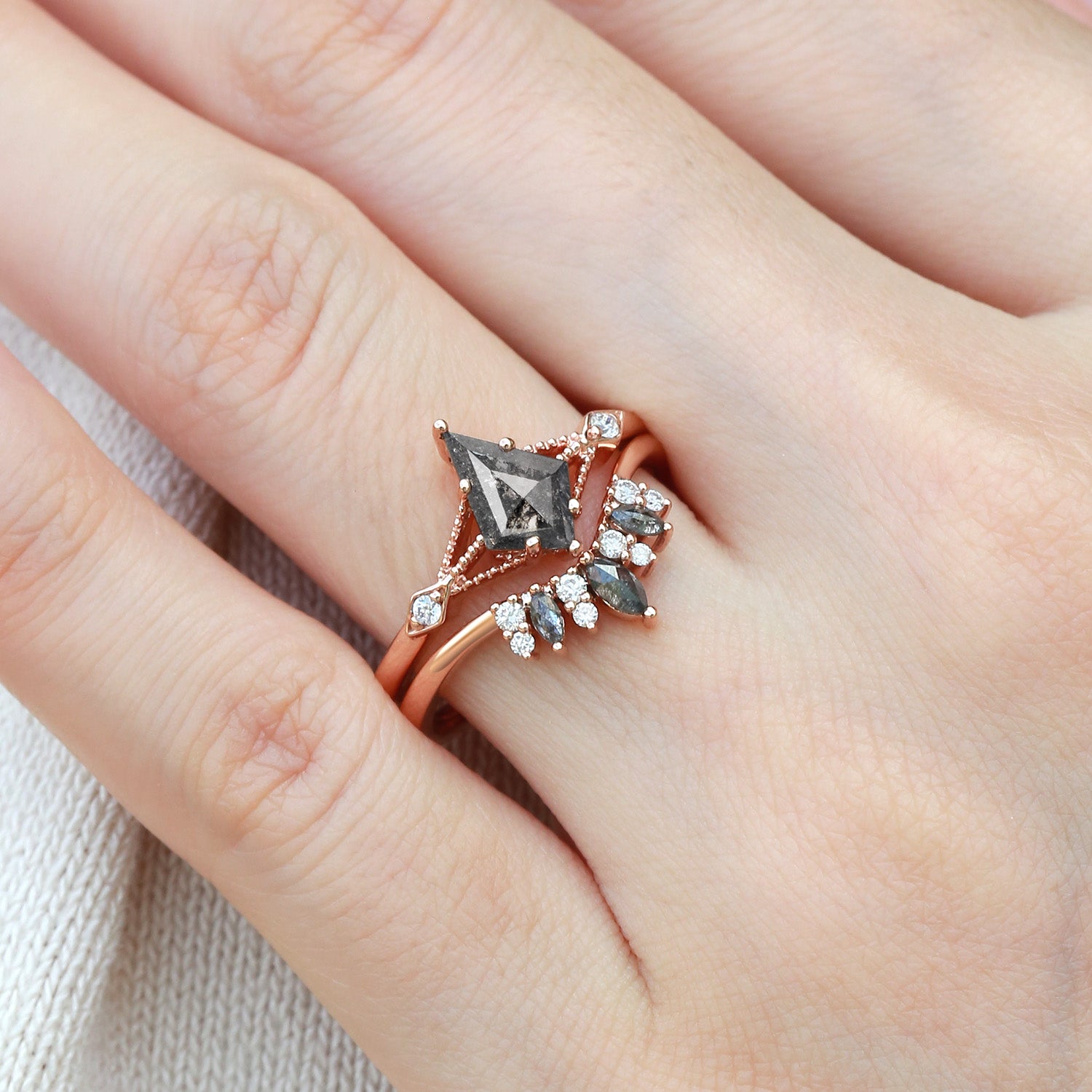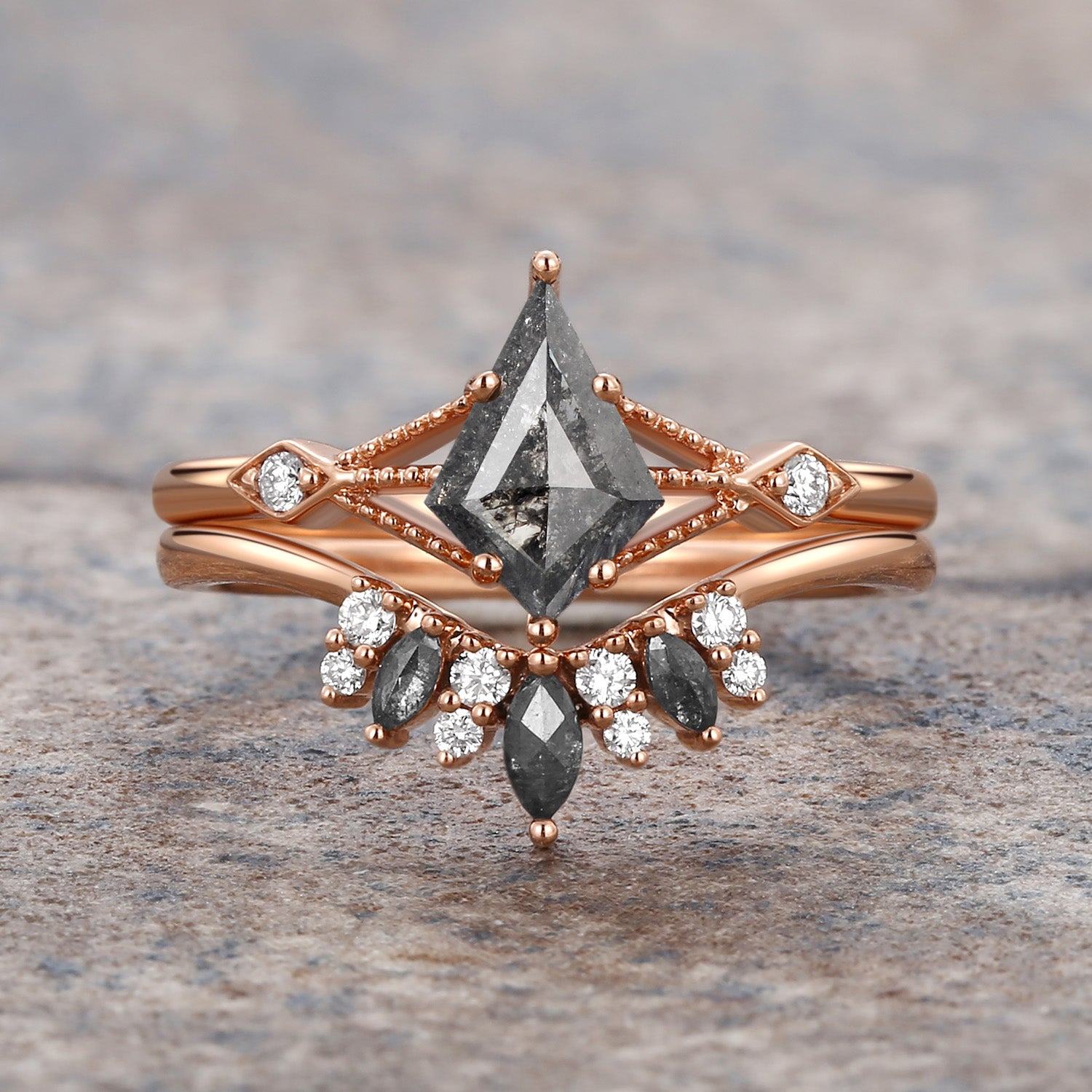 Felicegals Kite Salt and Pepper Diamonds Engagement Ring Set 2pcs Natural Diamond Ring Set Salt and Pepper Engagement Unique Kite Ring Spookier Vibe Bridal Set