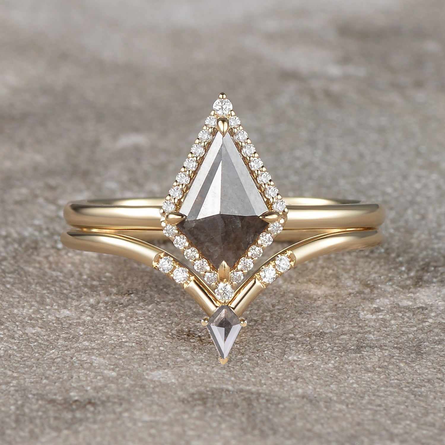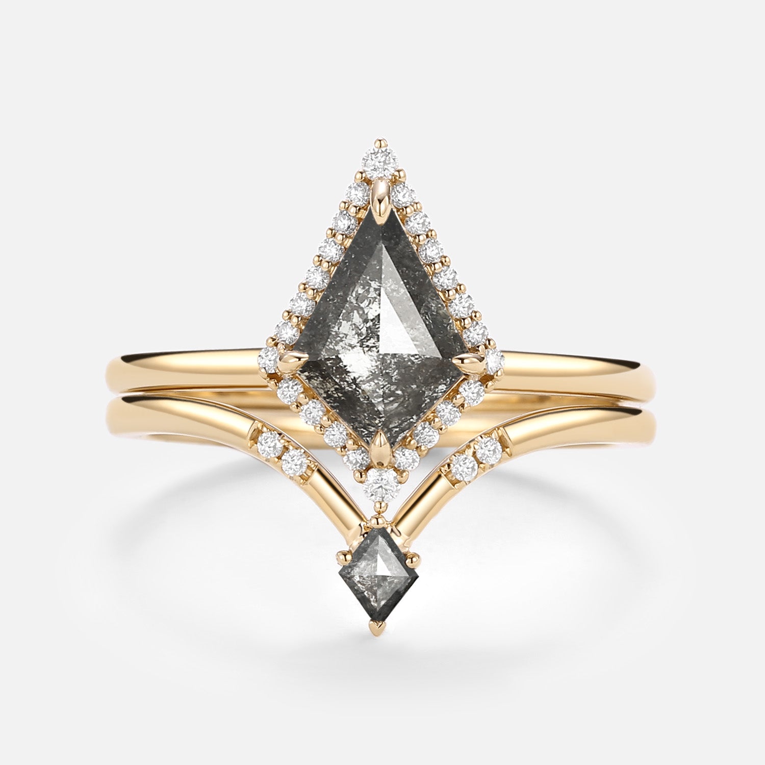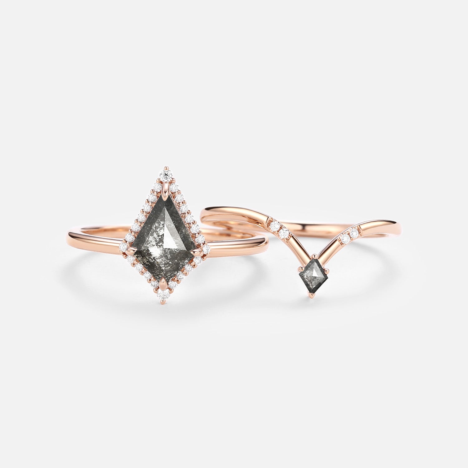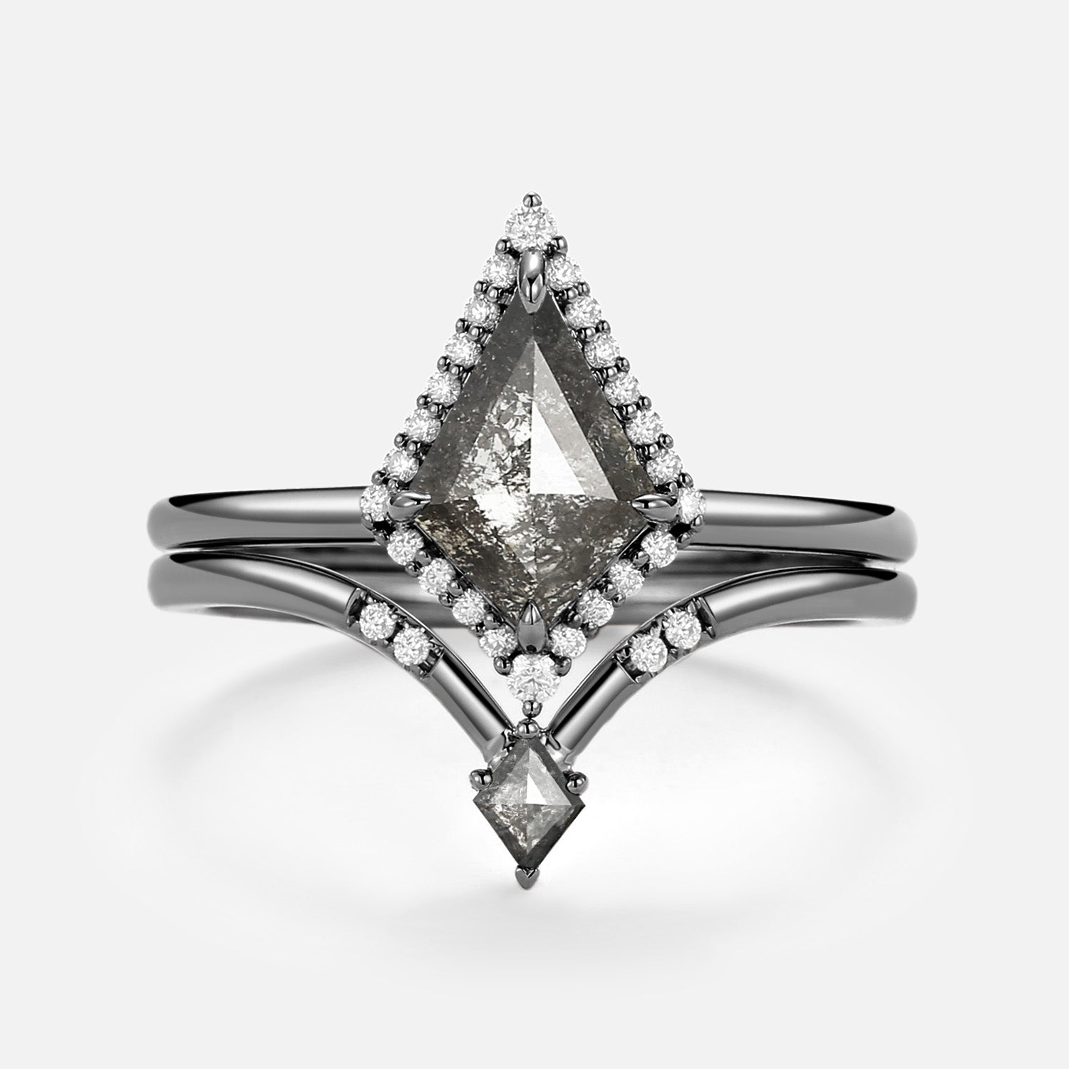 Kite Salt and Pepper Diamonds Stacking Engagement Ring Set 2pcs Kite Bridal Ring Set Anniversary Gift